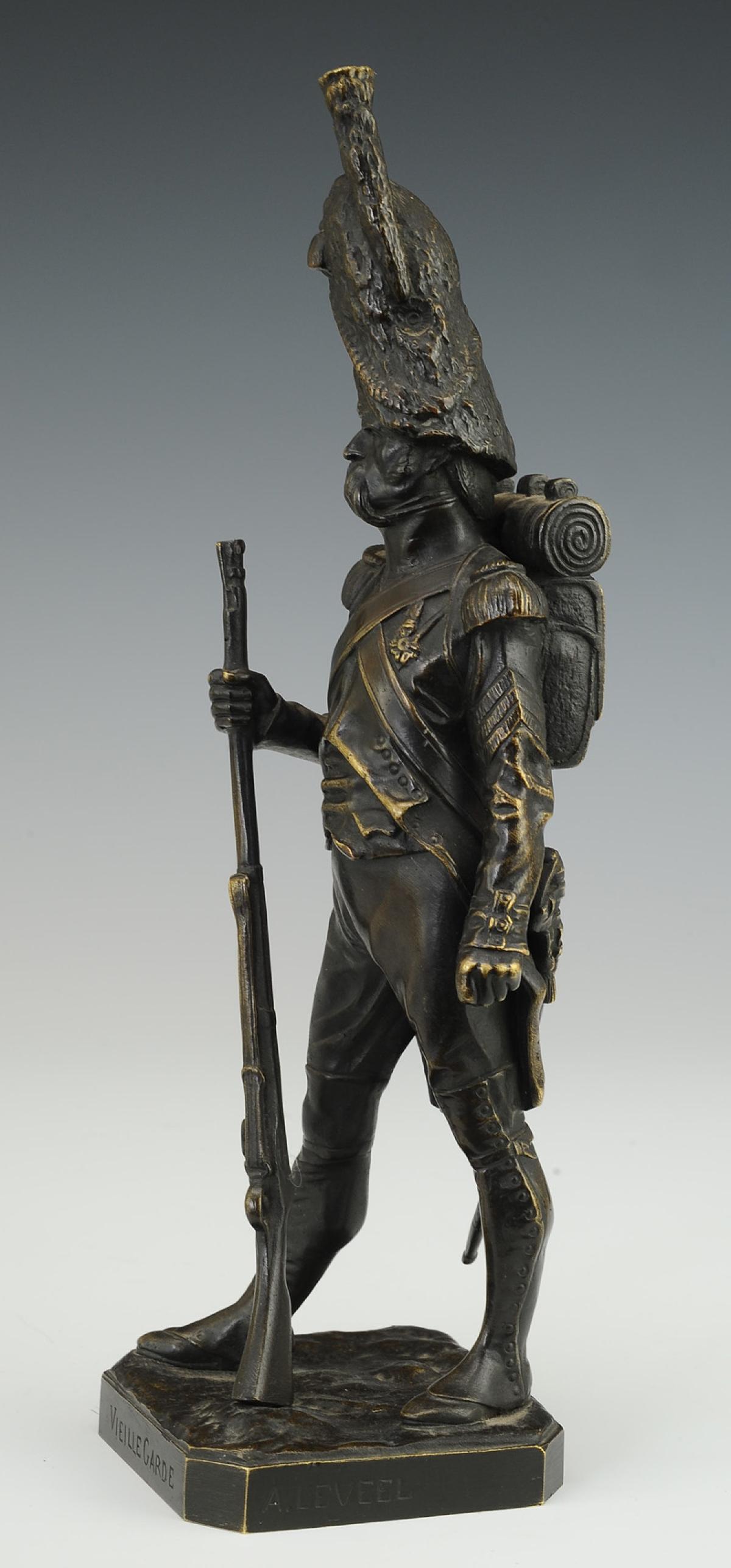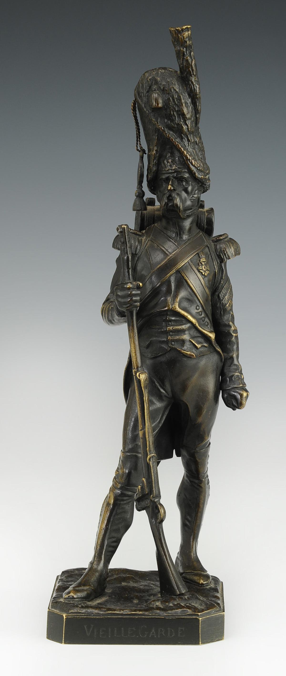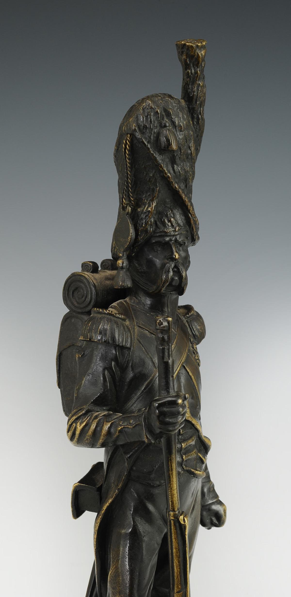 Ces petites sculptures représentants des soldats du Premier et du Second Empire ont eu beaucoup de succès tout au long du 19ème siècle et jusqu’à la Première Guerre Mondiale, le sentiment national étant alors très fort. Ce briscard de la Vieille Garde, à l’épaisse moustache, aux traits burinés et au regard décidé arborant sa Légion d’honneur gagnée dans le sang et la poussière des champs de bataille, est campé fièrement sur ses deux jambes dans une attitude qui évoque le mouvement et l’engagement.