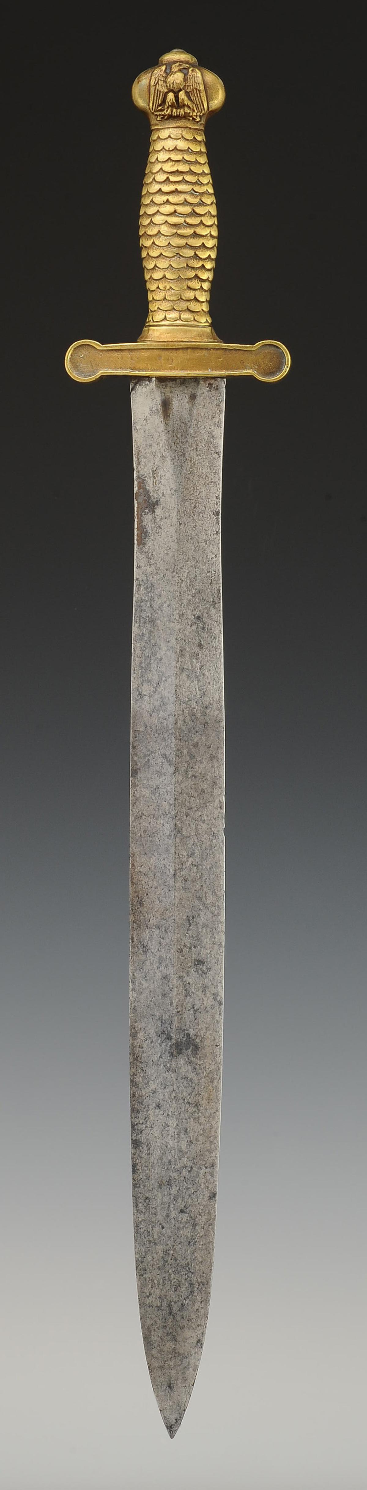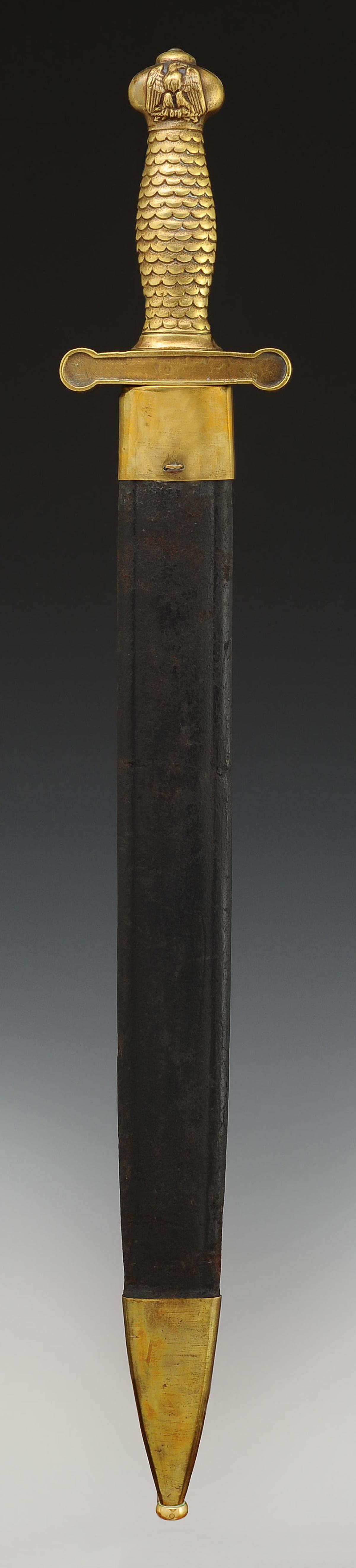 Monture « à la romaine » en laiton monobloc à croisière symétrique et poignée ornée de 18 rangées d'écailles. Fort pommeau moulé en relief de l'aigle impériale non couronnée. Au sommet du pommeau, une rivure en fer est destinée à fixer la lame. Lame de 48,9 cm de long et 4,3 cm au talon, elle est symétrique et à double tranchant. Fourreau en cuir verni noir à deux garnitures de laiton, chape à pontet, bout du fourreau terminé par une bouterolle en laiton.