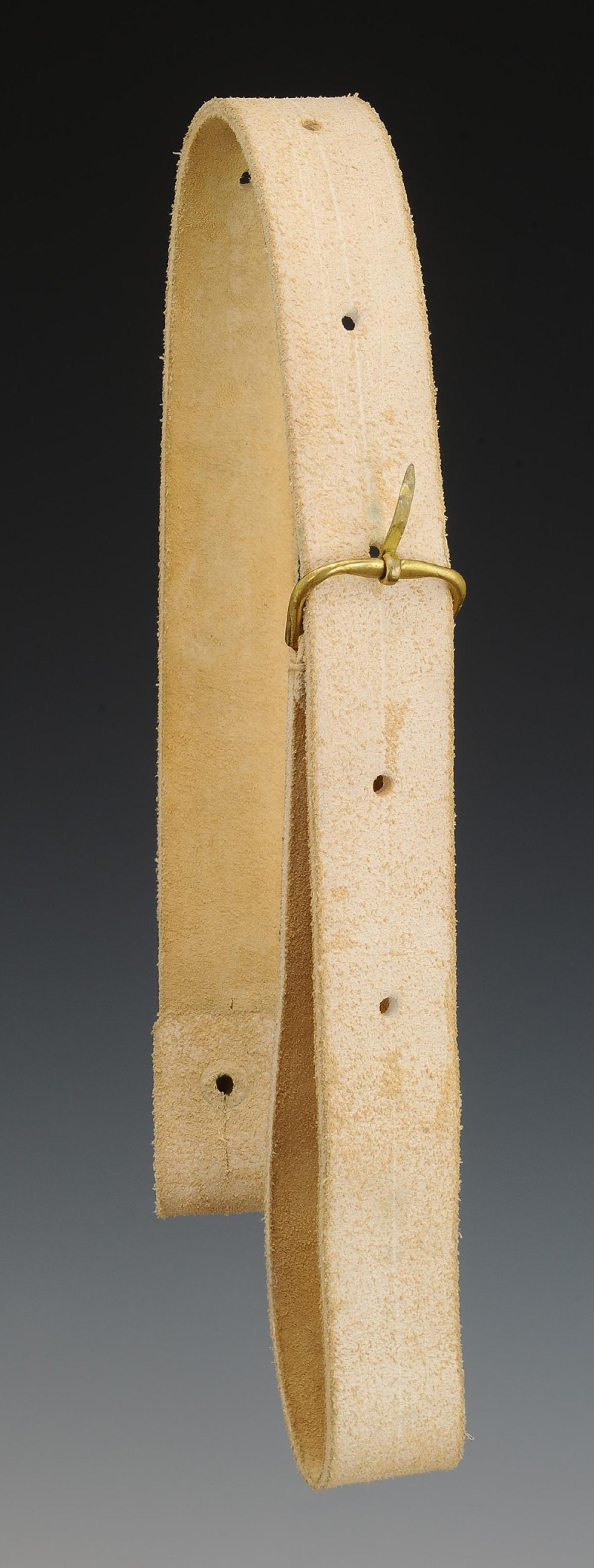 En buffle blanchi, largeur 3,5 cm, longueur totale 84 cm. Boucle à ardillon et bouton en laiton.