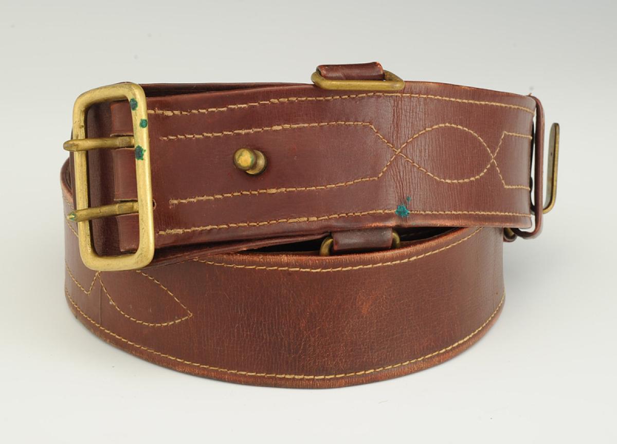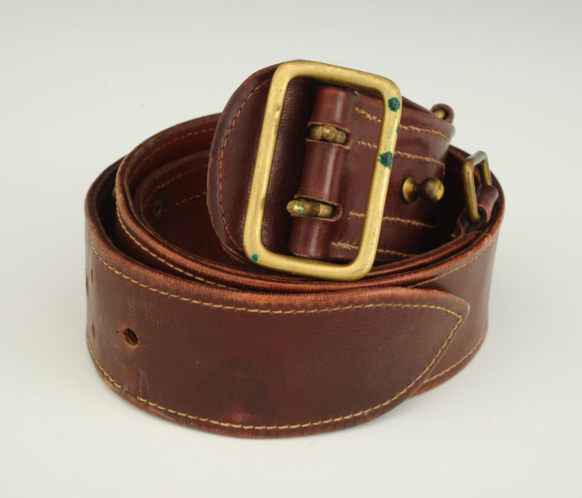 En cuir brun décoré de coutures à dessins géométriques, largeur 4,6 cm, longueur totale 113 cm. Bouclerie laiton.