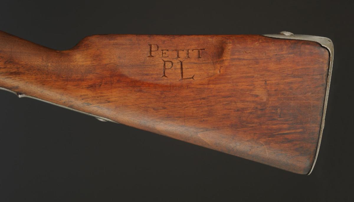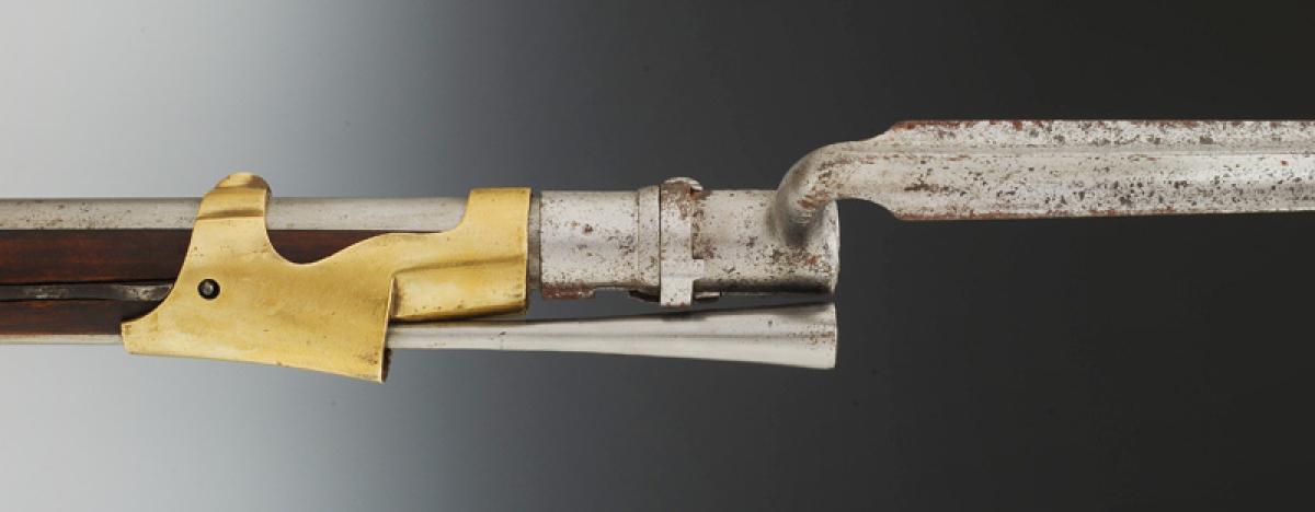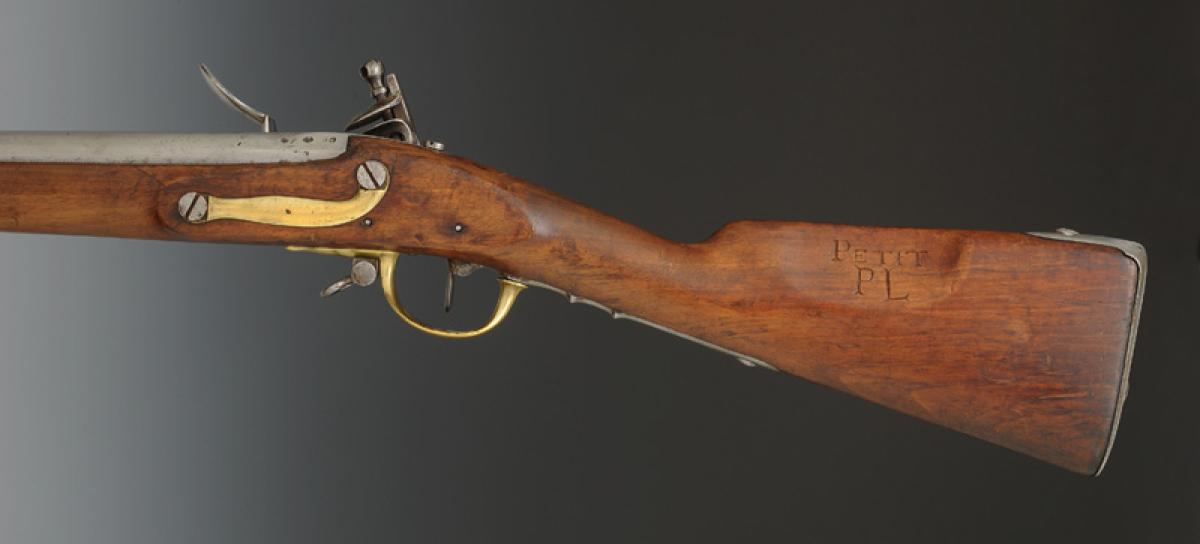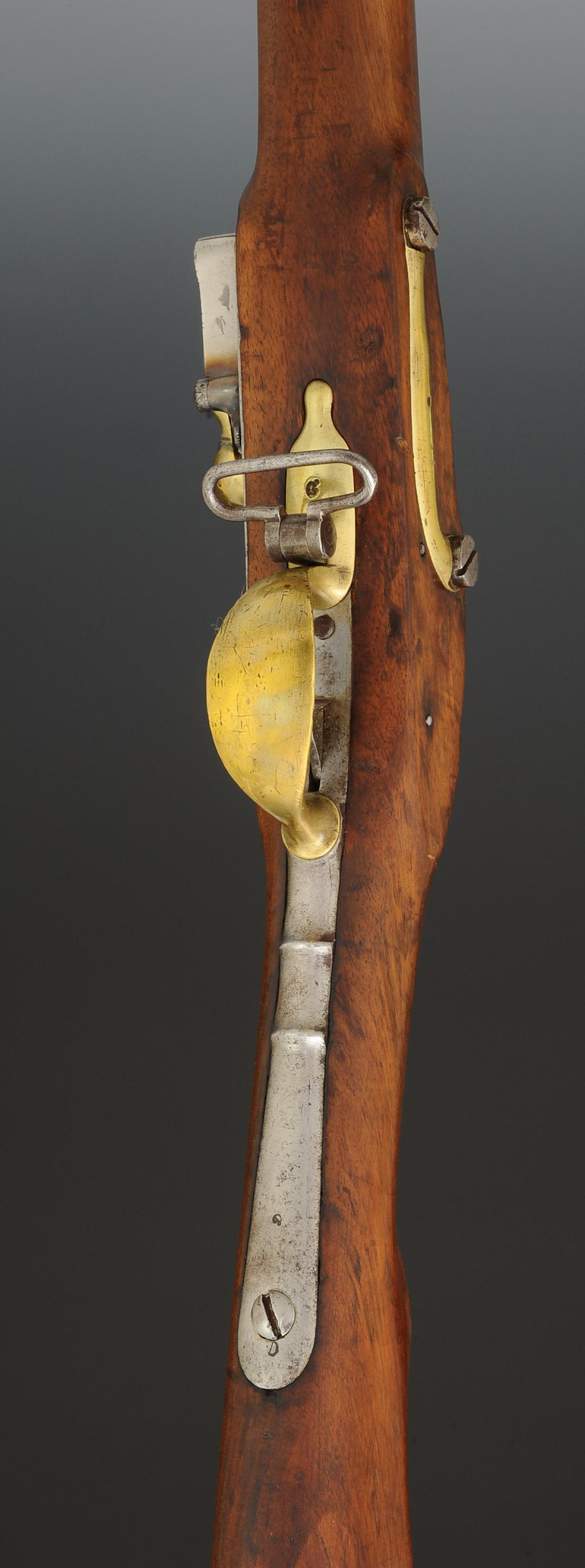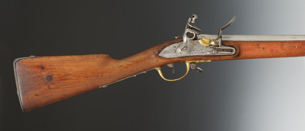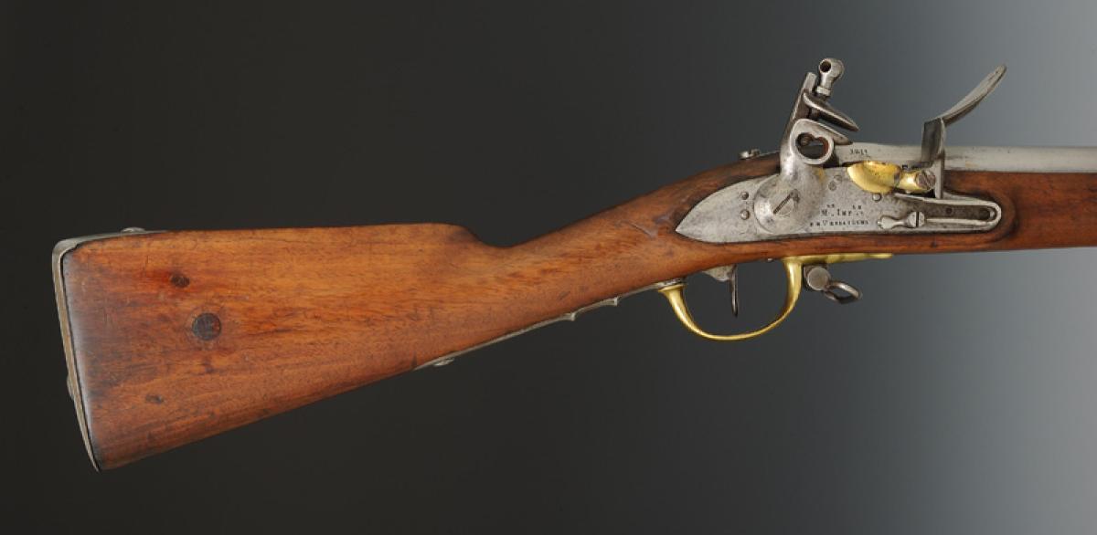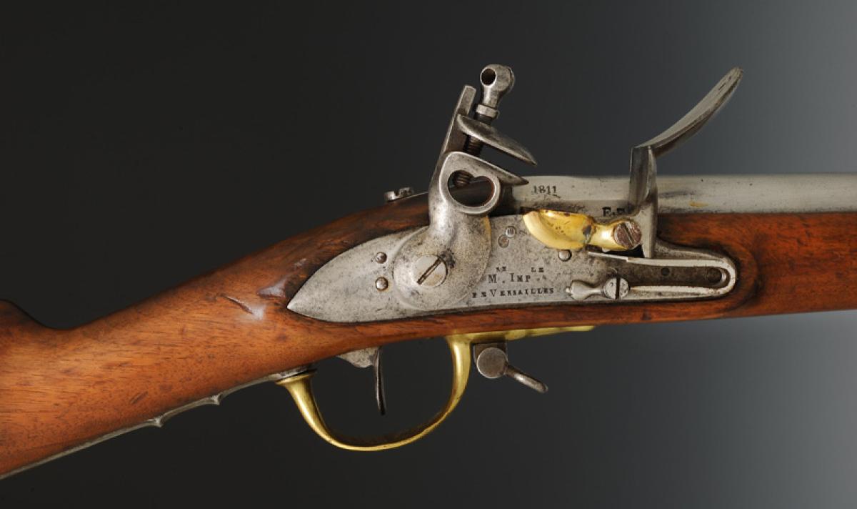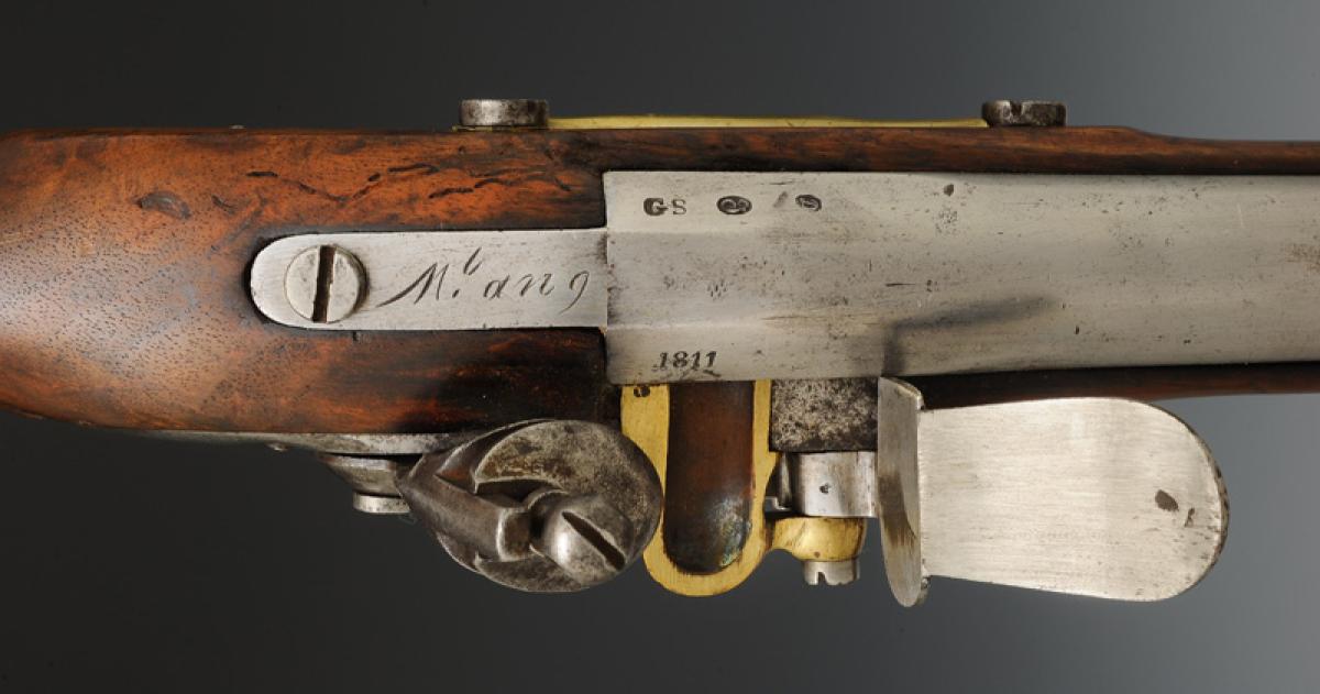 Canon à cinq pans courts au tonnerre, longueur 1 m 03, calibre 17,5 mm, daté « 1811 » et poinçonné « GS » « D » dans un octogone, « EF » et « L » dans un ovale. Marquage de la queue de culasse « Mle an 9 ». Longueur du canon avec la queue de culasse 1 m 085. Monture en bois, crosse à joue. Embouchoir en laiton avec fixation par ressort d'acier, grenadière en acier fixée par un ressort placé entre les deux bandes et s'appuyant sur la bande inférieure. Capucine en laiton pareillement fixée. Pontet et contre-platine en laiton. Platine à silex modèle an IX signée « Mre Imple de Versailles ». Plaque de couche en acier. Baguette en acier.
