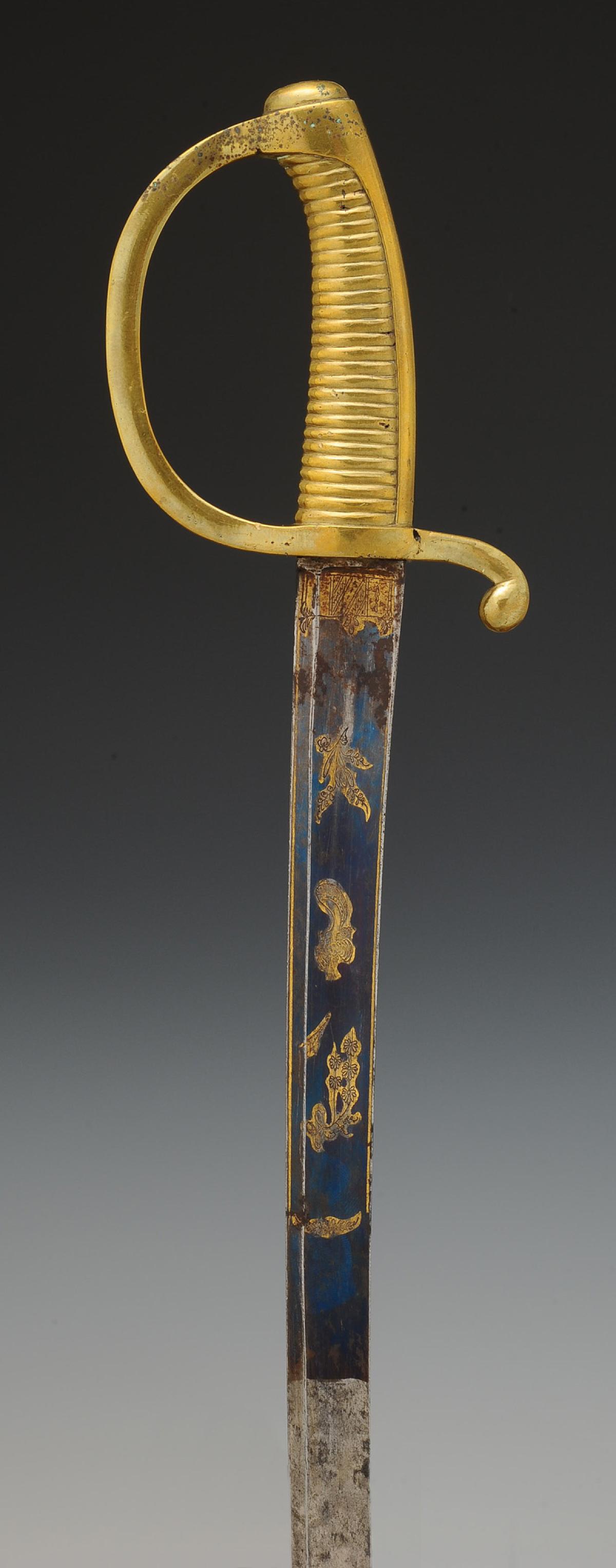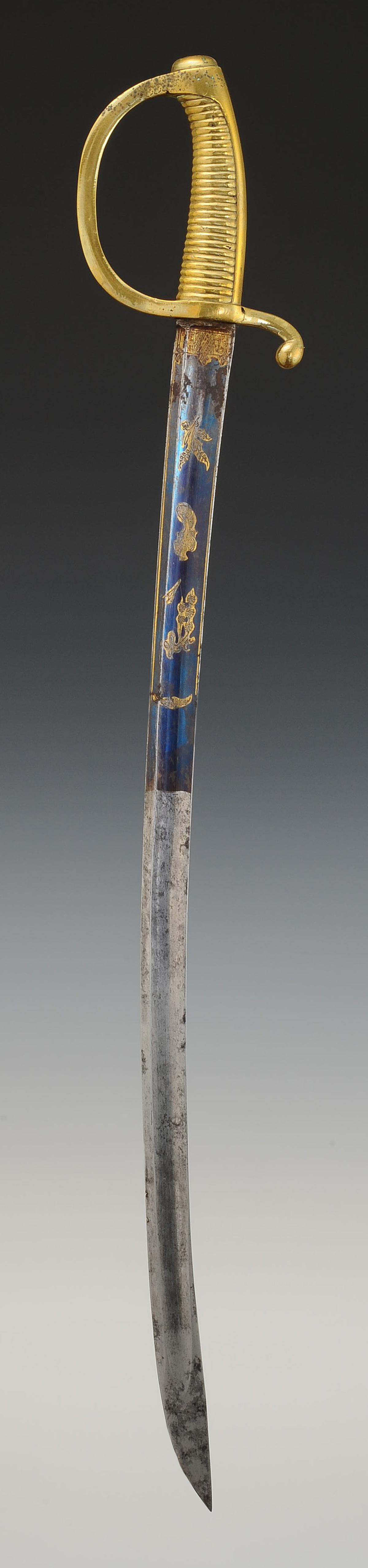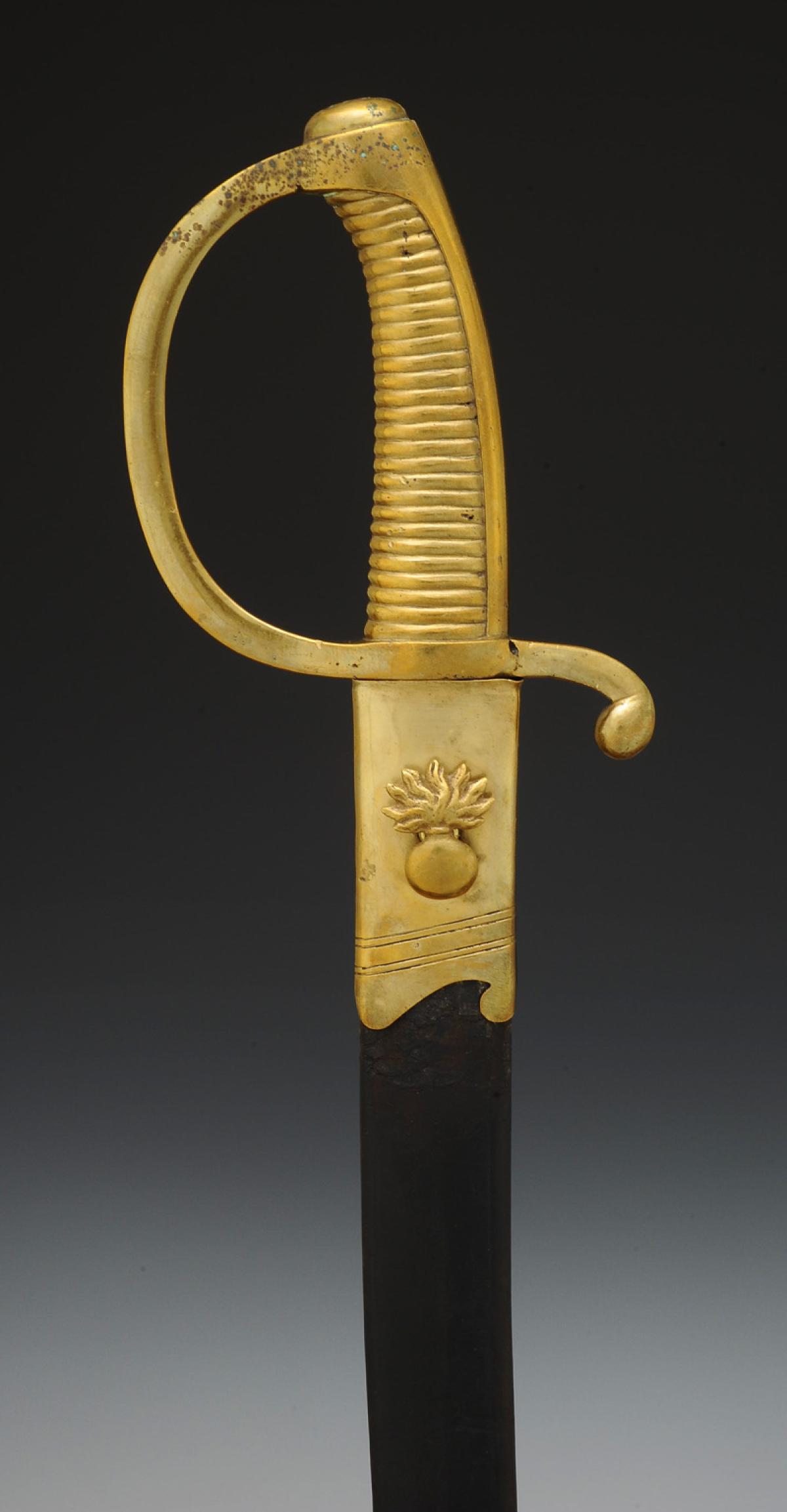 Monture monobloc en laiton avec garde à une branche. Poignée à torons. Lame légèrement courbe à pans creux, gravée et dorée sur son premier tiers de trophées militaires et floraux sur fond bleui, longueur 61,2 cm. Fourreau en cuir verni noir à deux garnitures de laiton décorées aux traits, chape avec bouton représentant une bombe enflammée, bout du fourreau avec bouterolle laiton.