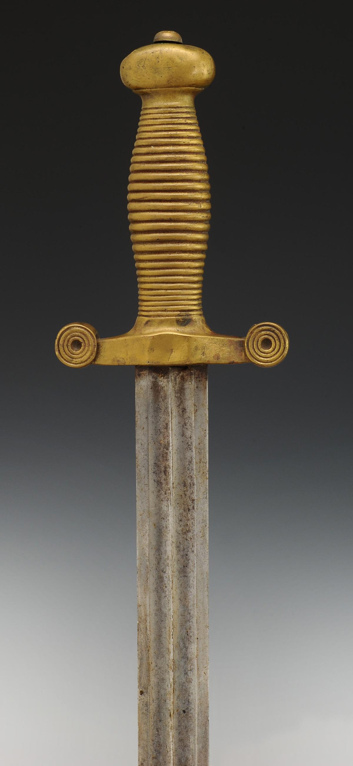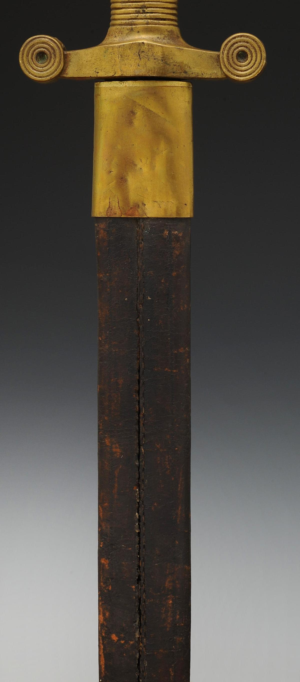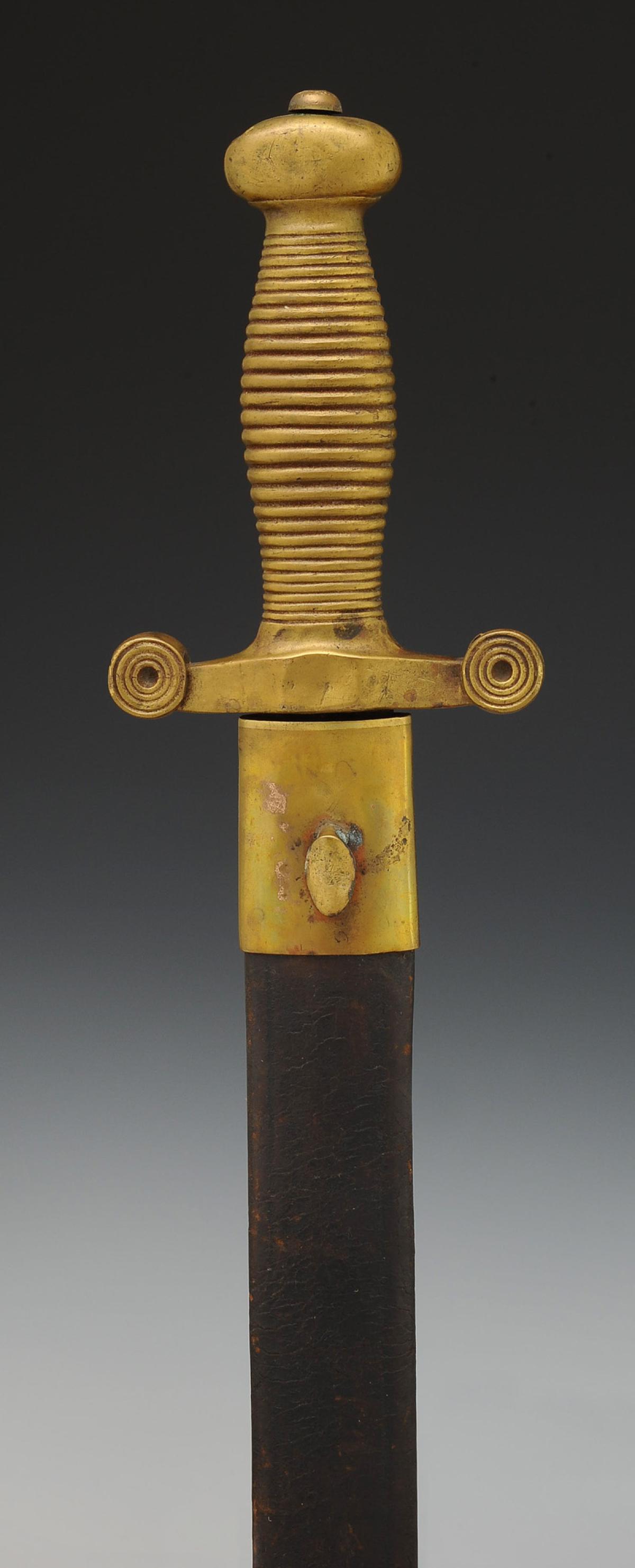 Monture symétrique monobloc moulée en laiton, poignée figurant 22 cordons. Croisière droite à double quillon. Lame à gouttières de 42,7 cm de long. Fourreau en cuir ciré noir à deux garnitures de laiton, chape avec bouton pour le port au ceinturon, bout du fourreau à bouterolle de laiton.