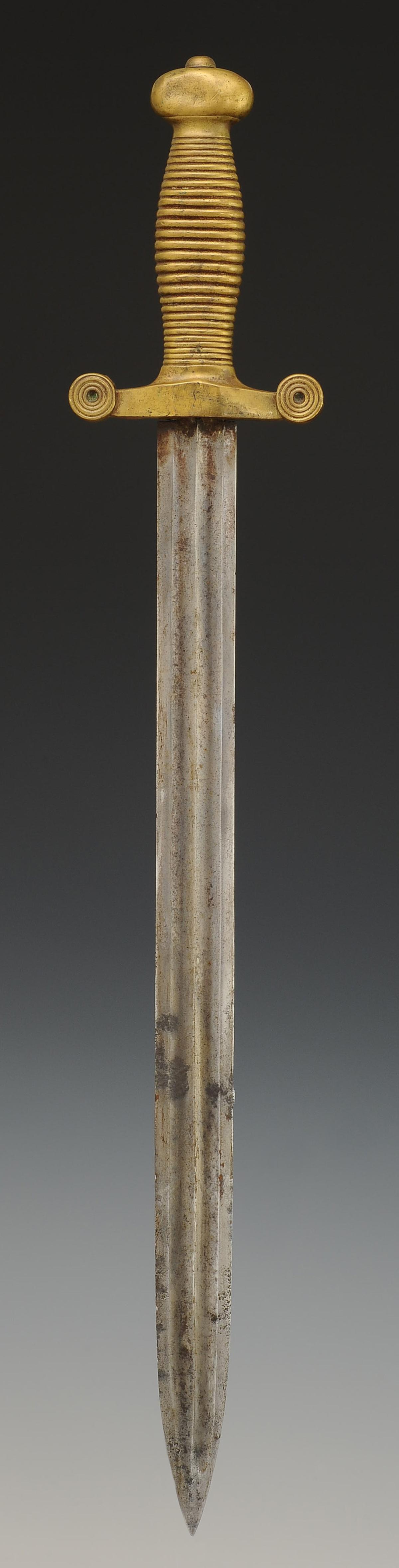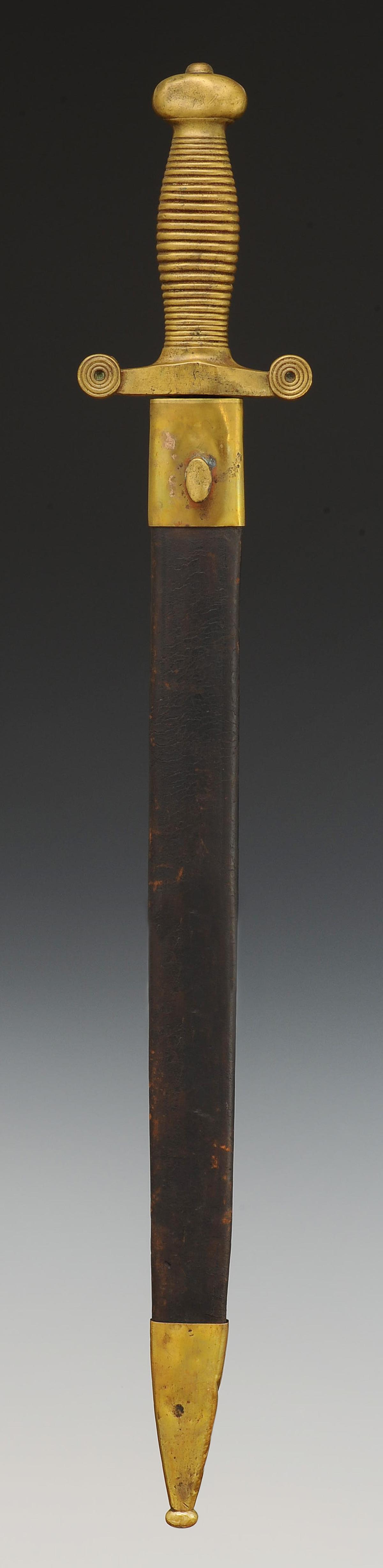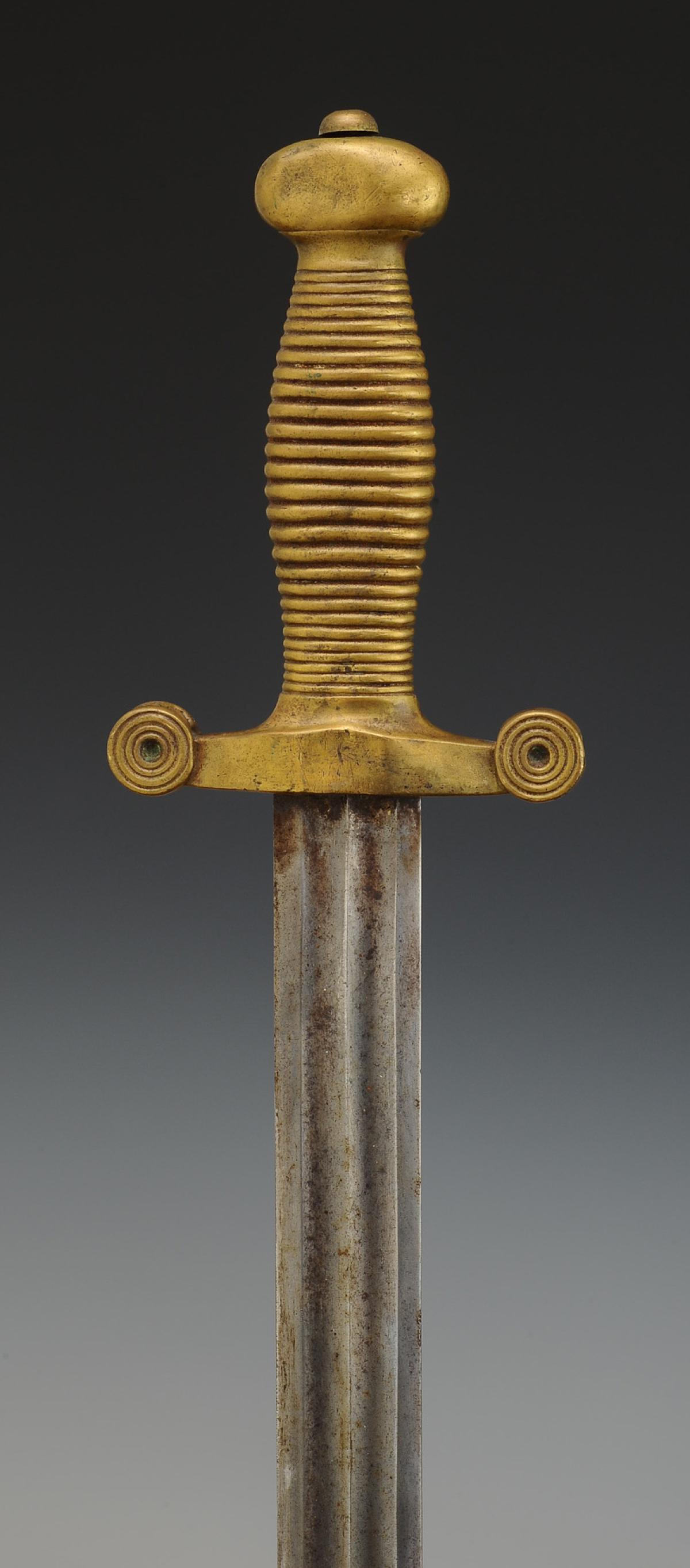 Monture symétrique monobloc moulée en laiton, poignée figurant 22 cordons. Croisière droite à double quillon. Lame à gouttières de 42,7 cm de long. Fourreau en cuir ciré noir à deux garnitures de laiton, chape avec bouton pour le port au ceinturon, bout du fourreau à bouterolle de laiton.