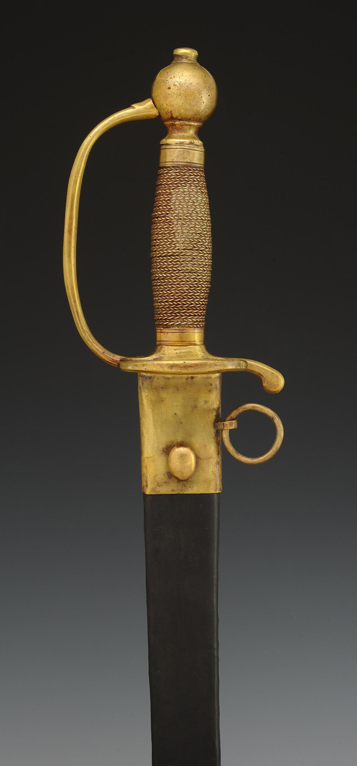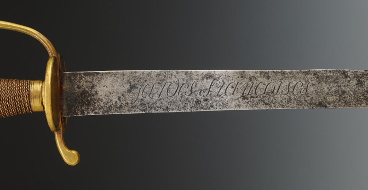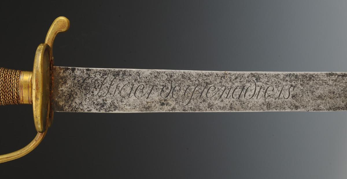 Monture en laiton. Garde à une branche. Pièce de garde en coquille d'épée au lieu du double pontat en coeur traditionnel pour les grenadiers d'infanterie. Pommeau rond. Fusée en bois entièrement filigrané laiton. Viroles décorées aux traits. Lame plate légèrement courbe, longueur 73,8 cm, gravée sur une face « Officier de grenadiers », et sur l'autre face « Gardes françaises ». Cravate en cuir naturel. Fourreau en cuir verni noir à deux garnitures de laiton, chape avec anneau de suspension en laiton ainsi qu'un bouton pour le port au ceinturon, bout du fourreau avec bouterolle laiton.