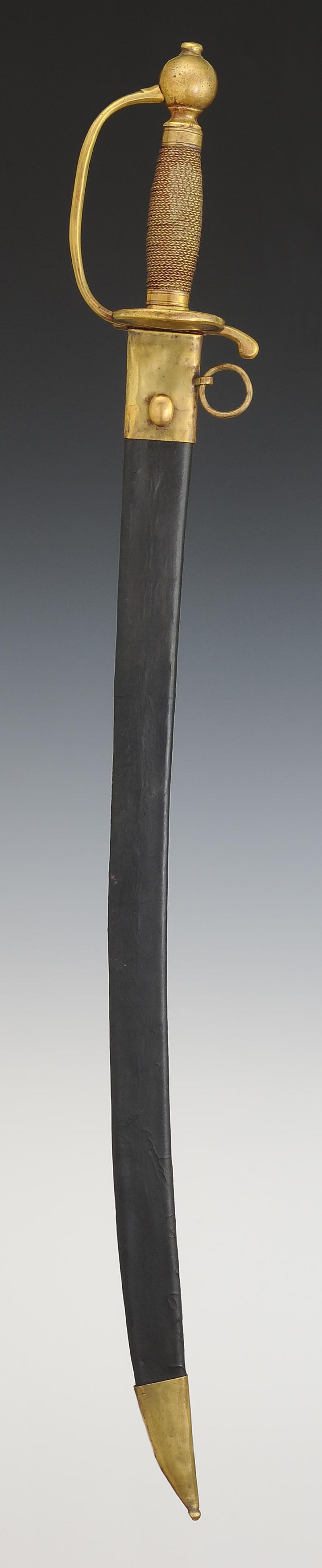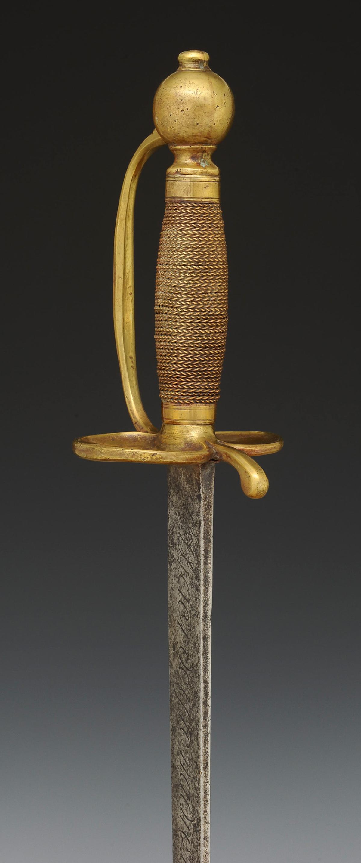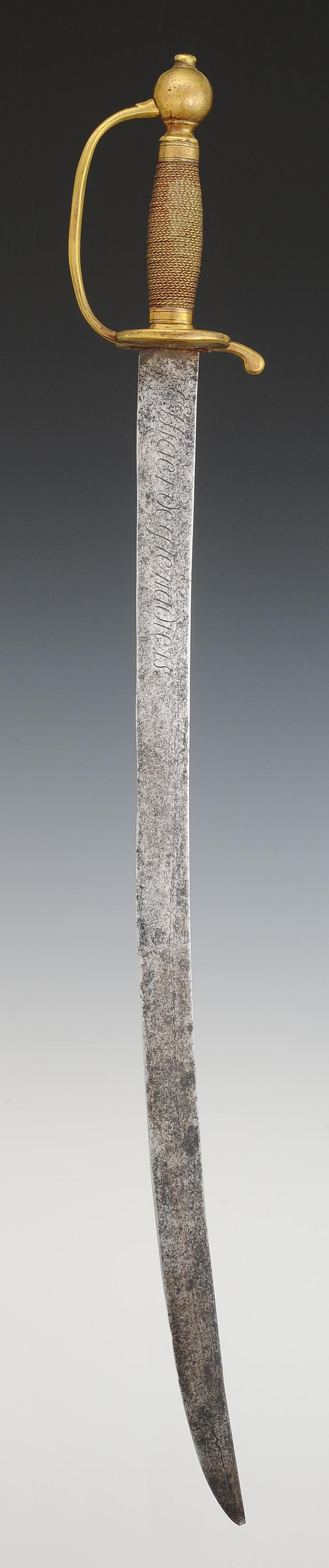 Monture en laiton. Garde à une branche. Pièce de garde en coquille d'épée au lieu du double pontat en coeur traditionnel pour les grenadiers d'infanterie. Pommeau rond. Fusée en bois entièrement filigrané laiton. Viroles décorées aux traits. Lame plate légèrement courbe, longueur 73,8 cm, gravée sur une face « Officier de grenadiers », et sur l'autre face « Gardes françaises ». Cravate en cuir naturel. Fourreau en cuir verni noir à deux garnitures de laiton, chape avec anneau de suspension en laiton ainsi qu'un bouton pour le port au ceinturon, bout du fourreau avec bouterolle laiton.