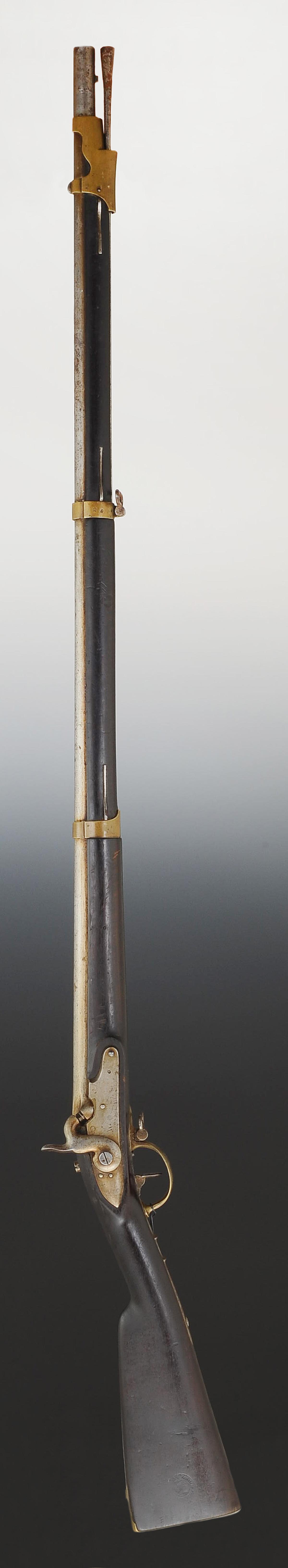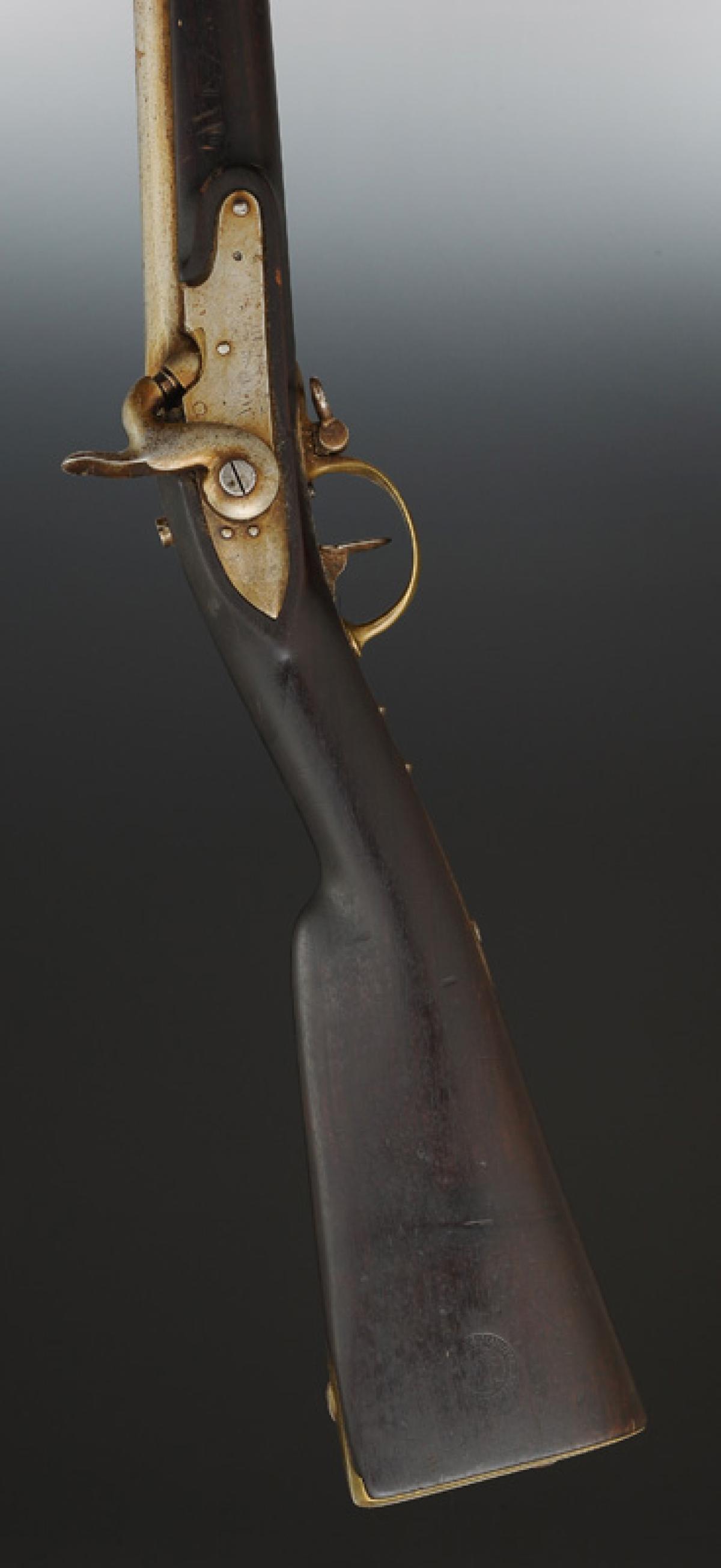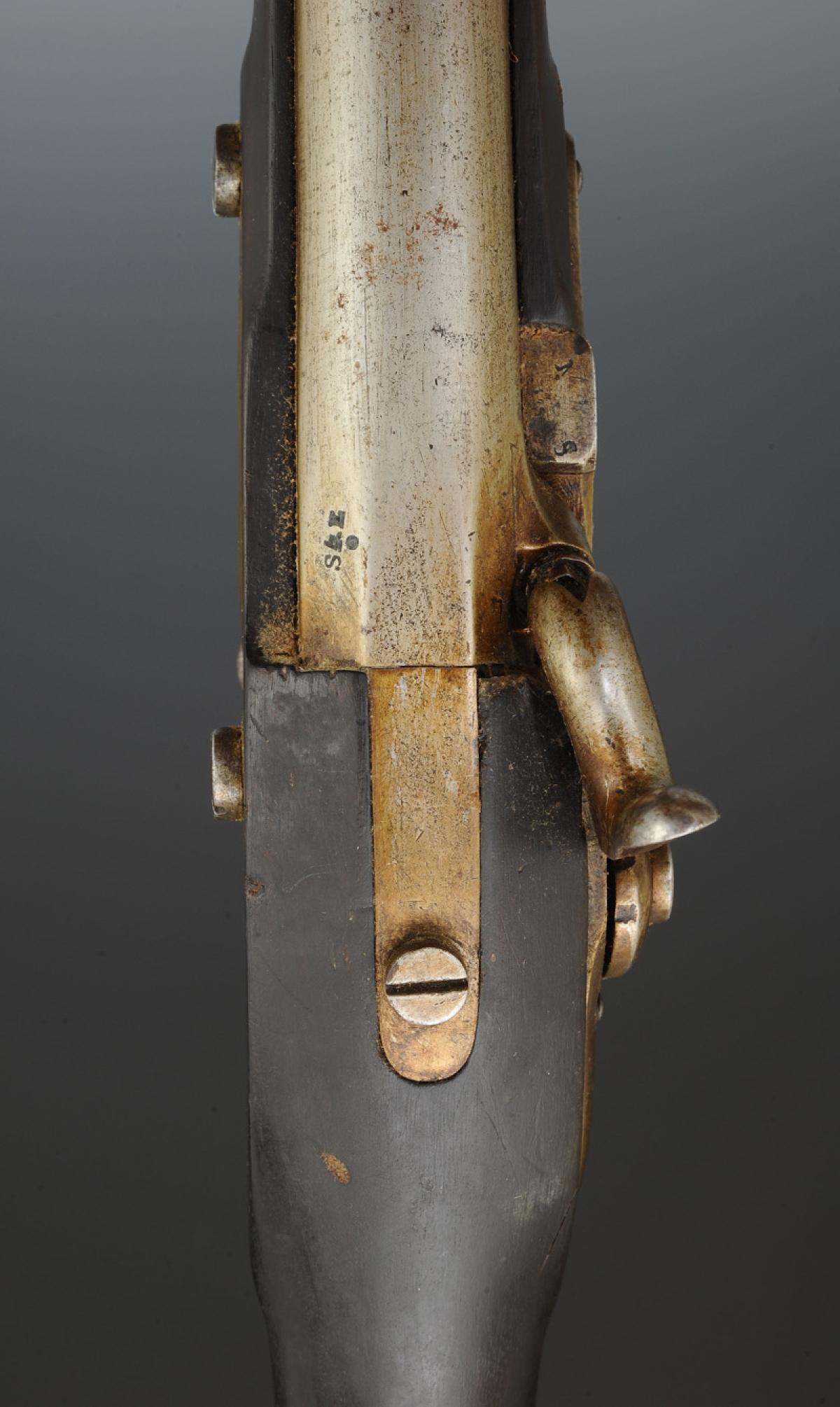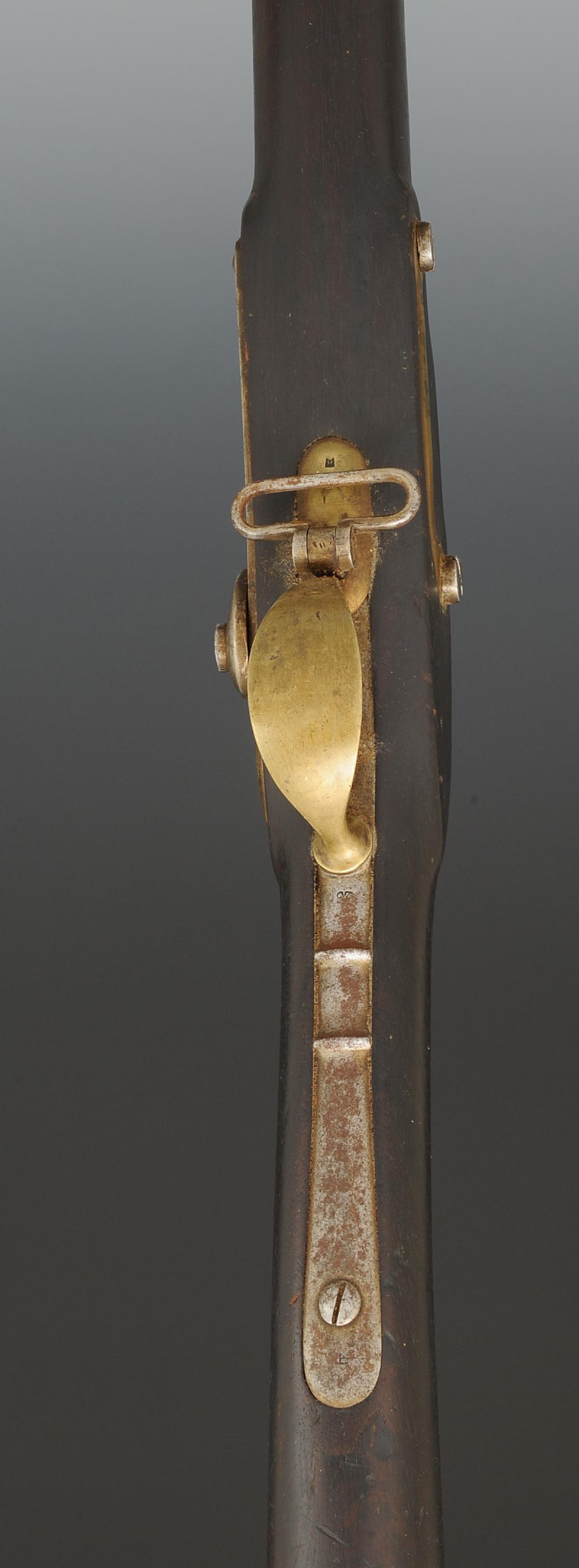 Fusil transformé percussion. Canon octogonal au tonnerre puis rond, longueur 102,5 cm, 108 cm avec la queue de culasse. Platine transformée percussion avec marquages effacés. Fût en noyer, crosse à joue. Toutes garnitures en laiton : grenadière, capucine, embouchoir, contre-platine et plaque de couche. Sous-garde en fer. Pontet en laiton. Baguette en fer.