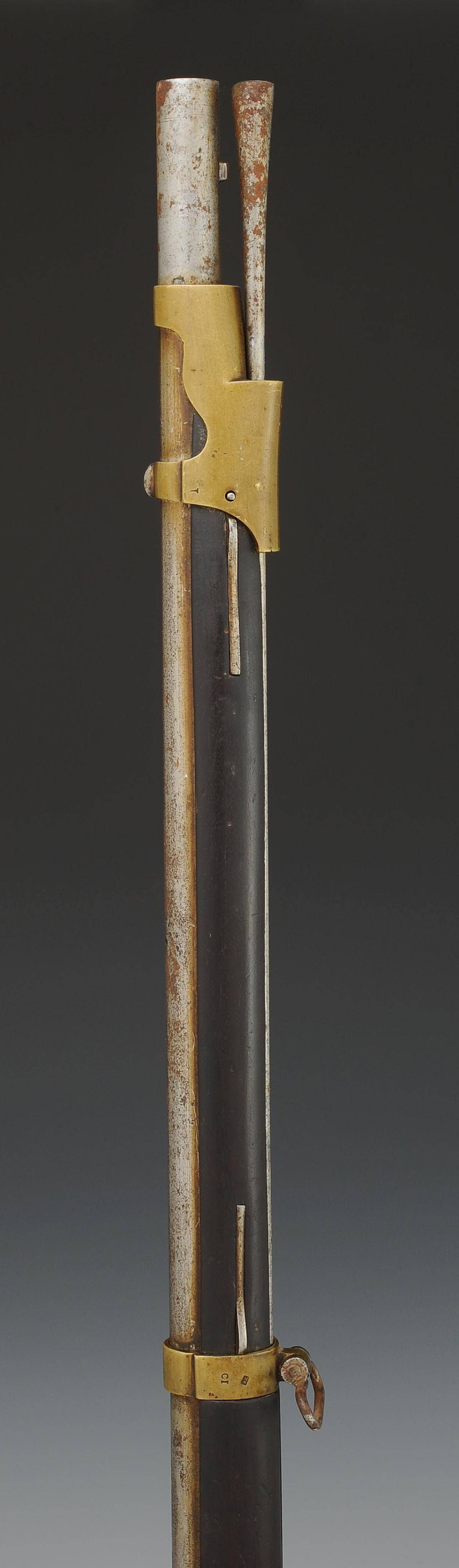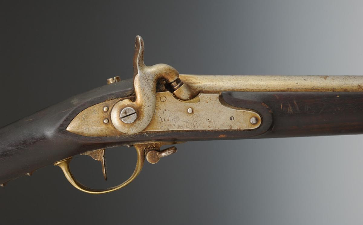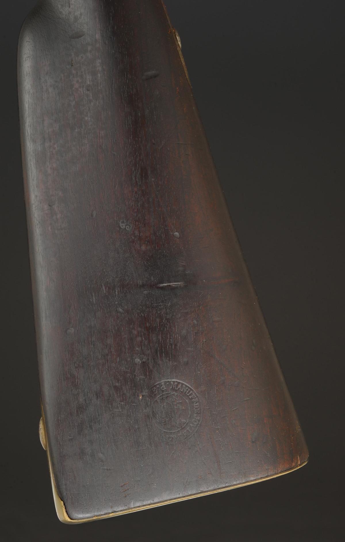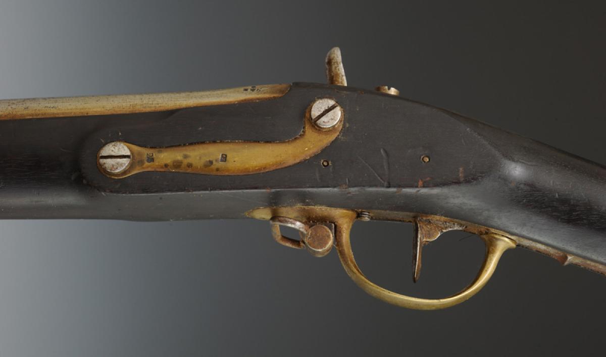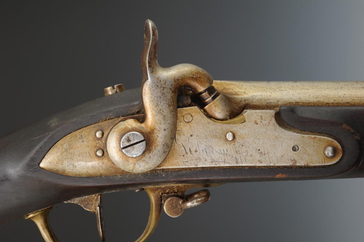 Fusil transformé percussion. Canon octogonal au tonnerre puis rond, longueur 102,5 cm, 108 cm avec la queue de culasse. Platine transformée percussion avec marquages effacés. Fût en noyer, crosse à joue. Toutes garnitures en laiton : grenadière, capucine, embouchoir, contre-platine et plaque de couche. Sous-garde en fer. Pontet en laiton. Baguette en fer.
