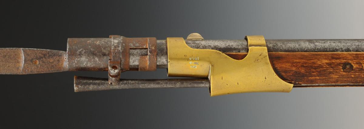 État moyen, canon et platine oxydés, bois avec trous de vers, quelques petits manques au niveau du passage de la baguette. Baïonnette fournie avec le fusil, non du modèle.