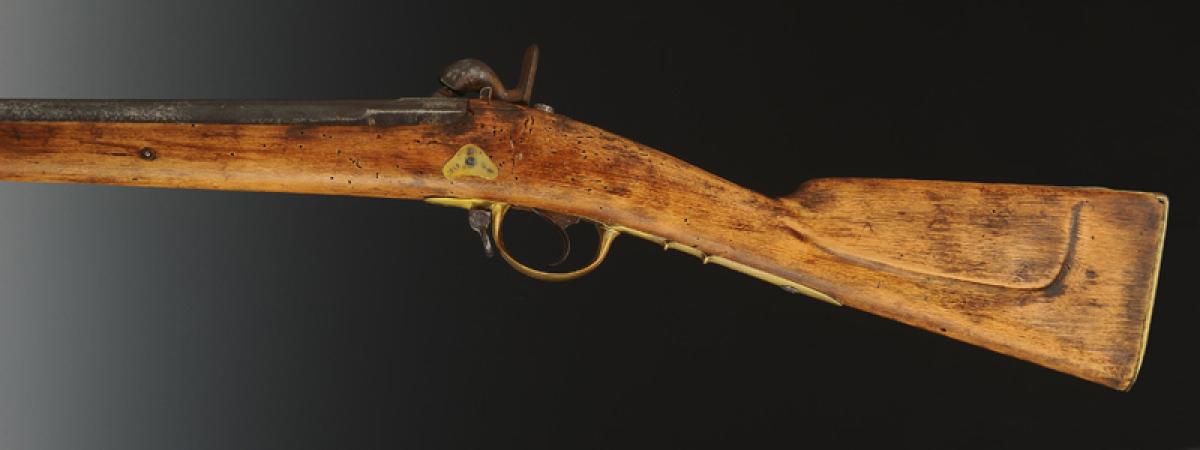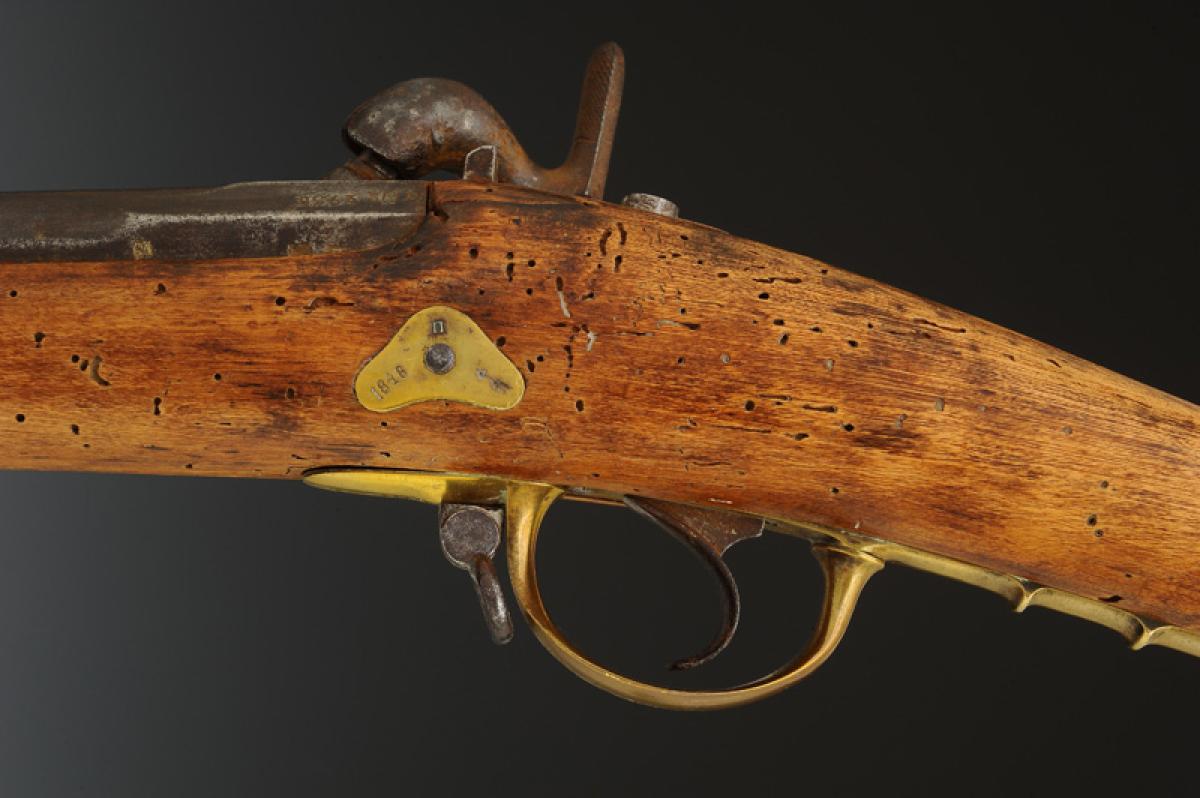 Platine à percussion marquée « M B N M » « C.O.3 - 1848 ». Monture en bois clair. Toutes garnitures en laiton, toutes marquées d'une flèche et « N M 1848 ». Pontet et sous-garde en laiton. Plaque de couche pareillement marquée aux garnitures avec poinçon à l'aigle russe.