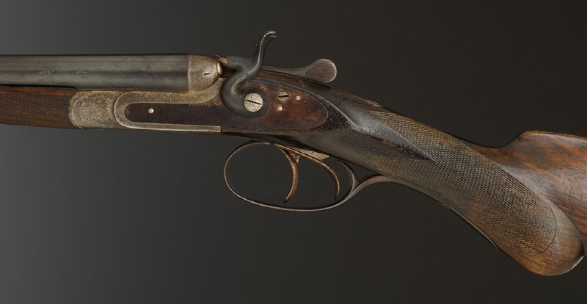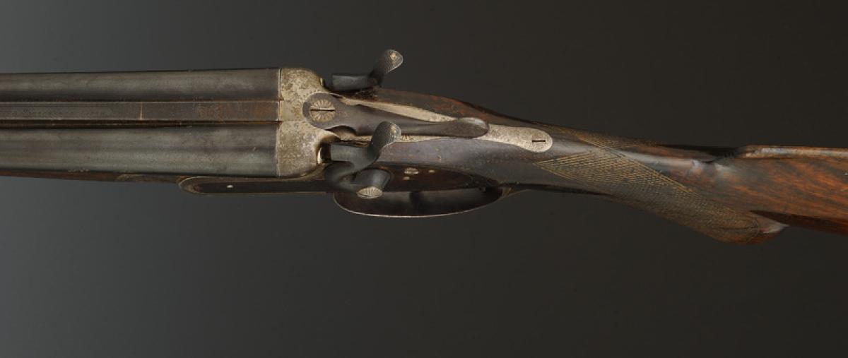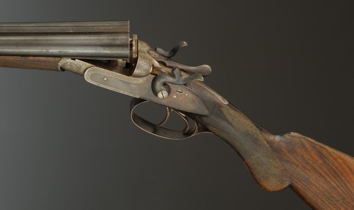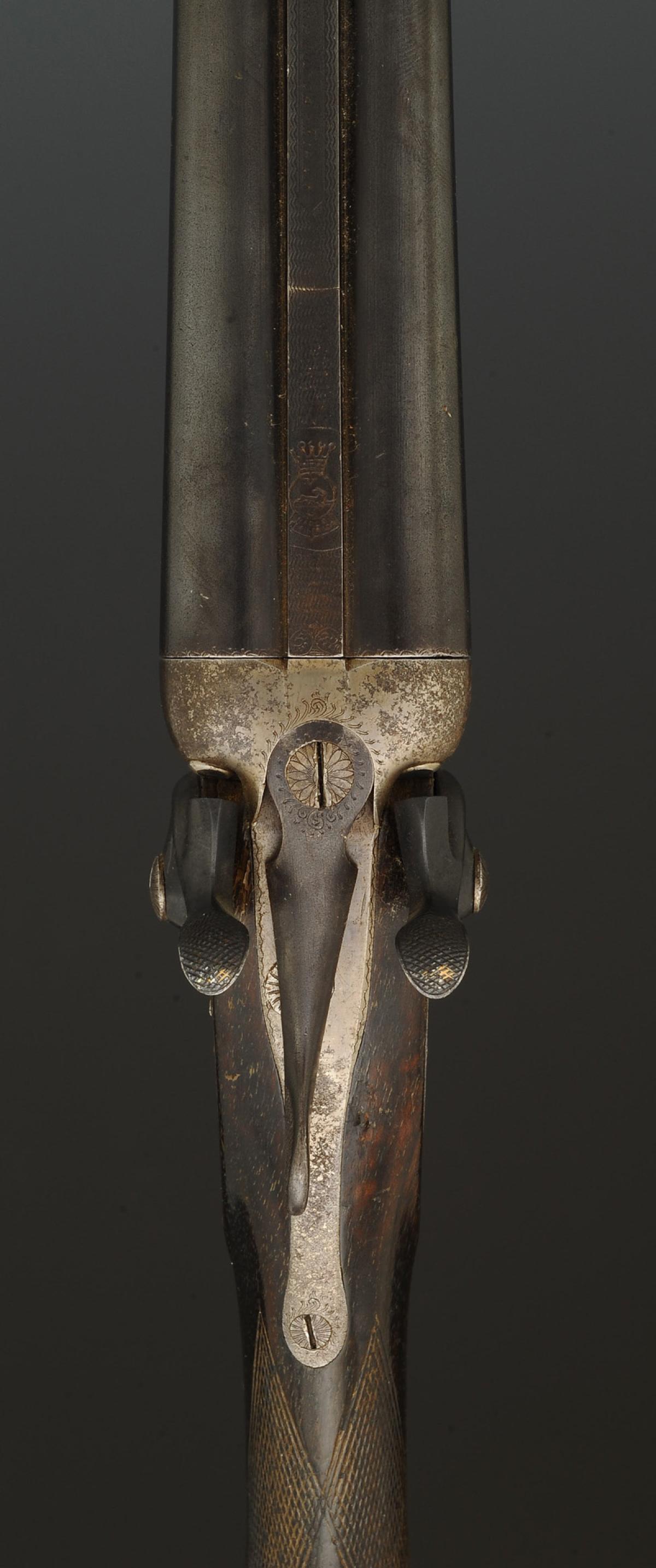 Fusil à doubles canons juxtaposés brunis, signés « Fca de Victor Sarasqueta Eibar ». Longueur des canons 60 cm, calibre 12 mm, longueur avec la queue de culasse 69,7 cm. Canons basculant à l'avant pour le rechargement. Chiens brunis. Platines à corps plat. Monture en noyer à fût court. Prise en main quadrillée. Toutes garnitures en acier bruni. Longueur totale de l'arme 98,2 cm.