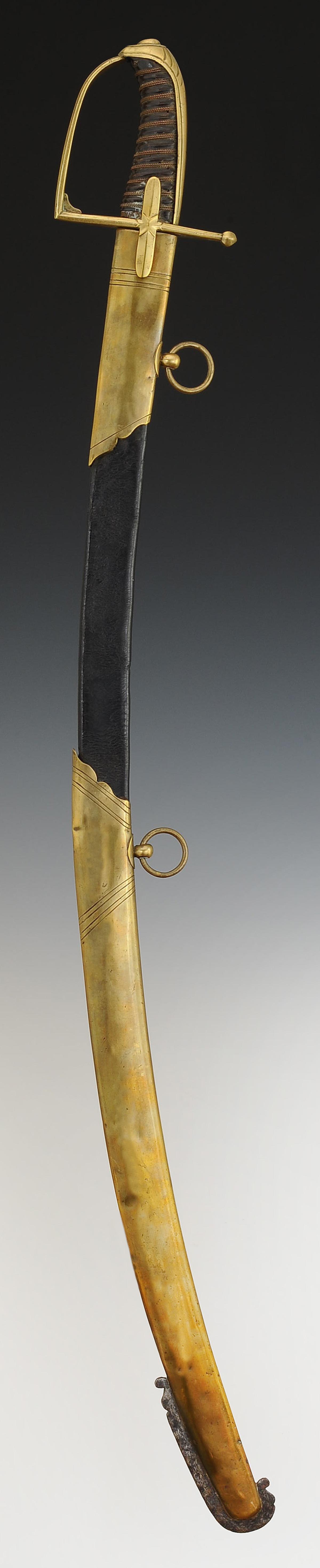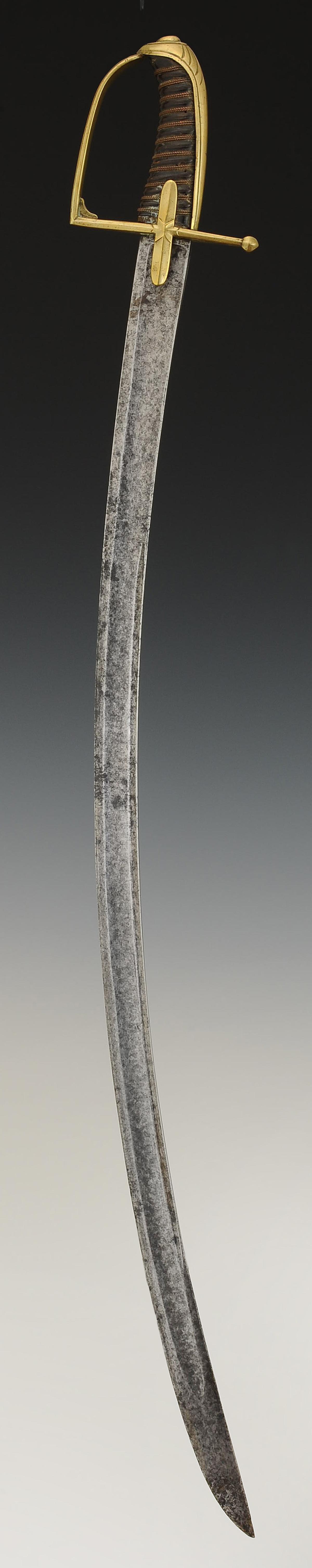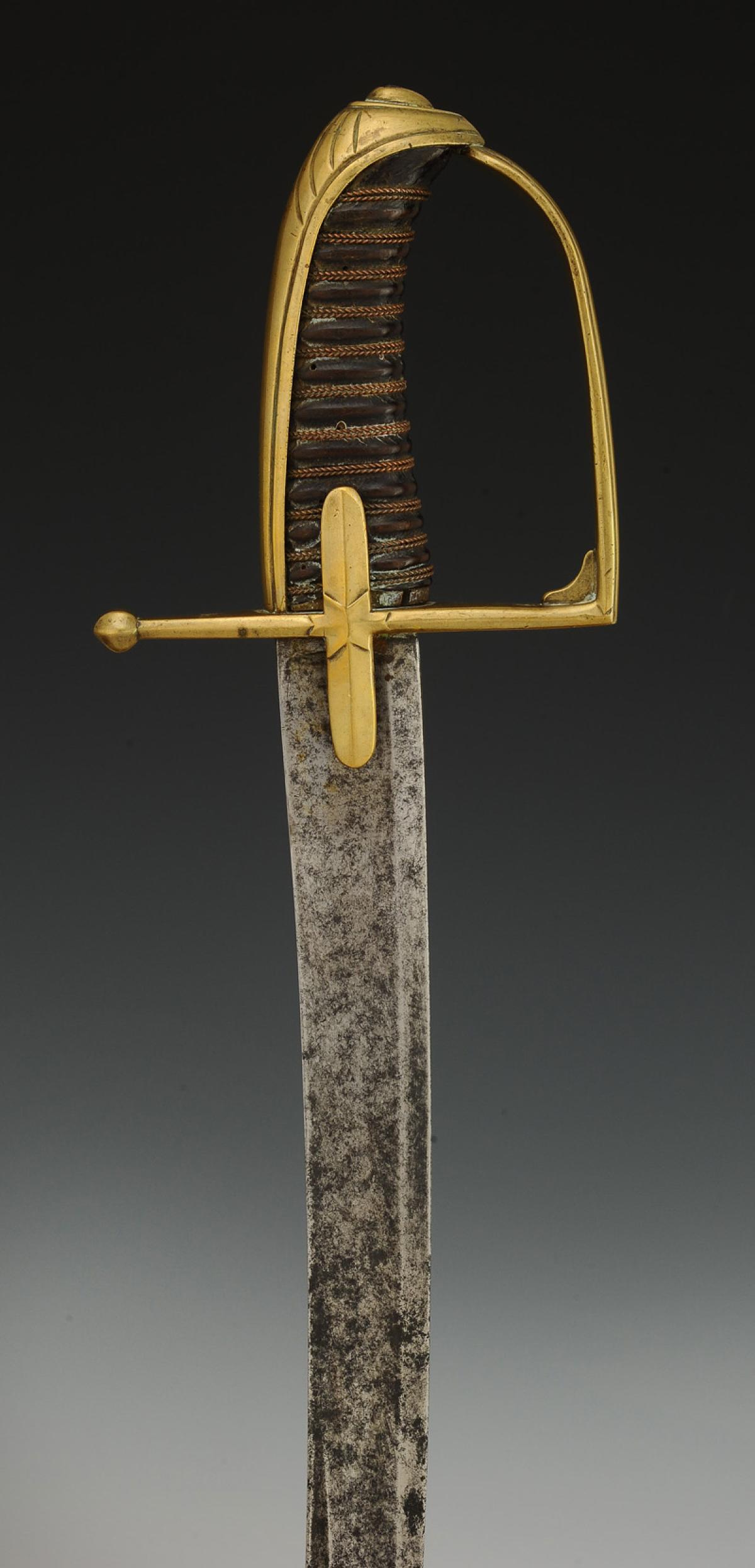 Monture en laiton. Garde à une branche décorée aux traits. Calotte à longue queue décorée aux traits. Poignée en bois gainé de veau ciré noir, filigrane cuivre. Lame blanche courbe à pans creux de 91,9 cm de long. Fourreau en cuir ciré noir à deux grandes garnitures de laiton décorées aux traits, à bords festonnés, avec pitons et anneaux de suspension en laiton. Bout du fourreau terminé par un dard en acier découpé en festons.