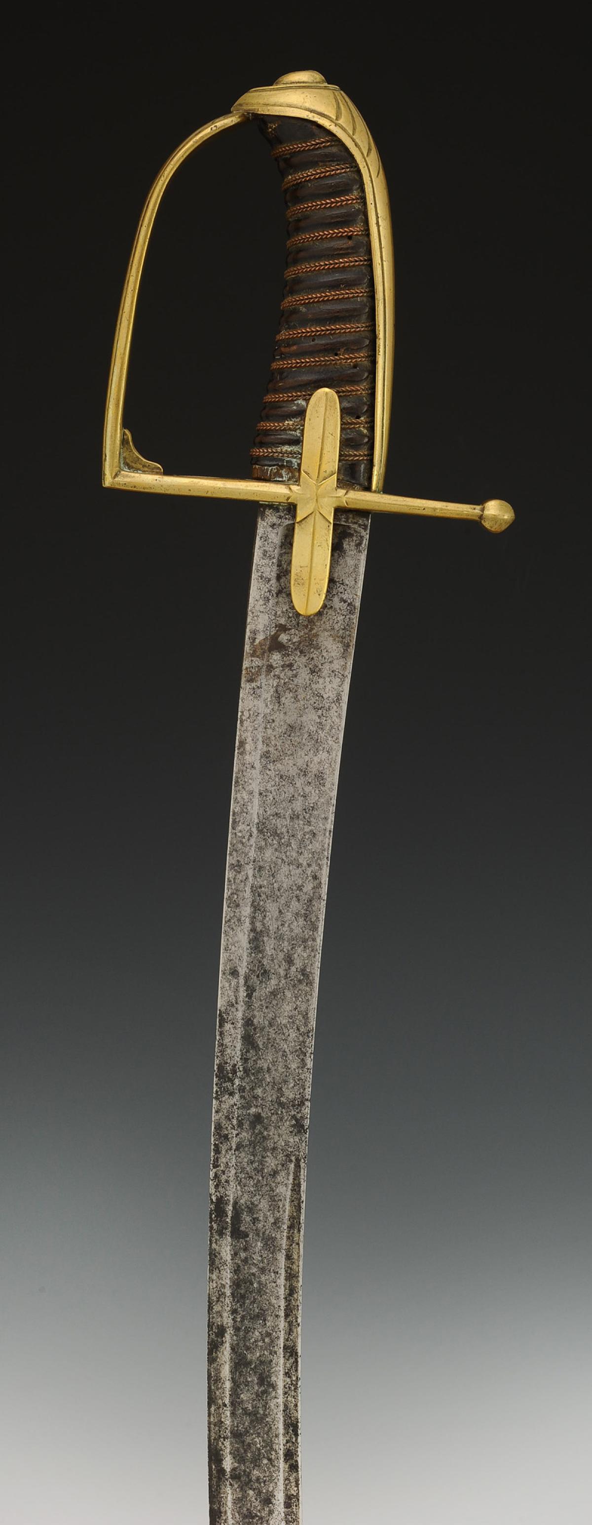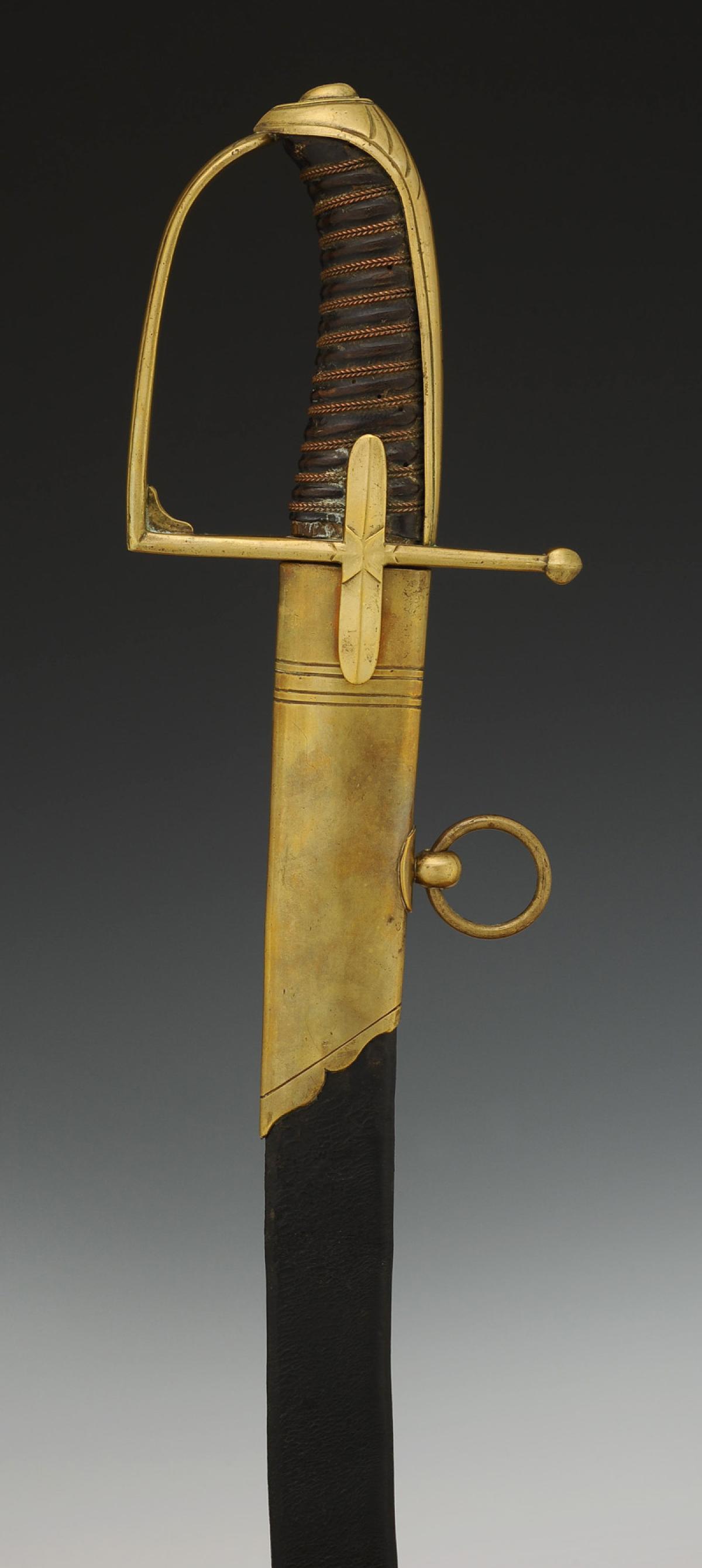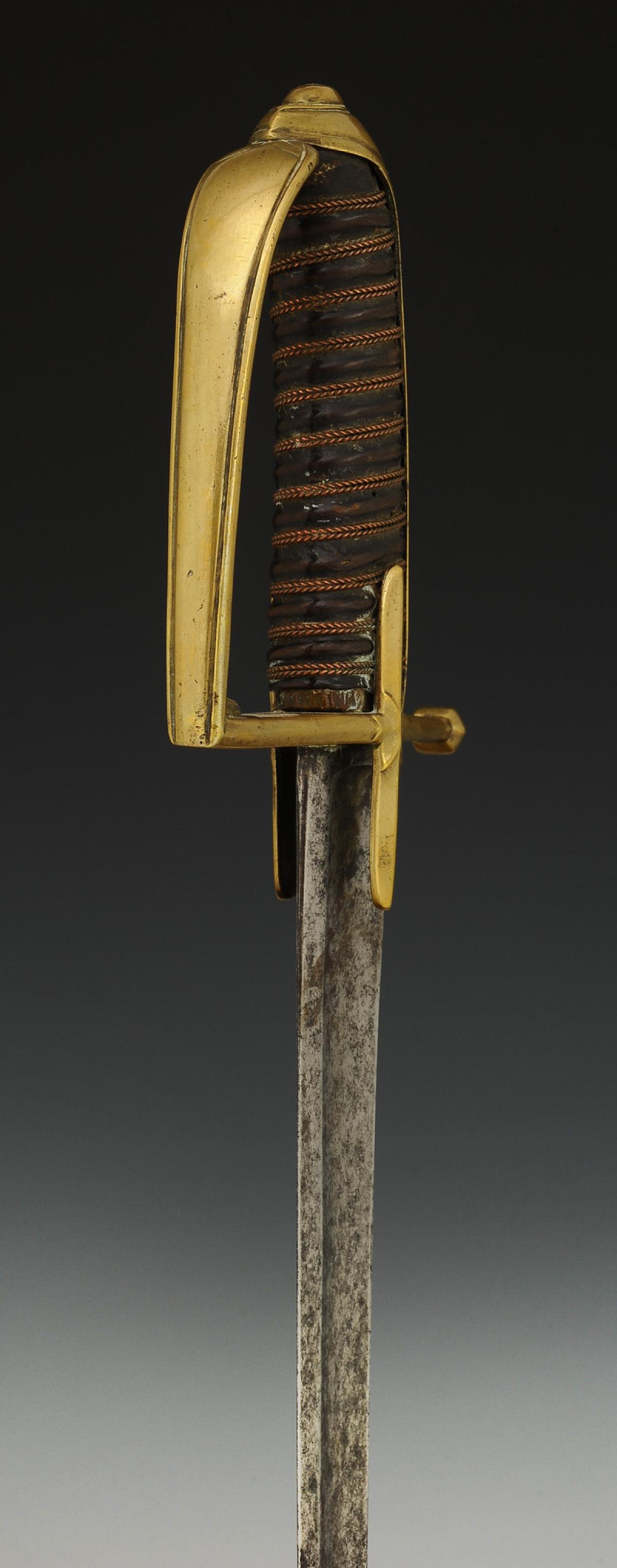 Monture en laiton. Garde à une branche décorée aux traits. Calotte à longue queue décorée aux traits. Poignée en bois gainé de veau ciré noir, filigrane cuivre. Lame blanche courbe à pans creux de 91,9 cm de long. Fourreau en cuir ciré noir à deux grandes garnitures de laiton décorées aux traits, à bords festonnés, avec pitons et anneaux de suspension en laiton. Bout du fourreau terminé par un dard en acier découpé en festons.
