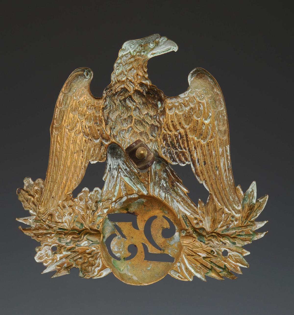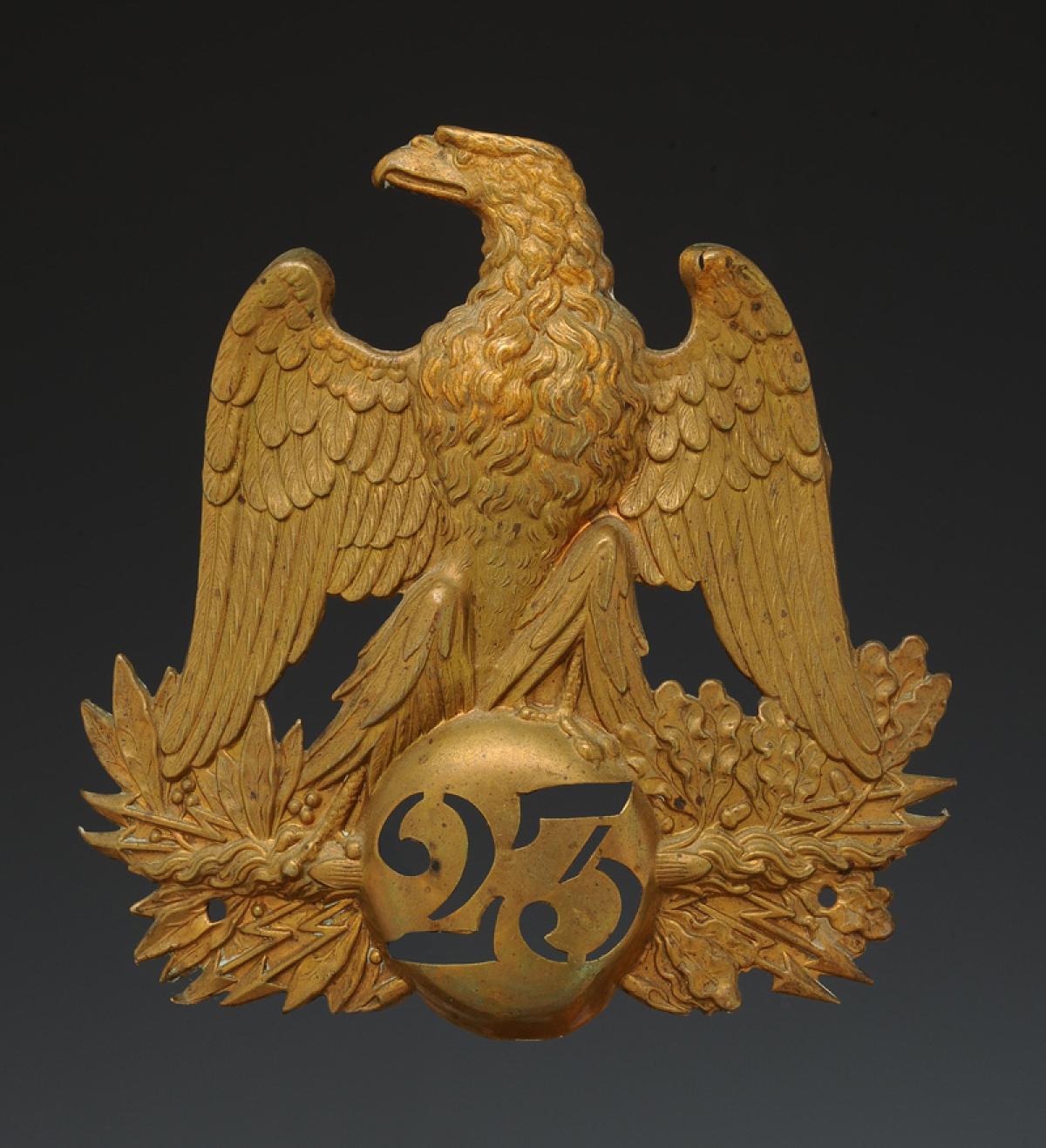 En laiton estampé et découpé en forme d'aigle impériale posée sur un globe découpé du chiffre « 23 » sur faisceau de Jupiter étincelant, rameau de chêne et branche de laurier. Complète de son écrou.