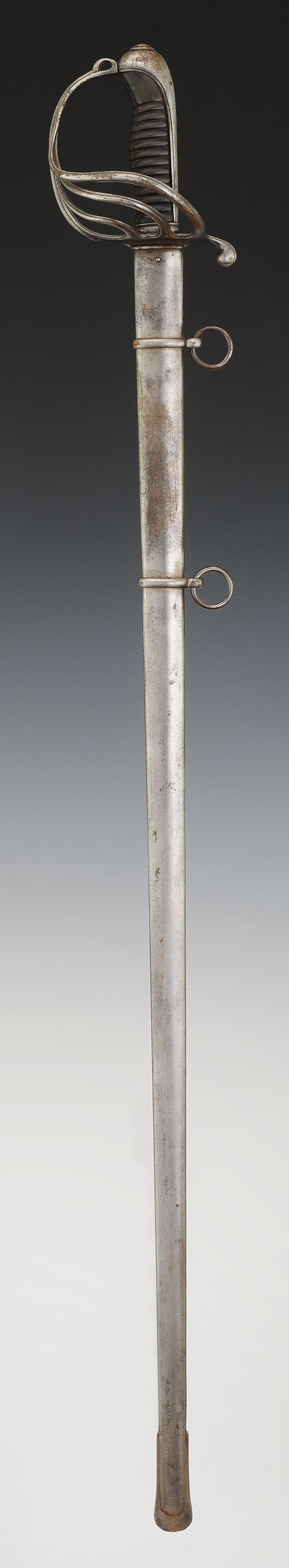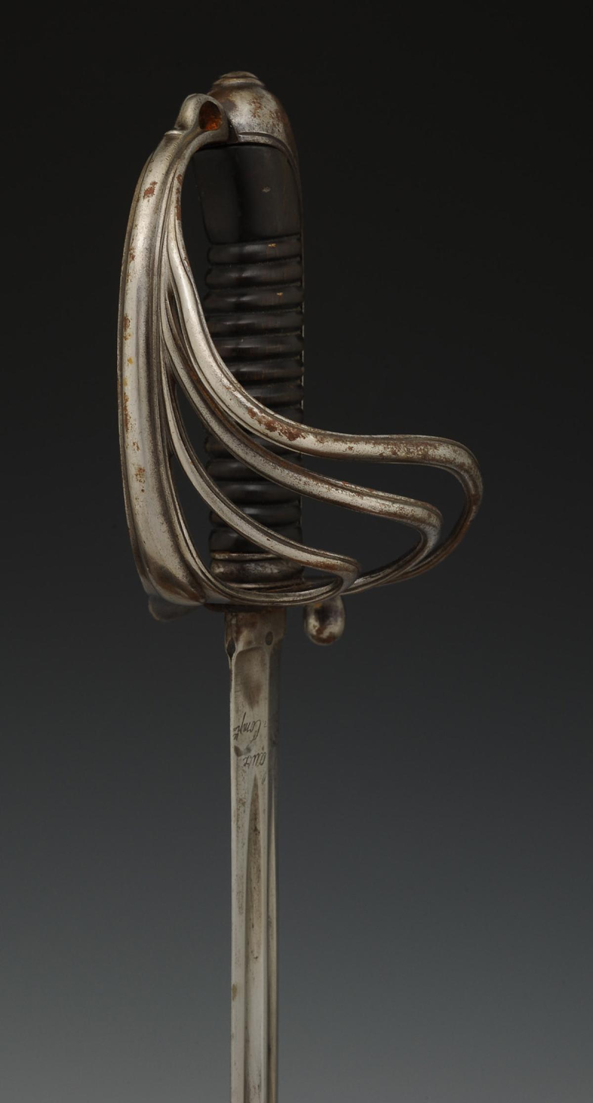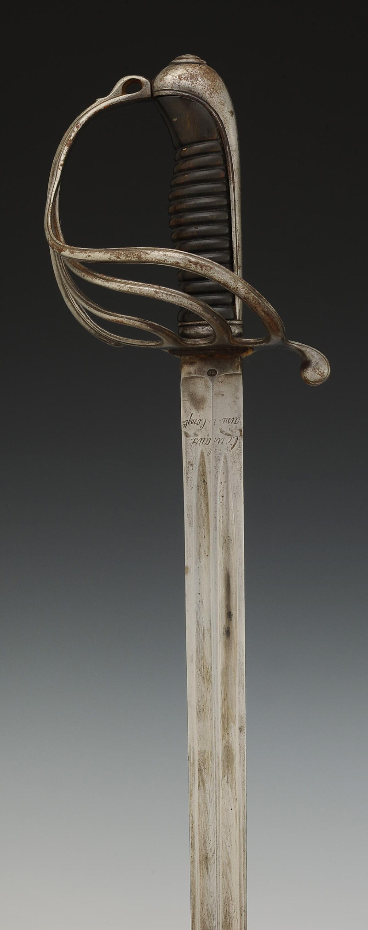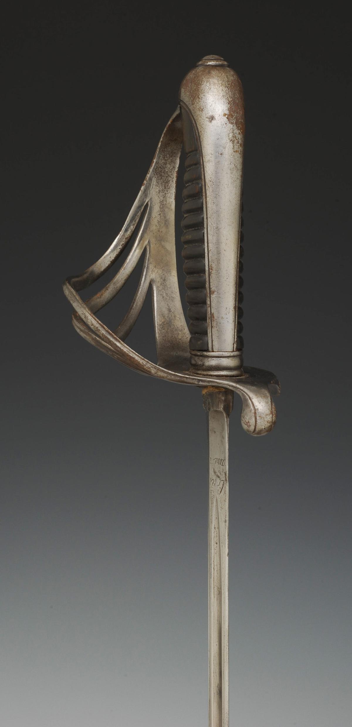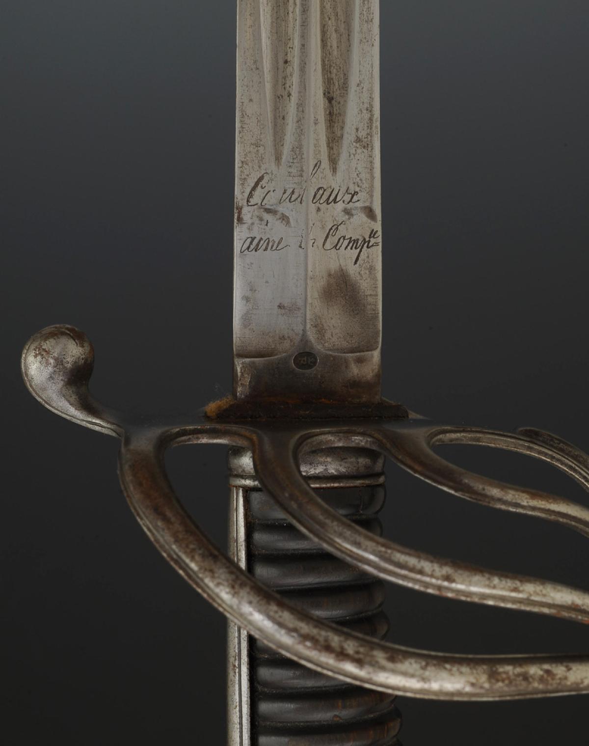 Monture en fer. Garde à quatre branches. Calotte à longue queue. Poignée en corne à 13 cannelures. Forte lame droite à section losangique et double gouttières, longueur 89 cm, signée au talon « Manufacture Klingenthal, Coulaux Aîné et Comp.ie ». Virole à cannelure.