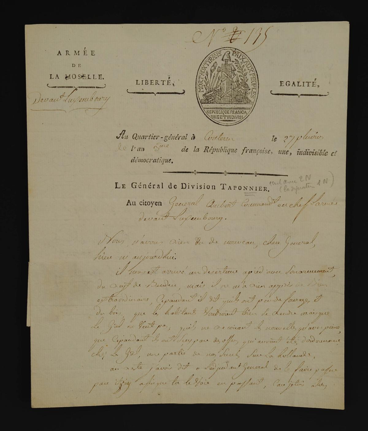Avec adresse et cachet de cire rouge. « Service militaire » « Au citoyen Général Ambert commande en chef l'armée devant Luxembourg à son quartier Gal à (?) ».