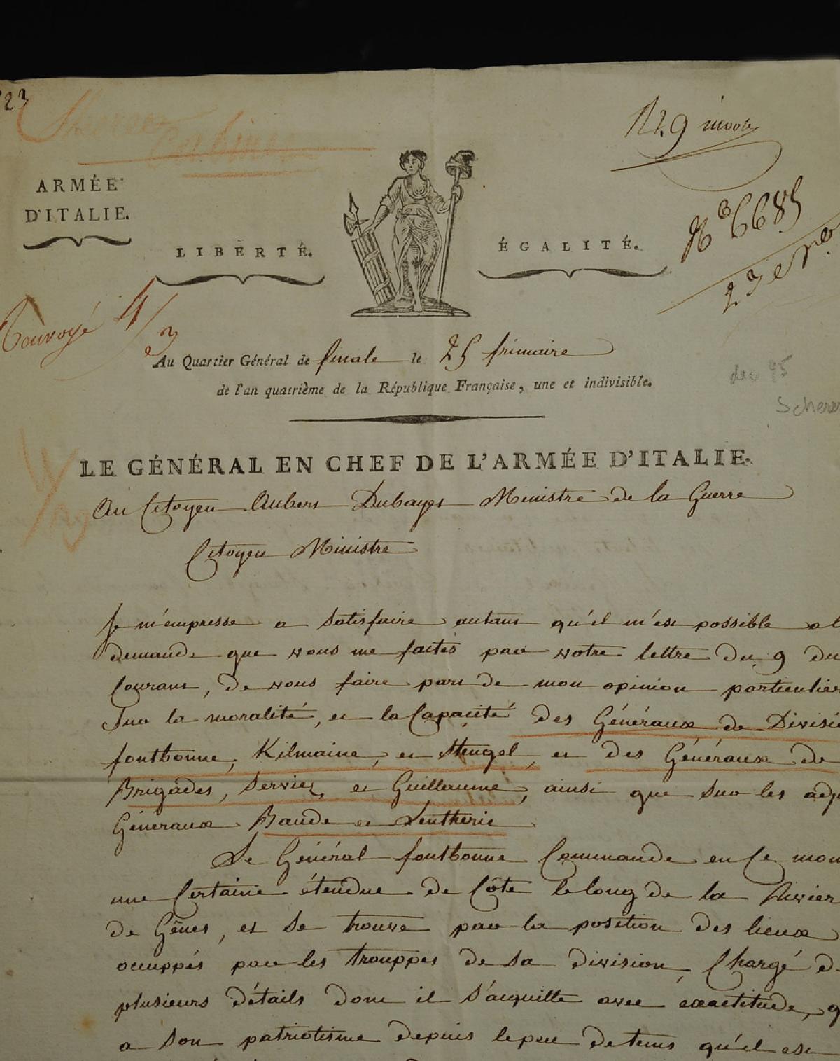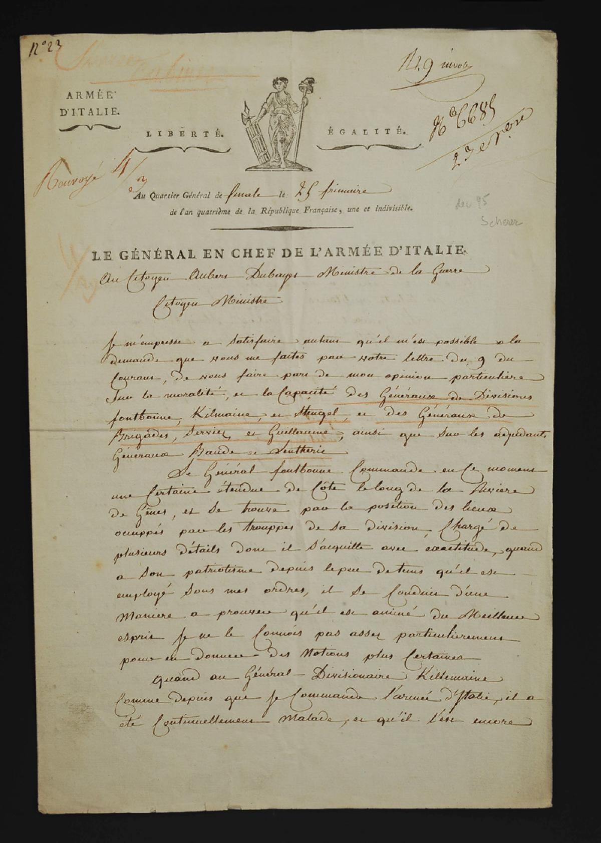 Intéressante lettre dans laquelle le général en chef de l'armée d'Italie Schérer répond au Ministre de la guerre Aubert Dubayet qui lui a demandé dans un courrier du 9 frimaire son opinion sur la moralité et la capacité de certains généraux de division (Fontbonne, Kilmaine, Stengel) et de brigade (Serviez et Guillaume), ainsi que sur les adjudants-généraux Baude et Lentherie.