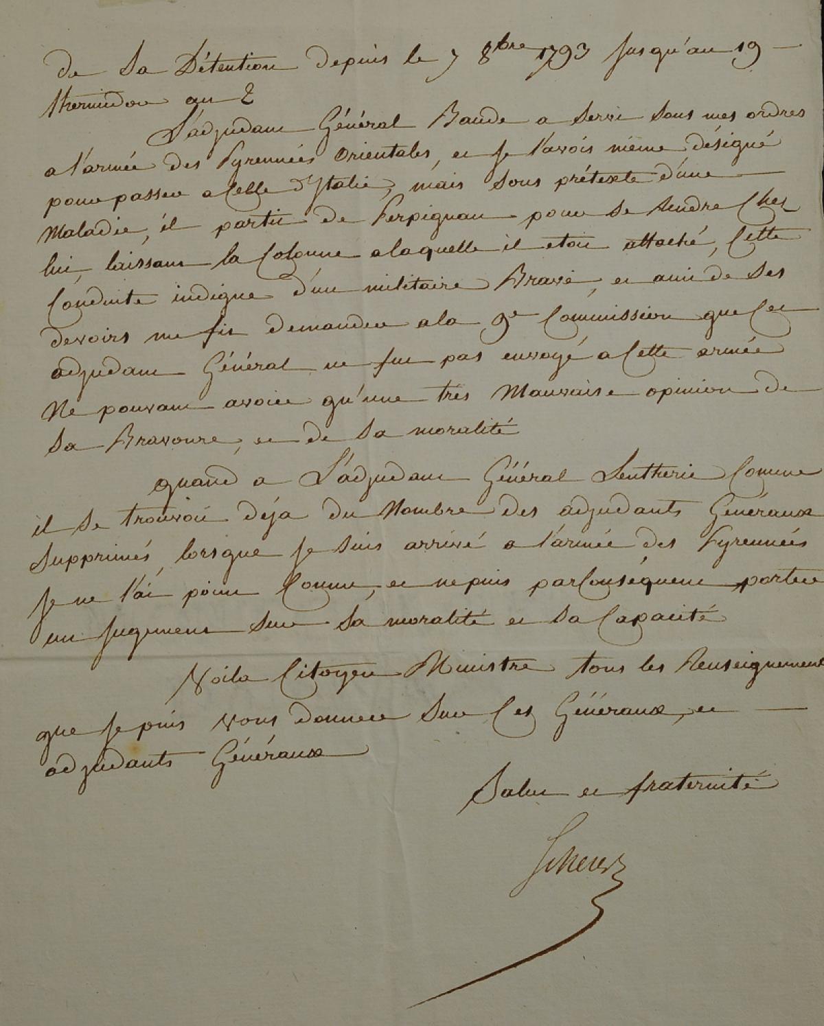... Adjudant-général Lutherie ... « comme il se trouvait déjà du nombre des adjudants généraux supprimés lorsque je suis arrivé à l'armée des Pyrénées je ne l'ai point connu et ne puis par conséquent porter un jugement sur sa moralité et sa capacité. »