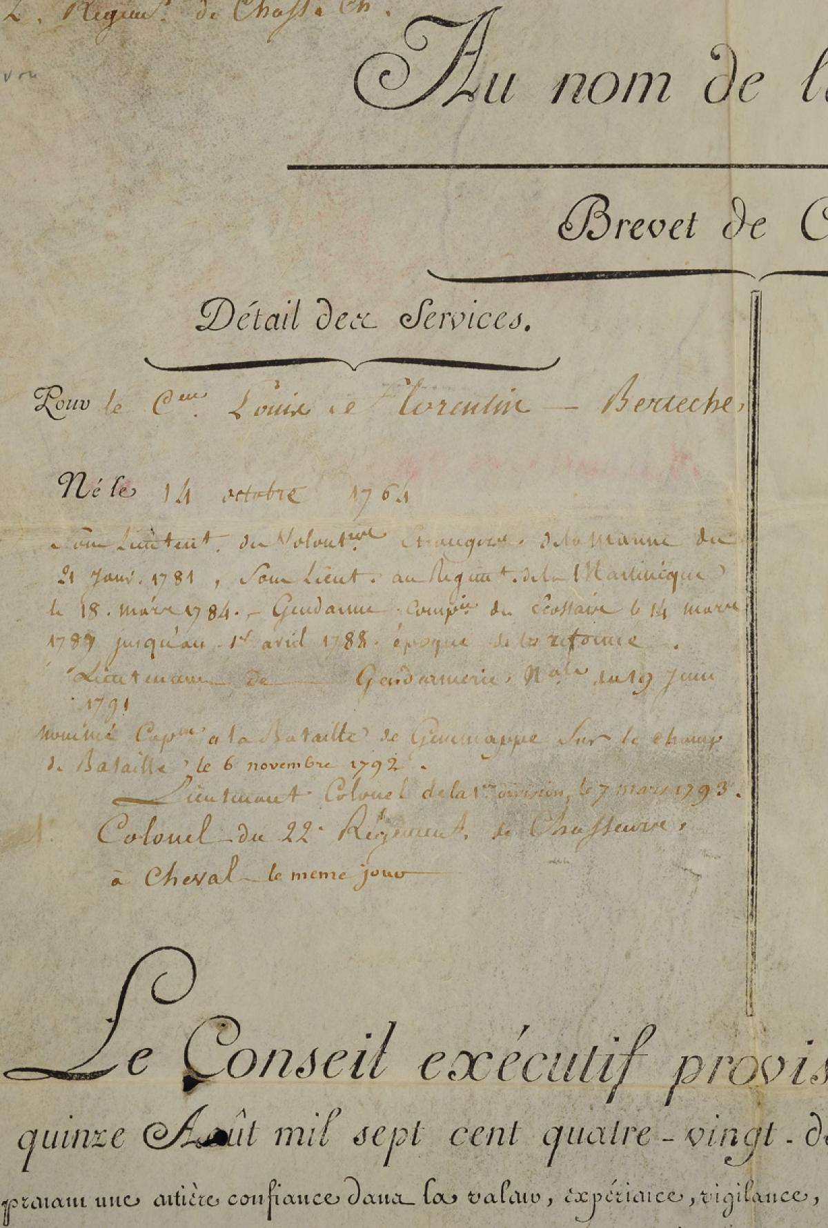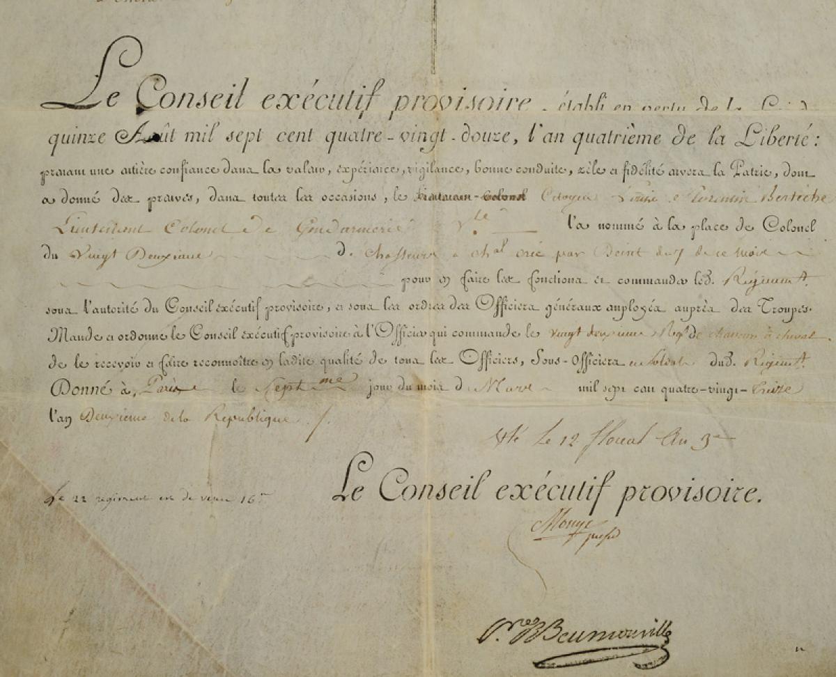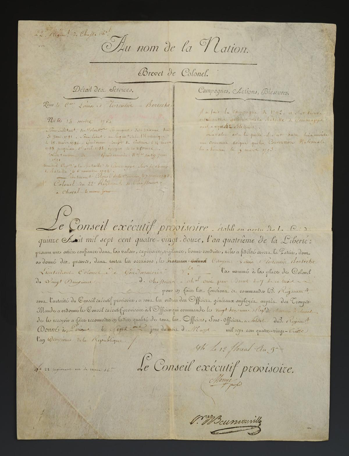 BREVET DE COLONEL DÉLIVRÉ PAR LE CONSEIL EXÉCUTIF PROVISOIRE AU CITOYEN LOUIS FLORENTIN BERTECHE nommé colonel au 22ème Régiment de Chasseurs à cheval, 12 floreal an 3 (1er mai 1795). 18915-7