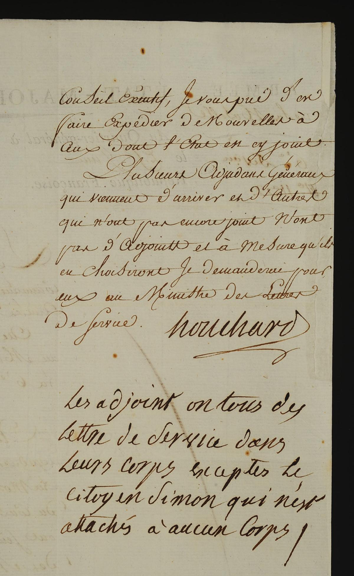 « Aucun des Adjoints aux adjudants généraux de l'Armée de la Moselle n'a de lettres de service du Conseil Exécutif Provisoire. Ils ont seulement des Commissions des Ministres ou des Généraux d'Armée ; La Loi dit qu'ils seront choisis par les Chefs des États-Majors sur la présentation des adjudants généraux. On avait pensé qu'il suffisait que les commissions d'adjoins soient données par les généraux d'Armée si elles doivent l'être par le Conseil Exécutif. Je vous prie d'en faire expédier de nouvelles à ceux dont l'Etat est cy-joint.