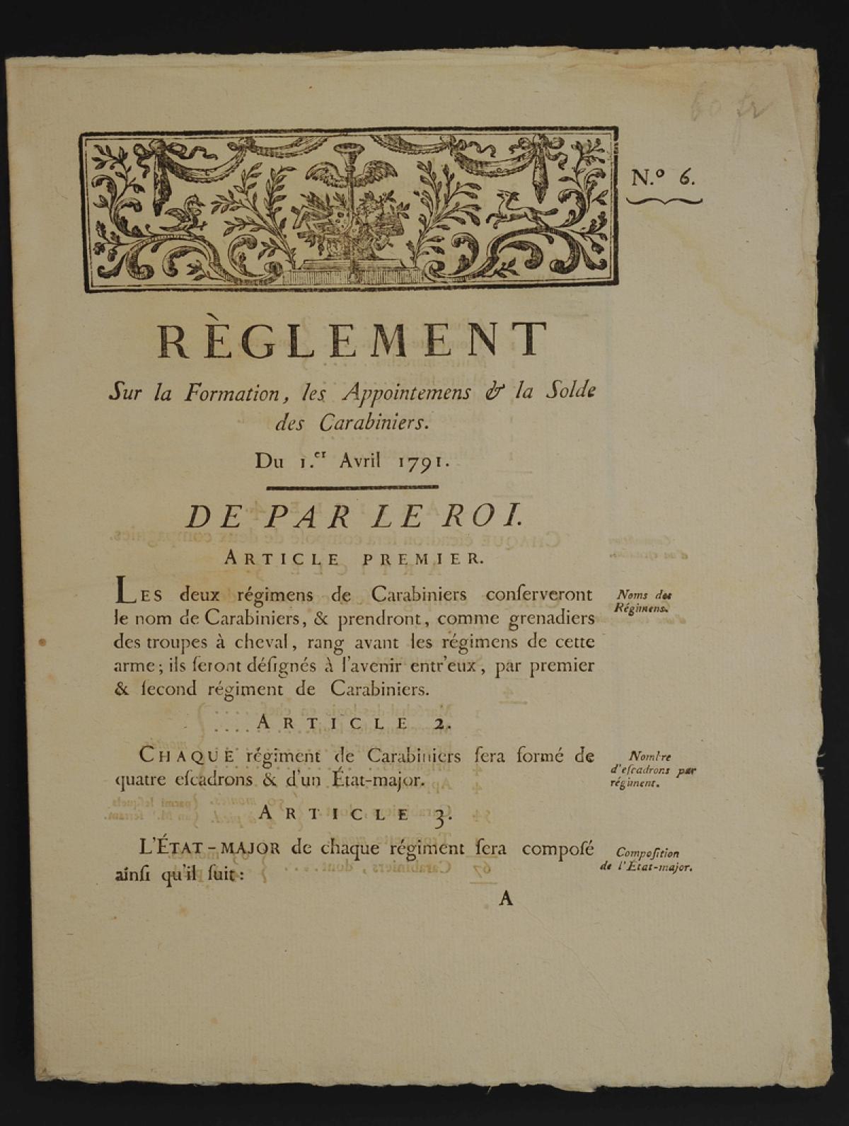 - Belle vignette rectangulaire. Pièce « N° 6 ». RÈGLEMENT SUR LA FORMATION, LES APPOINTEMENTS & LA SOLDE DES CARABINIERS DU 1er AVRIL 1791 DE PAR LE ROI. Feuillets doubles, 11 pages imprimées. 29 articles.