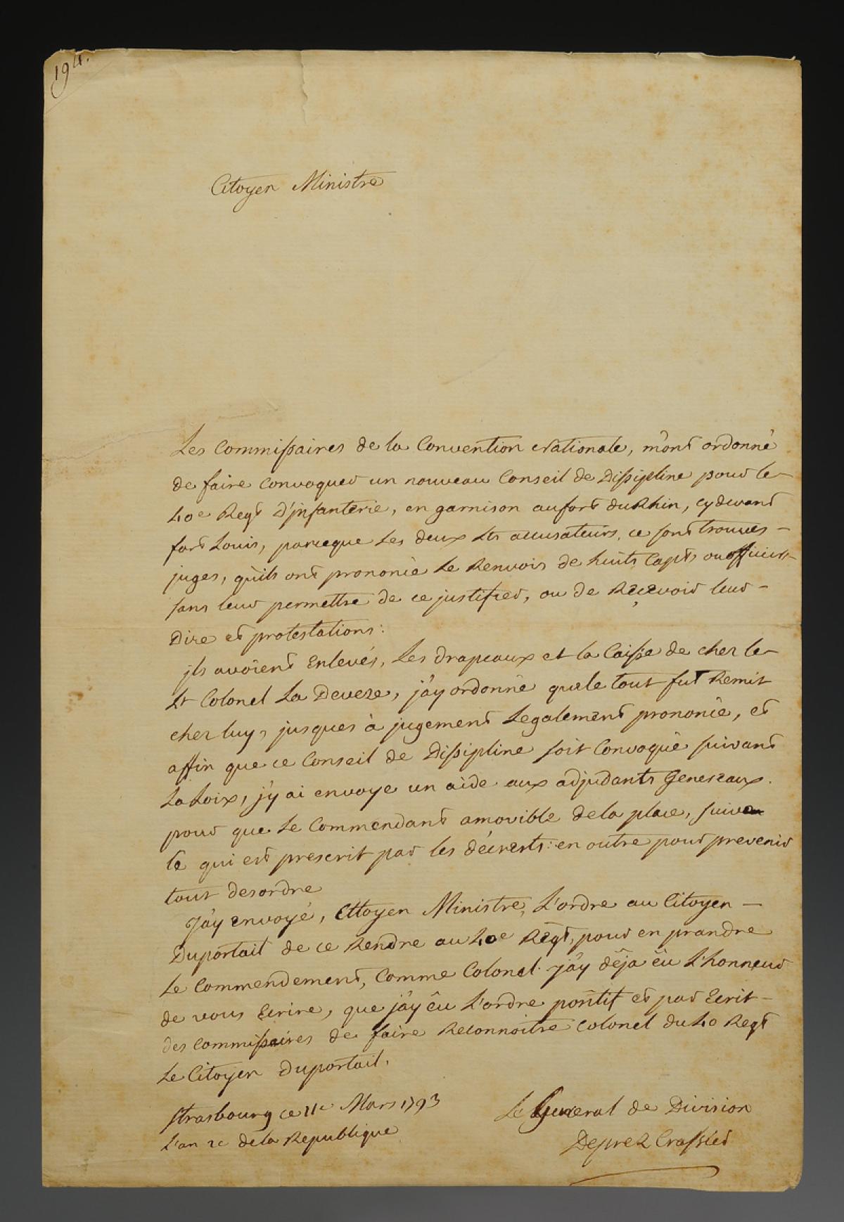 40ème Régiment d'Infanterie. LETTRE AUTOGRAPHE SIGNÉE DE PREZ DE CRASSIER, commandant en chef l'Armée du Rhin, adressée au Ministre de la Guerre, Strasbourg 11 mars 1793. 18915-20