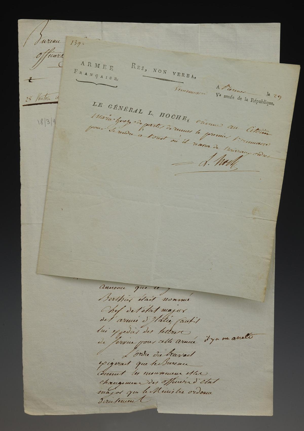 Lot de deux documents datés 1796 : Ordre du 29 vendémiaire an (19 février 1796) signé L. HOCHE donné à M. HOCHE de se rendre à Brest ; une liste des demandes à faire au Ministre établie par le Bureau des officiers Généraux, datée 28 ventôse an 4 (18 mars 1796). 18915-25