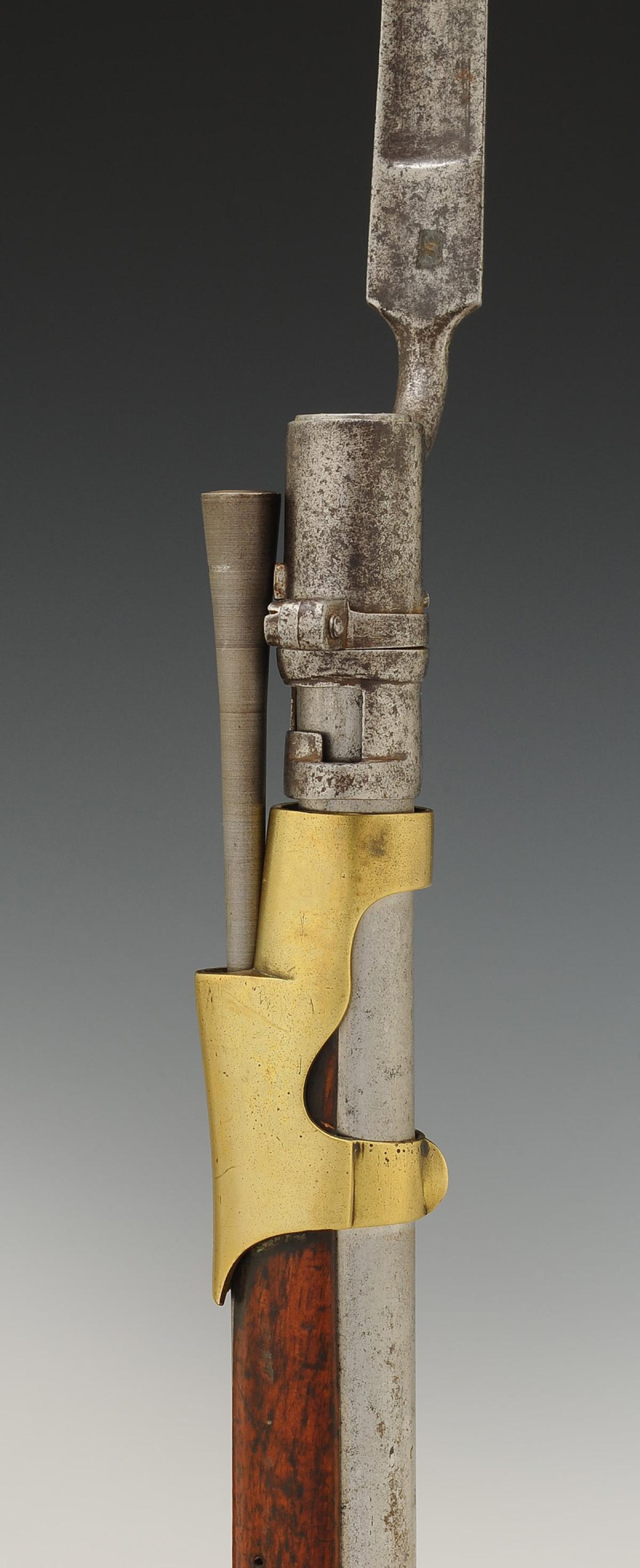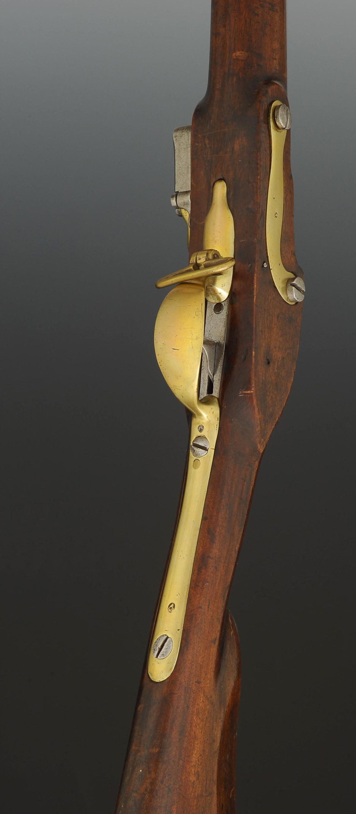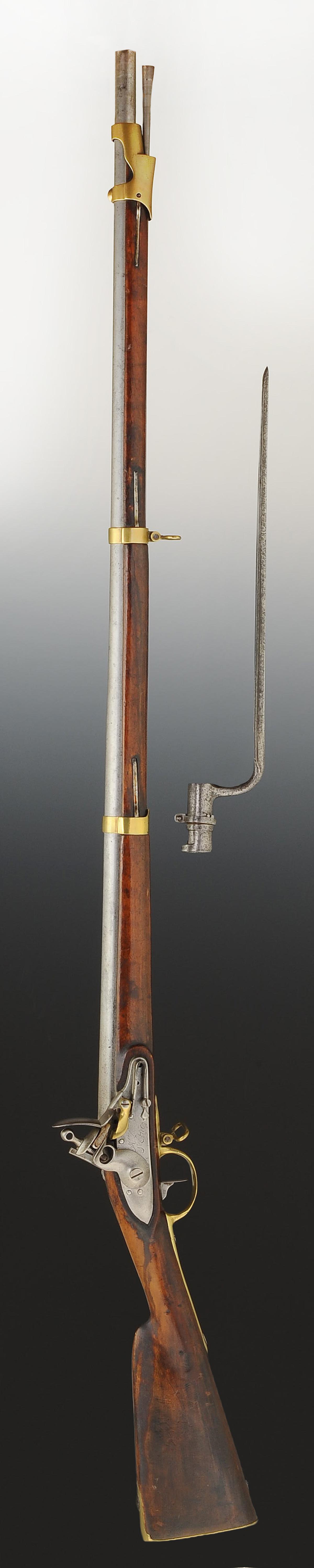 Canon à pans latéraux puis rond, longueur 102,7 cm, longueur avec la queue de culasse 108 cm. Embouchoir, grenadière, capucine, pontet et sous-garde, plaque de couche, contre-platine en laiton. Grenadière, sous-garde, plaque de couche et contre-platine poinçonnées d'un « D » sous bonnet phrygien. Monture en noyer, crosse à joue. Platine à silex signée « Mre Royle St Etienne ». Baguette en fer.