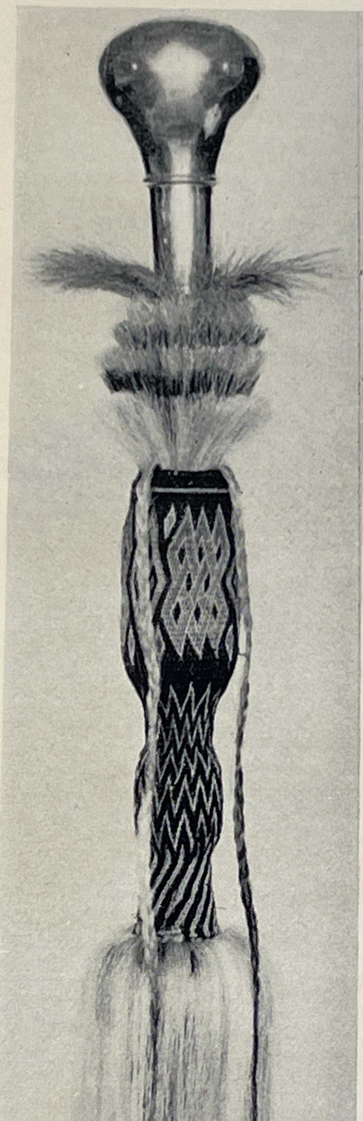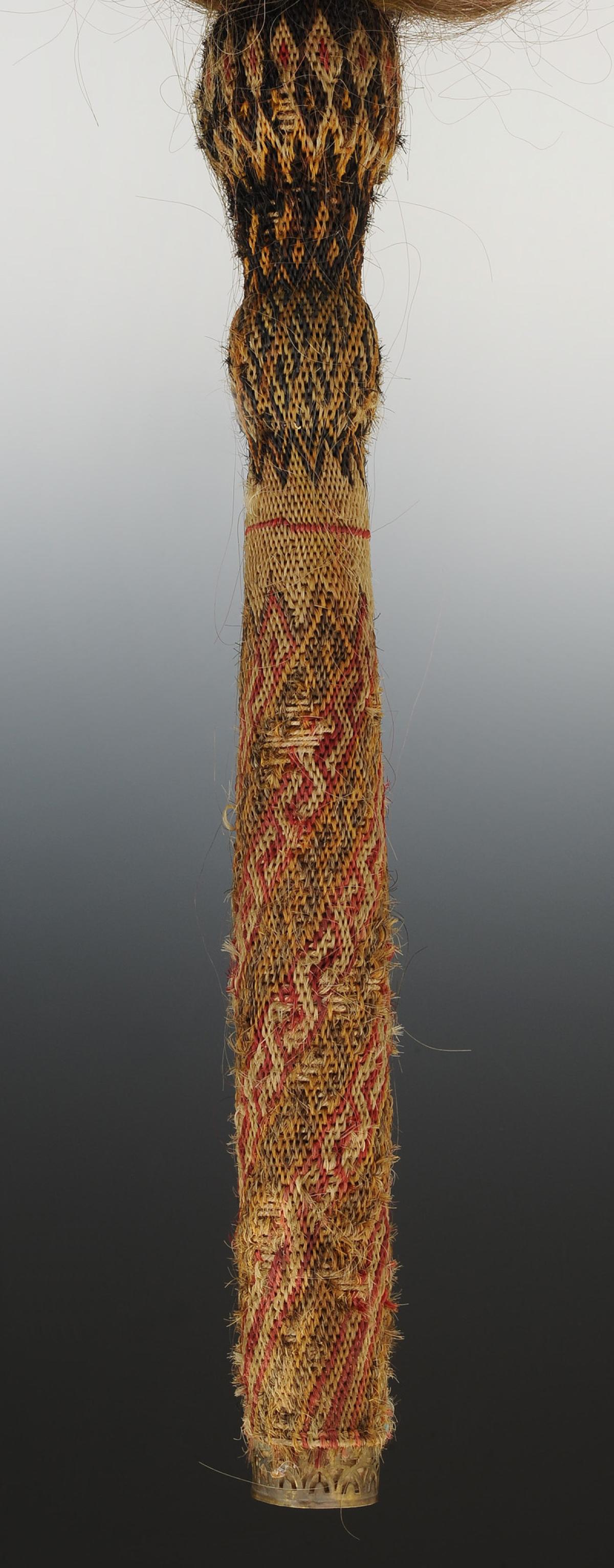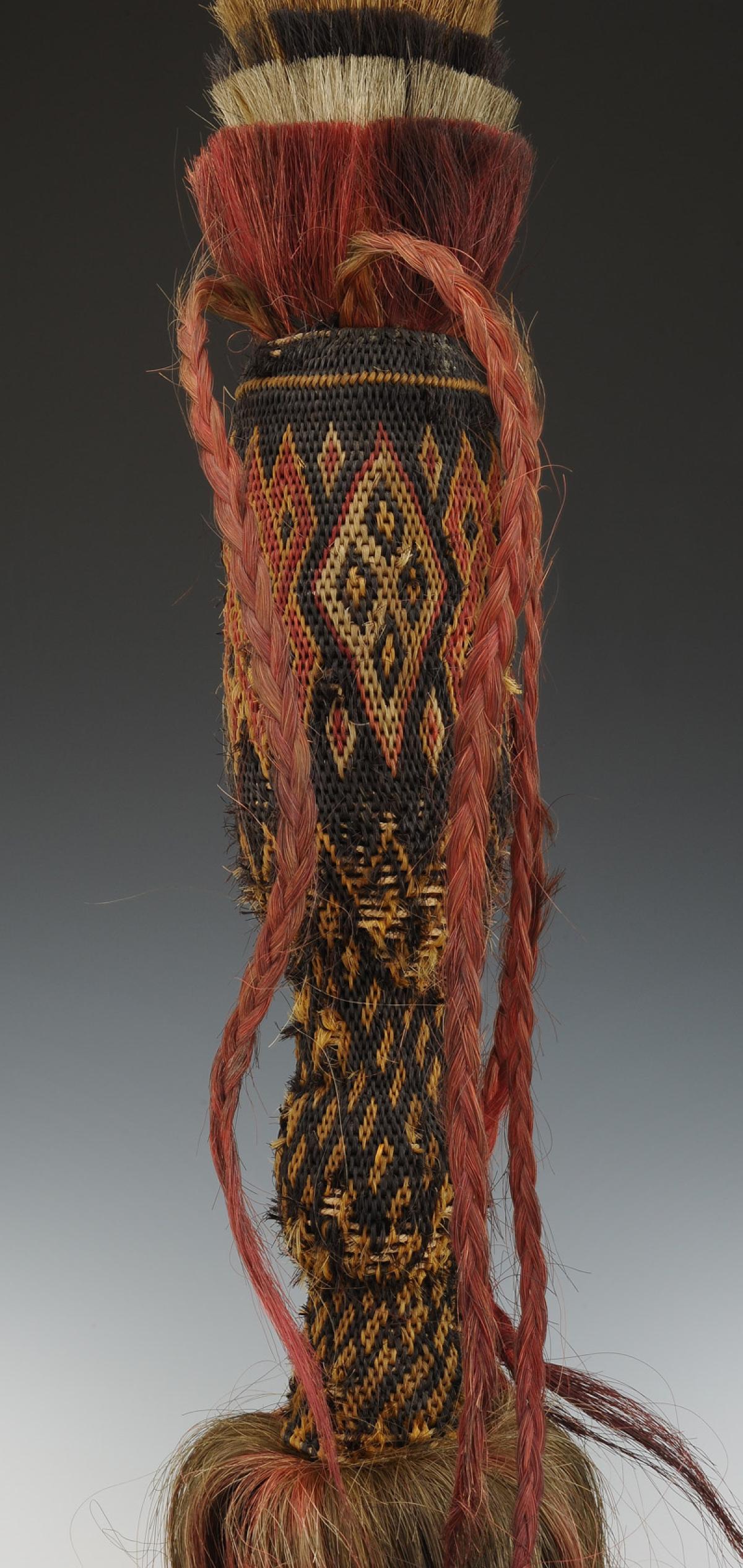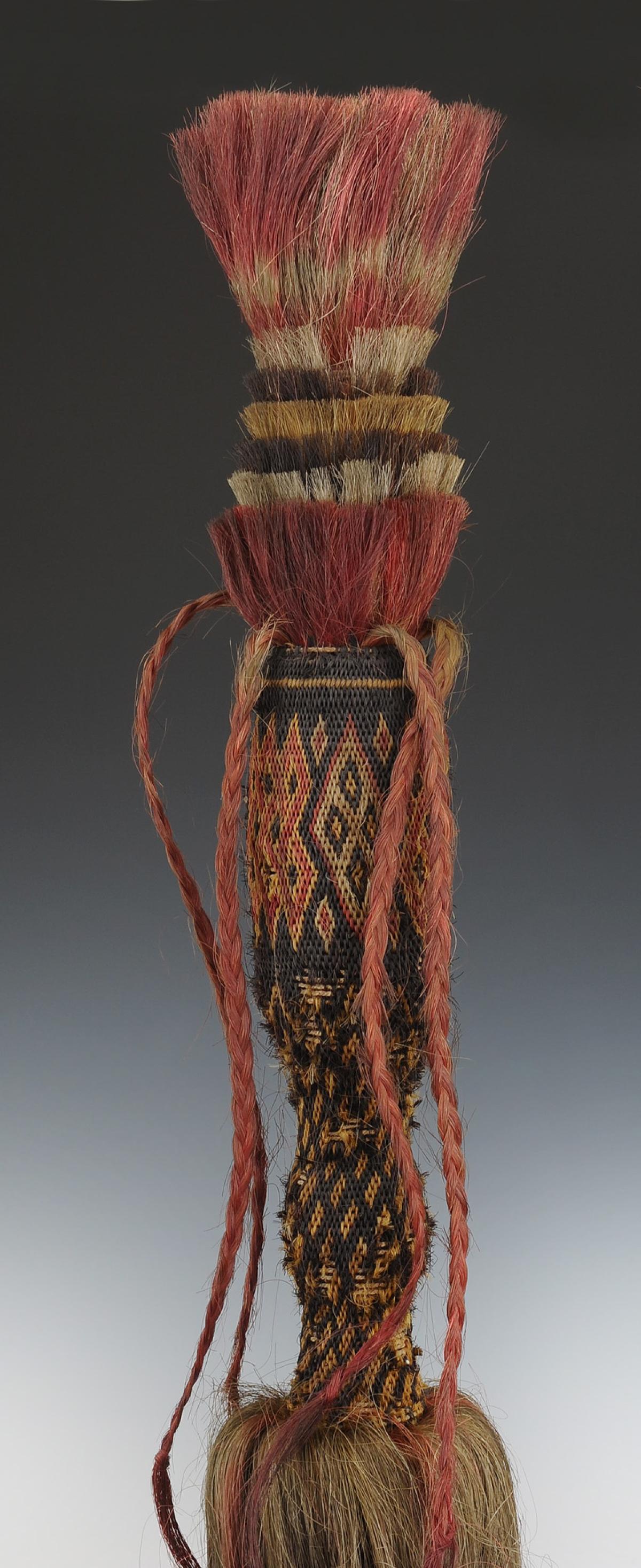 Mât en bois creux avec à sa base une bague en laiton au décor ajouré, Ø 5,4 cm, entièrement recouvert d'un tissage de crins de cheval à motif géométrique répétitif, en spirales dans sa partie basse. La partie haute est ornée de touffes de crins de cheval teints écarlate-blanc-jaune-noir. À la base de ces touffes, sont fixées cinq tresses retombantes de crins écarlates. À la. moitié du mât, sont fixés des crins blancs et écarlates retombants.