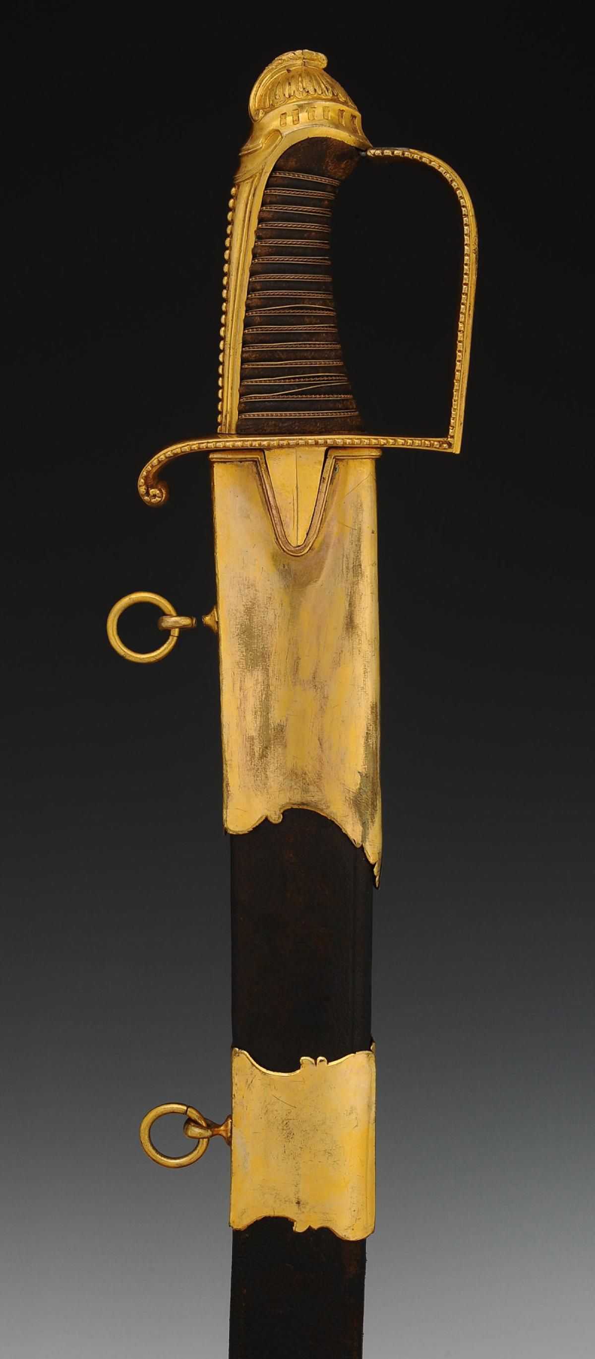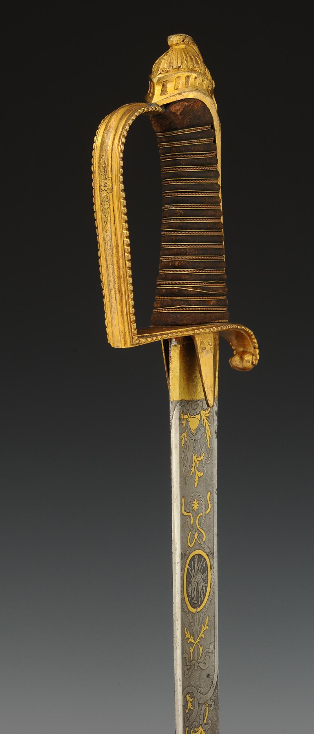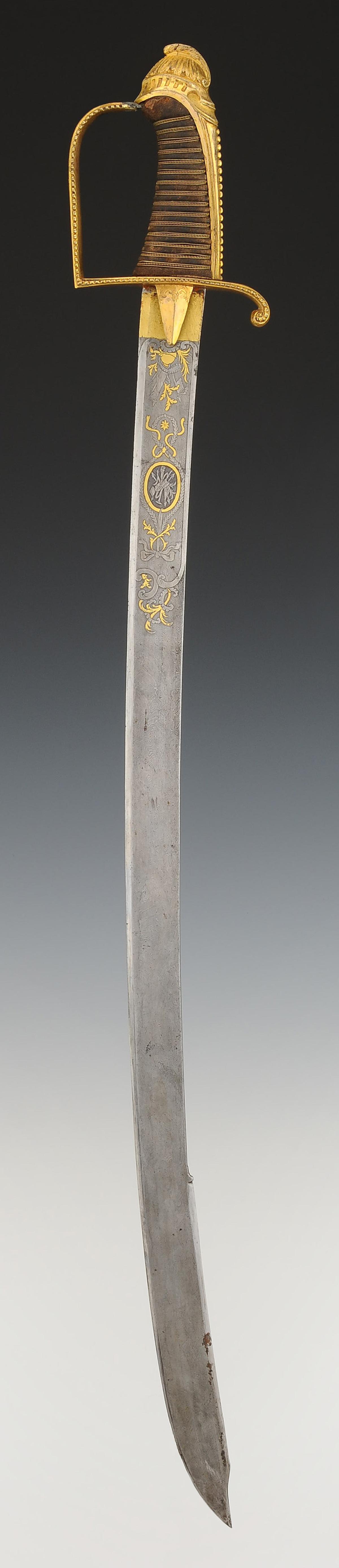 Monture en laiton doré. Garde à une branche moulurée en relief, aux bords perlés, gravée de feuillages. Calotte à longue queue pareillement décorée à la branche de garde avec pommeau en forme de casque à l'antique. Oreillons de forme triangulaire, l'oreillon avant est gravé de rinceaux. Lame légèrement courbe à pans creux en damas, décorée sur son premier tiers en poli miroir et doré de trophées militaires, bouquets de fleurs, casques empanachés, faisceau de licteurs, rubans et rinceaux. Longueur de la lame 79 cm, largeur au talon 4 cm.