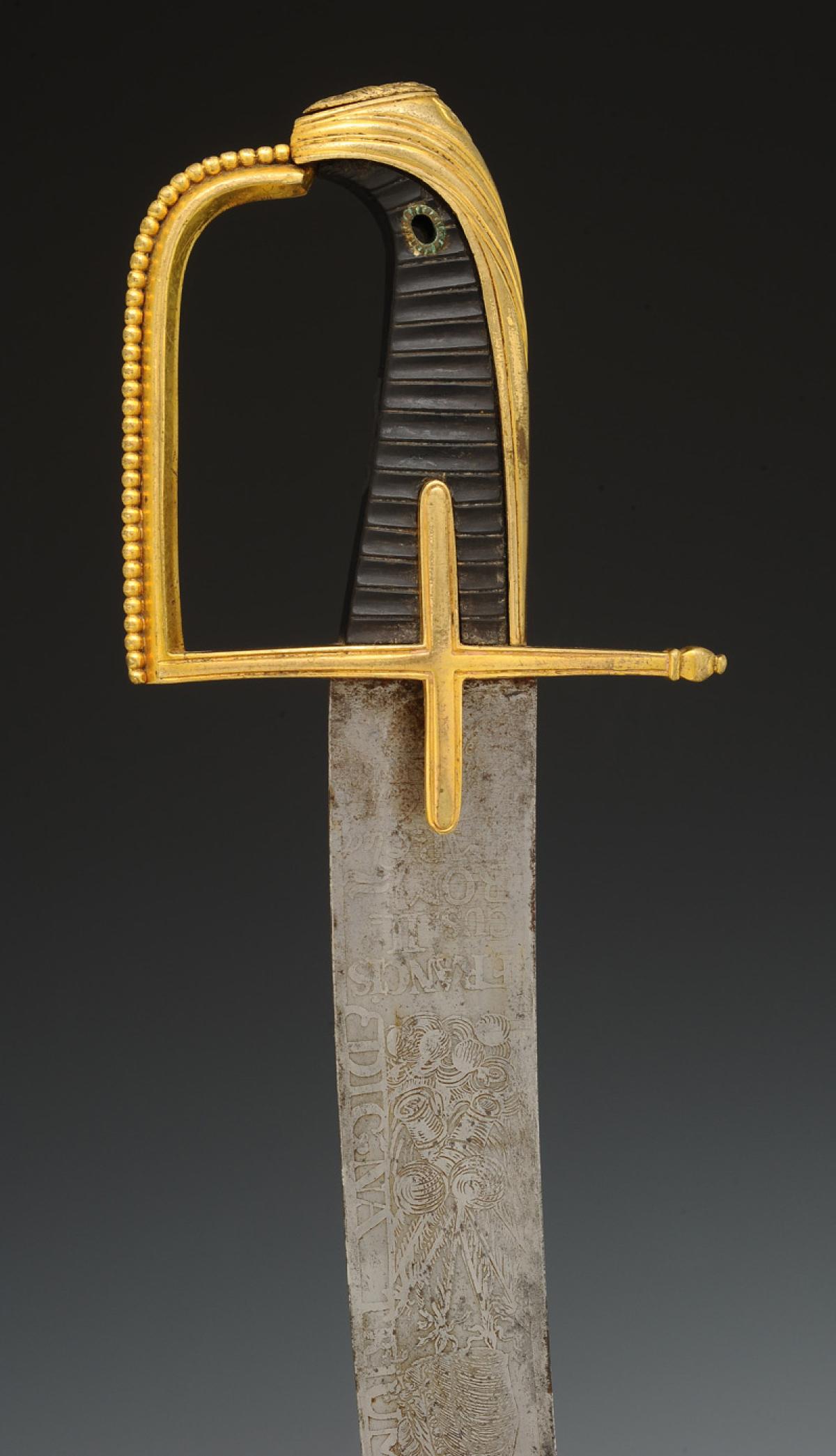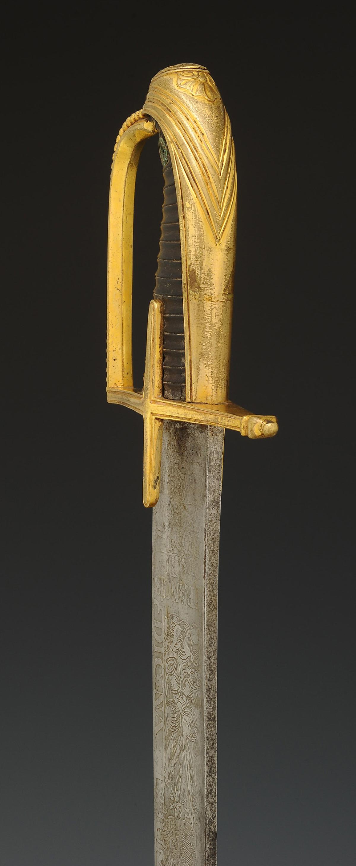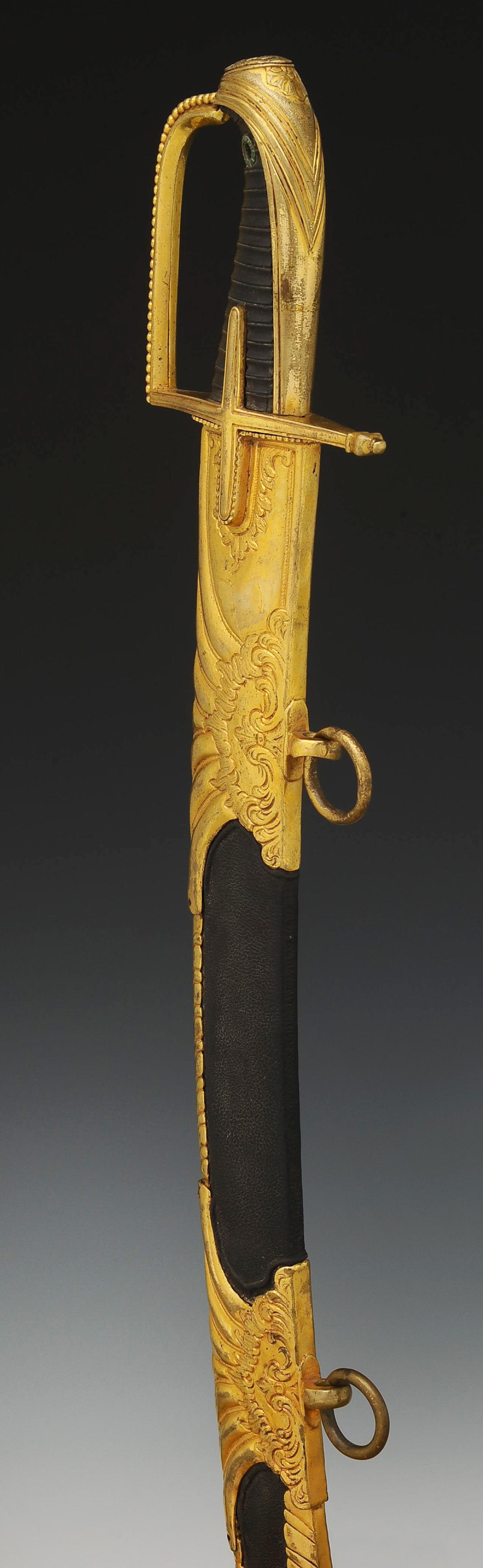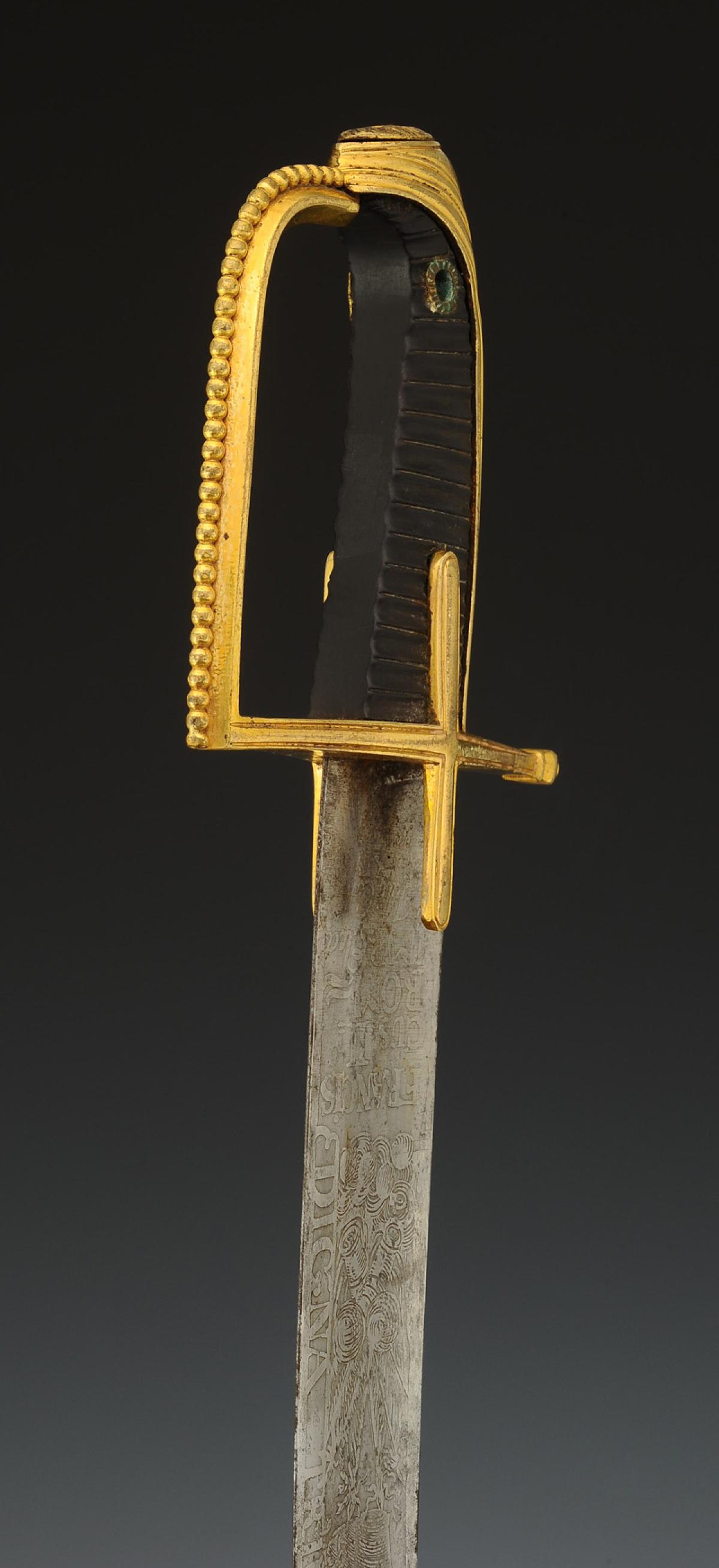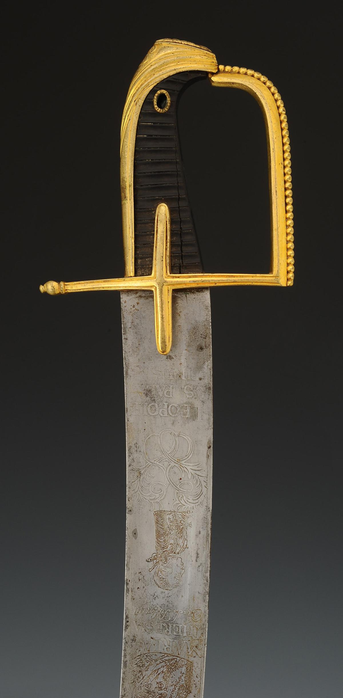 Monture en bronze doré. Garde à une branche à la hongroise. Croisière décorée aux traits avec quillon droit. Branche de garde perlée. Calotte à longue queue décorée aux traits et d'une coquille Saint Jacques en partie haute. Pommeau aux armes de l'Empire Autrichien. Poignée d'ébène sculptée imitant un filigrane, avec perforation transversale permettant le passage du cordon de la dragonne près du pommeau.