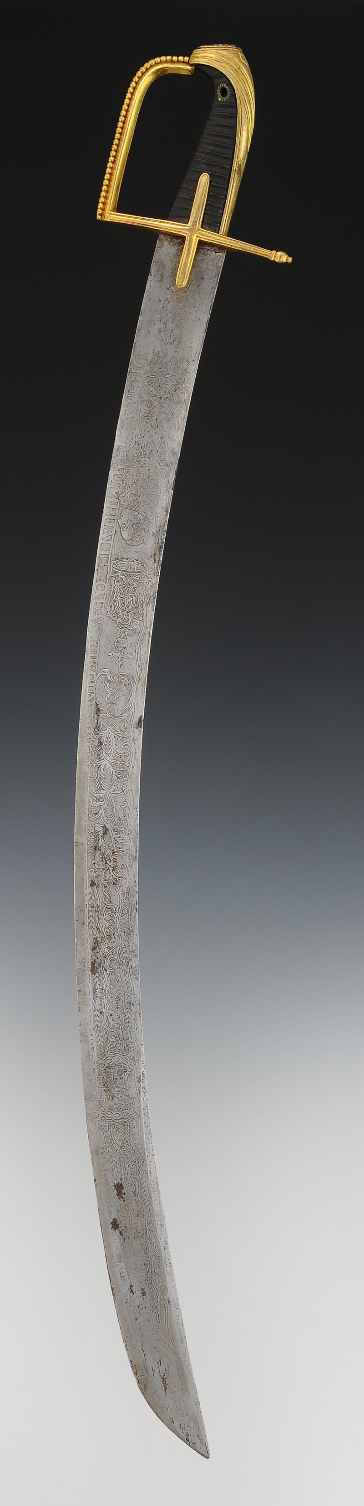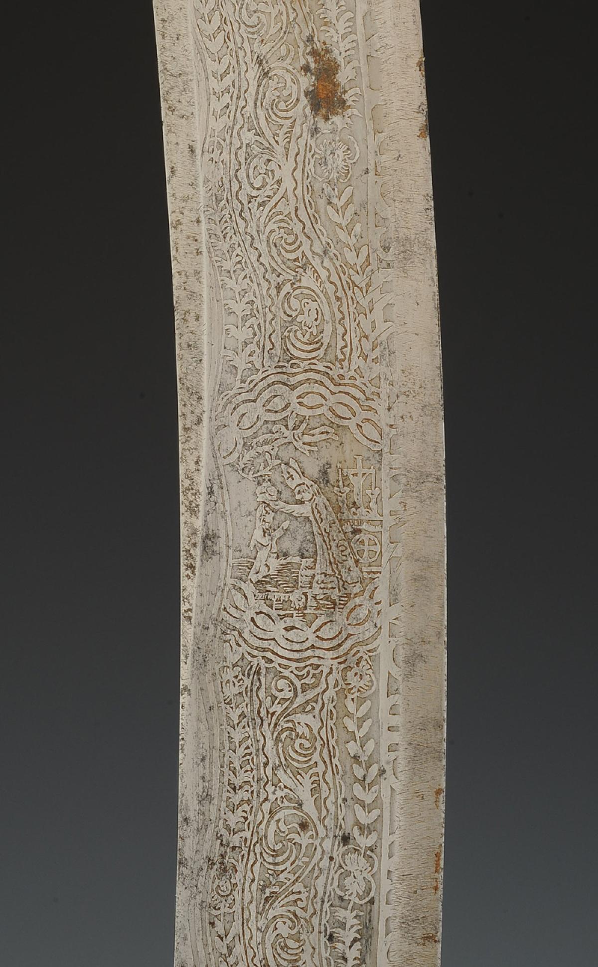 Large lame courbe à pans creux en damas, richement gravée à l'acide sur toute sa longueur. Longueur de la lame 80,4 cm, largeur au talon 4,5 cm.