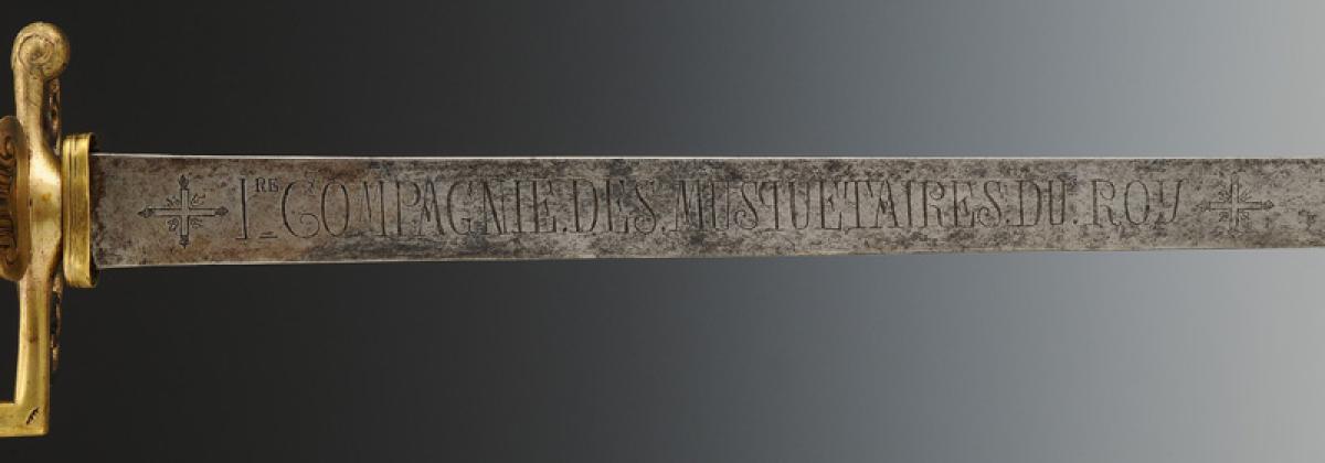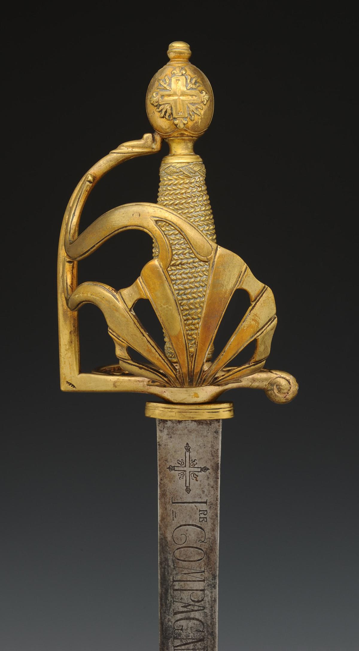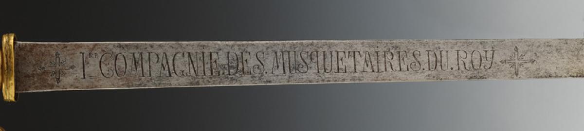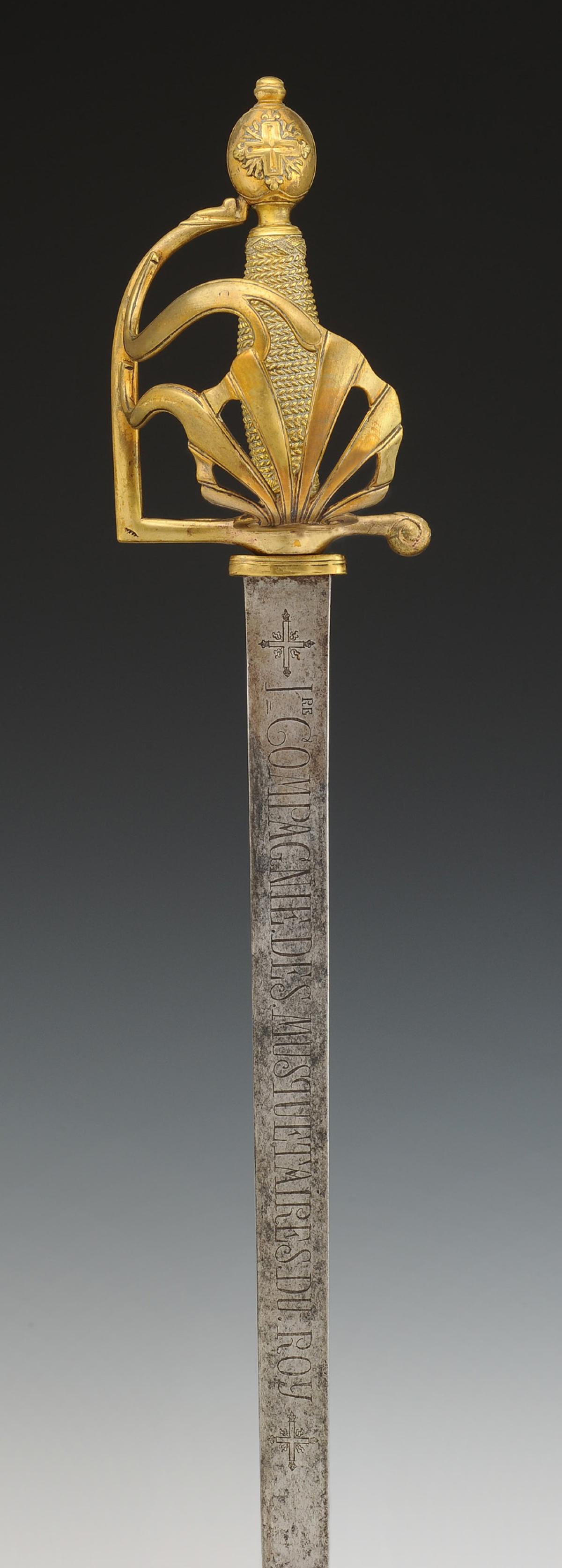 Monture en laiton fondu et doré à coquille ajourée, croisière à couvre-chape, poucier à coquille et antennes, quillon en crosse. Fusée fondue imitant le filigrane. Pommeau orné sur chaque face de la croix des Mousquetaires à trois flammes d'angles. H de la monture 15,4 cm. Lame plate gravée de chaque côté « 1re COMPAGNIE.DES.MUSQUETAIRES.DU.ROY », inscription encadrée de chaque côté de la croix des Mousquetaires gravée. Longueur de la lame 91,5 cm.