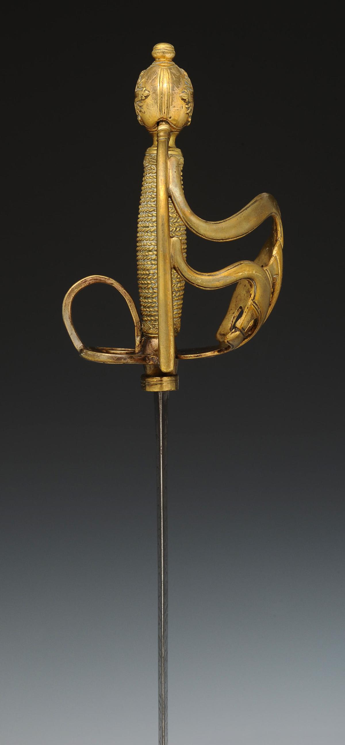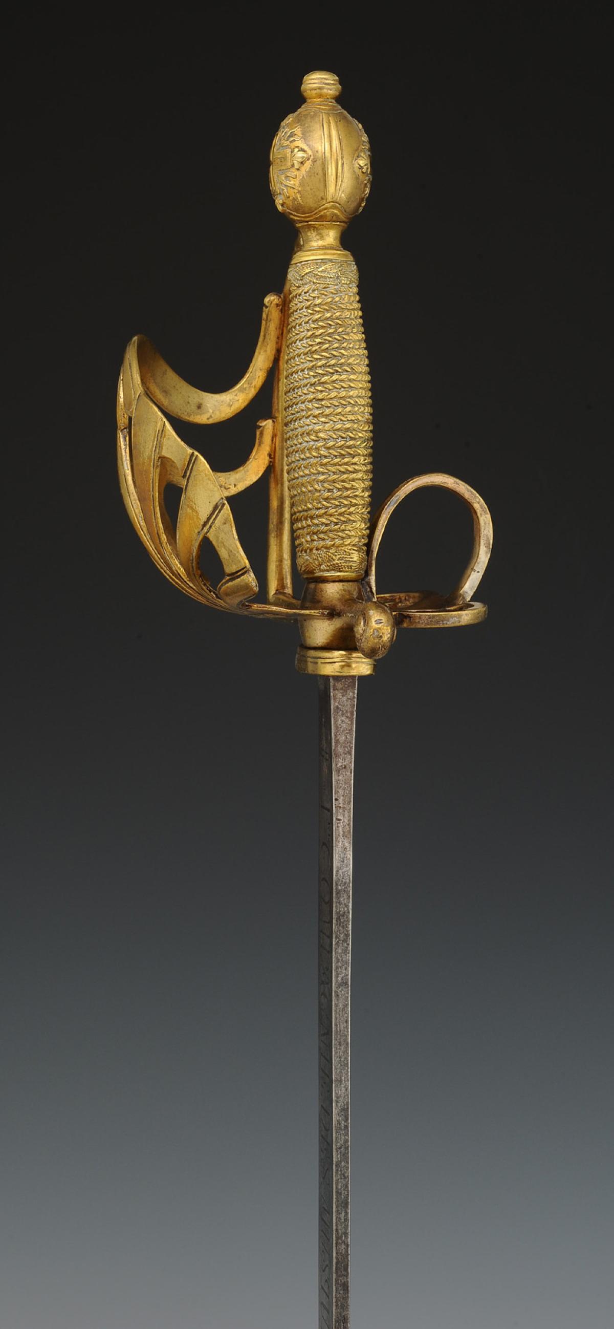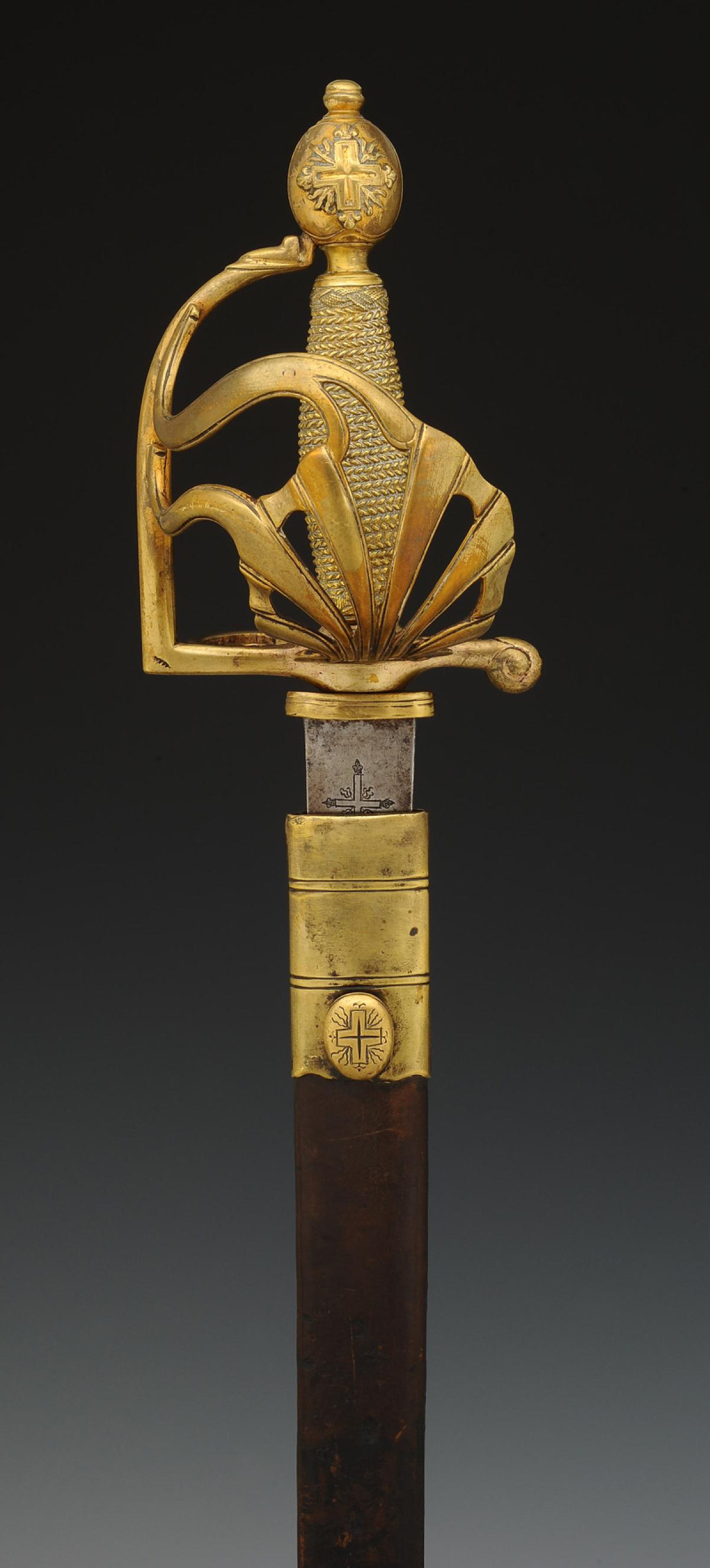Monture en laiton fondu et doré à coquille ajourée, croisière à couvre-chape, poucier à coquille et antennes, quillon en crosse. Fusée fondue imitant le filigrane. Pommeau orné sur chaque face de la croix des Mousquetaires à trois flammes d'angles. H de la monture 15,4 cm. Lame plate gravée de chaque côté « 1re COMPAGNIE.DES.MUSQUETAIRES.DU.ROY », inscription encadrée de chaque côté de la croix des Mousquetaires gravée. Longueur de la lame 91,5 cm.