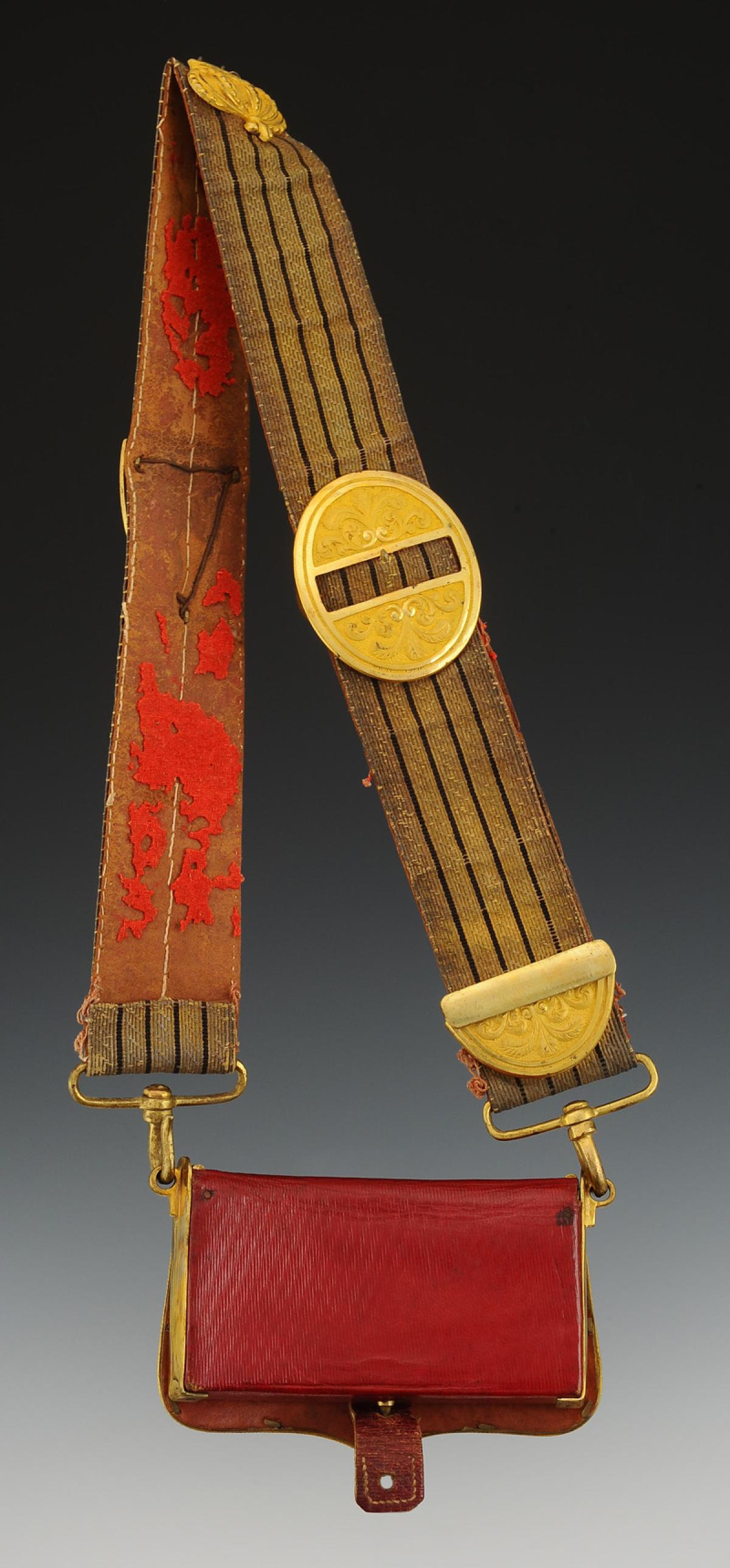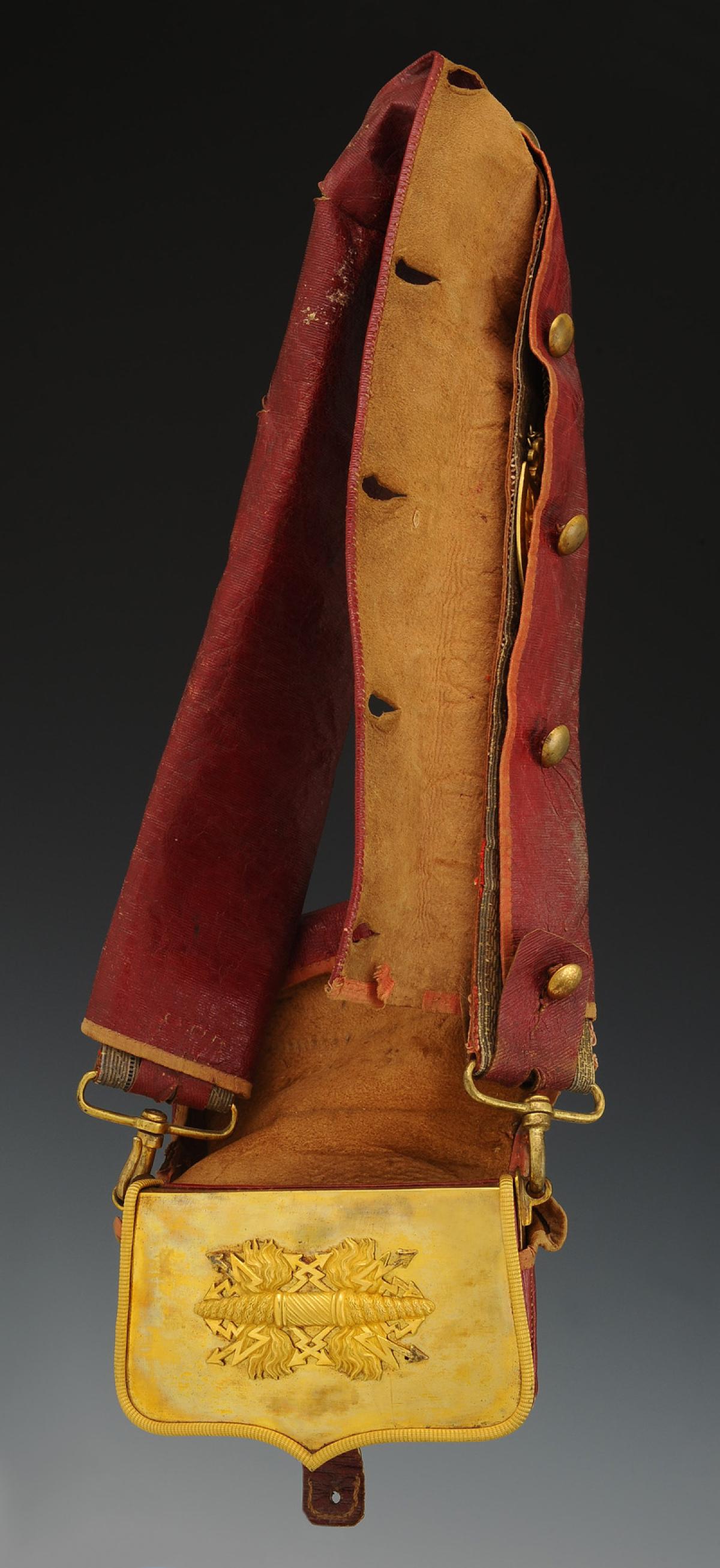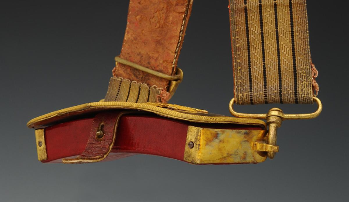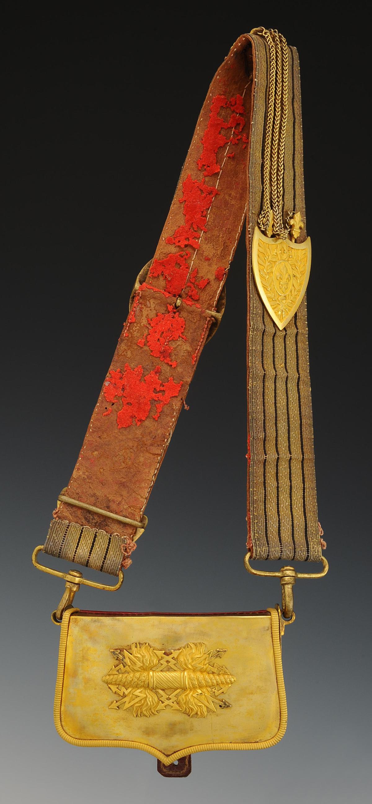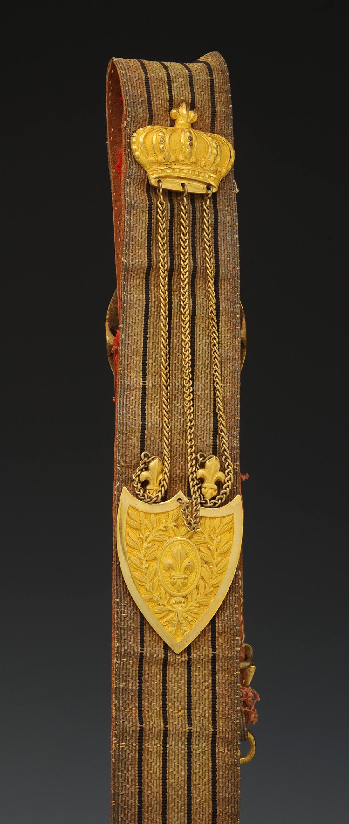 Banderole en cuir doublé d'un drap écarlate, recouvert d'un galon en fils d'argent doré à quatre raies de soie noire, largeur 5 cm. Toutes garnitures en laiton doré. Un écu décoré de deux branches de laurier encadrant un médaillon à fleur de lys, surmonté d'une grande couronne royale estampée, tous deux reliés au moyen de trois chaînettes gourmettes dont deux terminés par une fleur de lys. Un fleuron termine la banderole, une boucle de forme ovale, tous deux décorés de plumes et un coulant lisse. Deux boucles avec chacune un crochet d'attache.