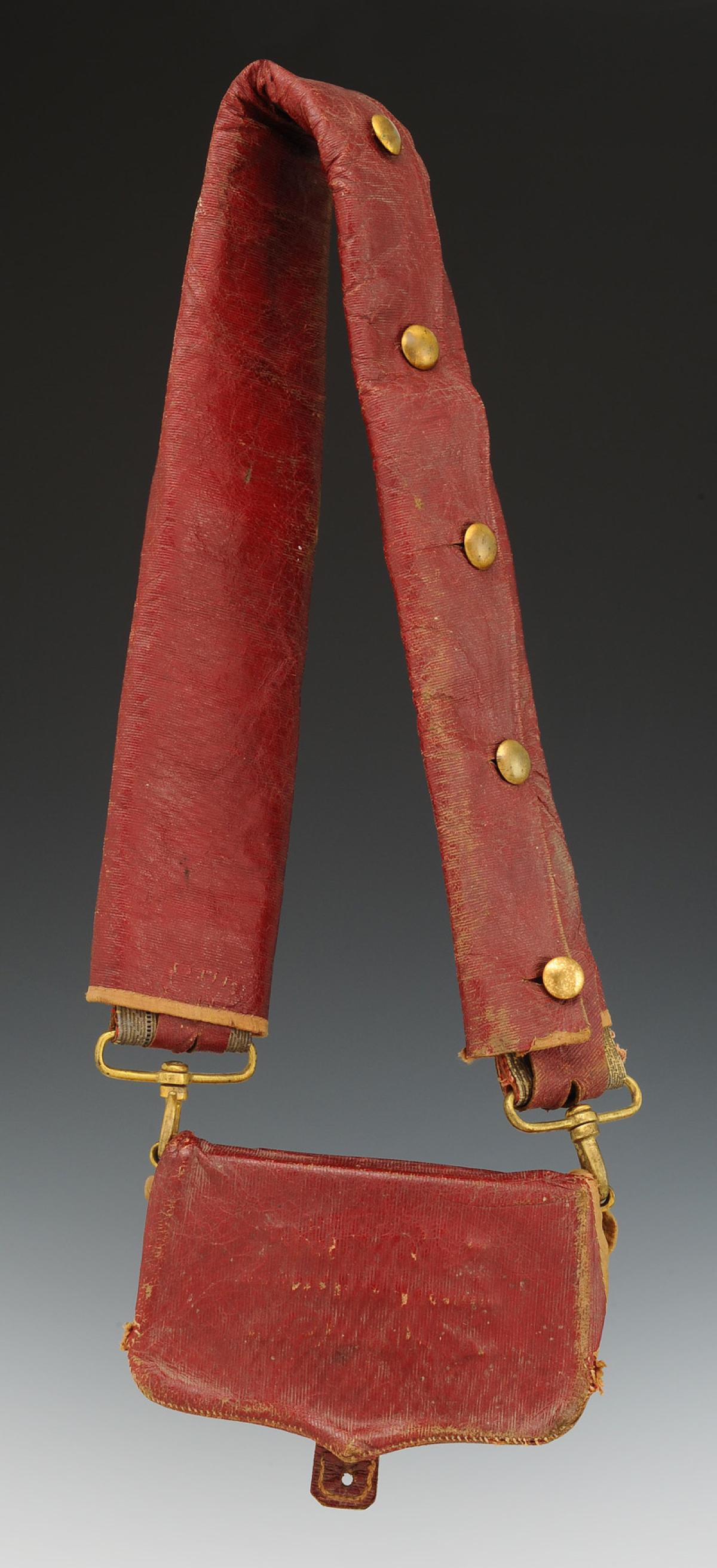 Coffret en bois gainé de maroquin à long grain ciré bordeaux et garni sur ses flancs de plaques de laiton doré au sommet desquelles est fixé un anneau destiné à recevoir les crochets de suspension de la banderole, H du coffret 7,5 cm, largeur 13,5 cm.