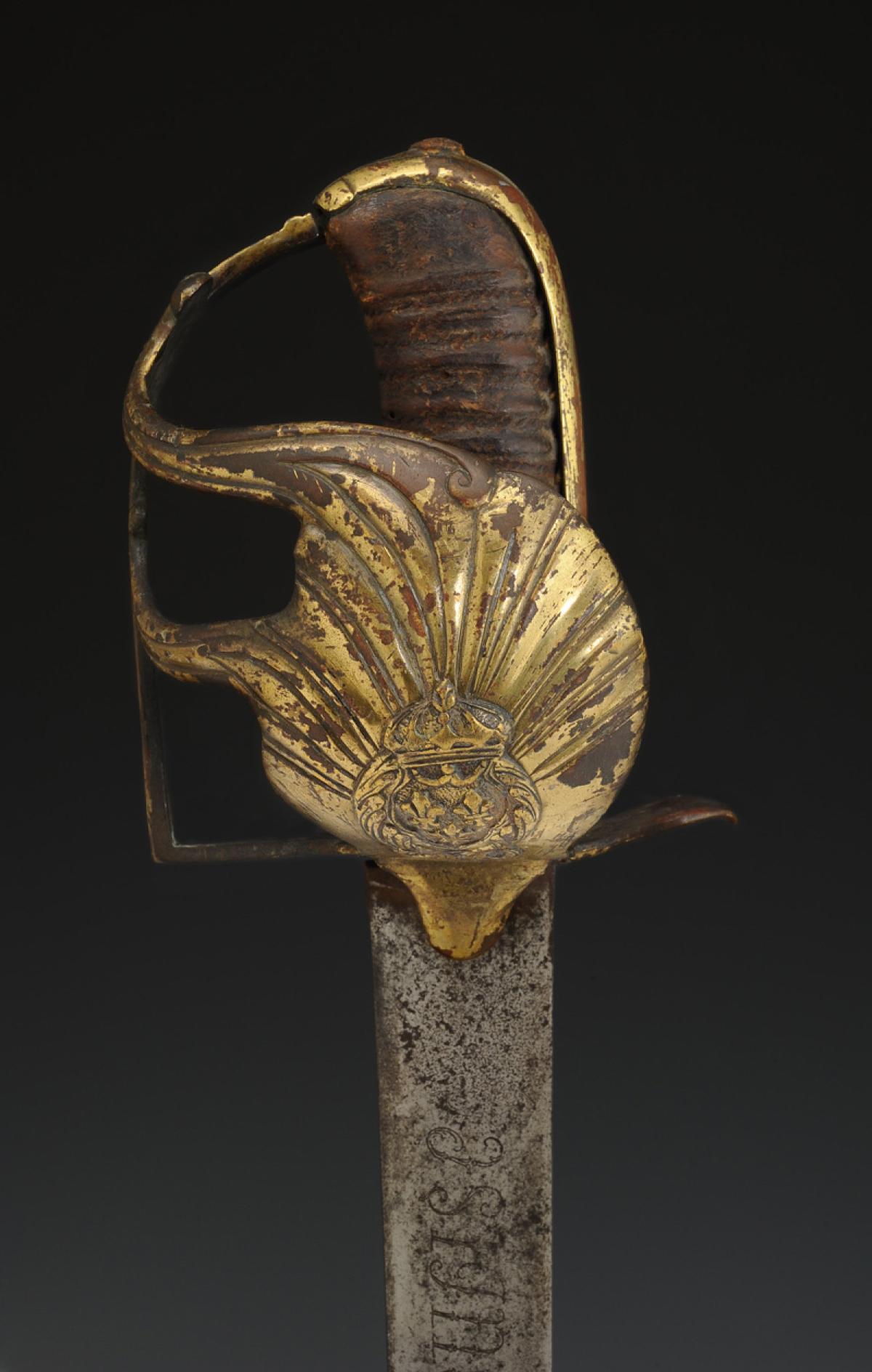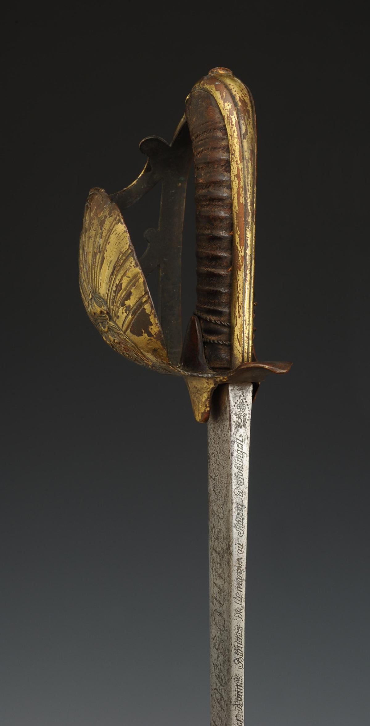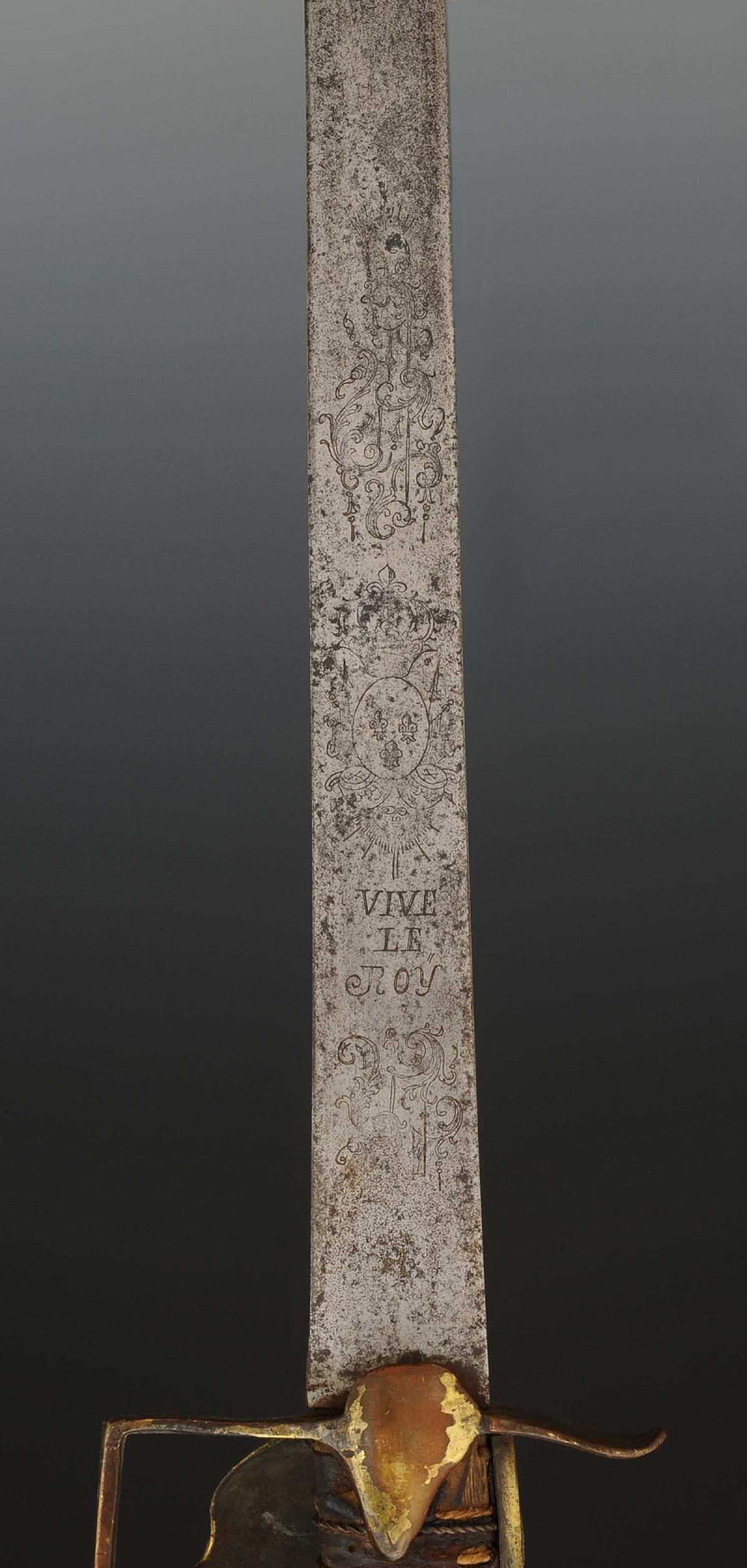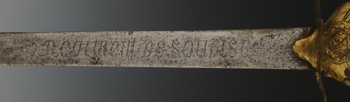 Monture en bronze doré sur le modèle des sabres de carabiniers et grenadiers à cheval 1755-1770. Garde à trois branches formant une coquille décorée des armes de France sur fond rayonnant, calotte à longue queue, poignée en bois recouvert de veau ciré noir. Lame droite et plate, dos signé « B. Daniel Kirschbaum Manufacturier d’armes Blanches De la marque au Raisin a Solingen », gravée sur la face avant en lettres capitales et cursives « REGIMENT DE SOUBISE », et, sur l’autre face des armes de France surmontant l’inscription « VIVE LE ROY », le tout encadré de corolles de feuillages, longueur de la lame 96,5 cm.