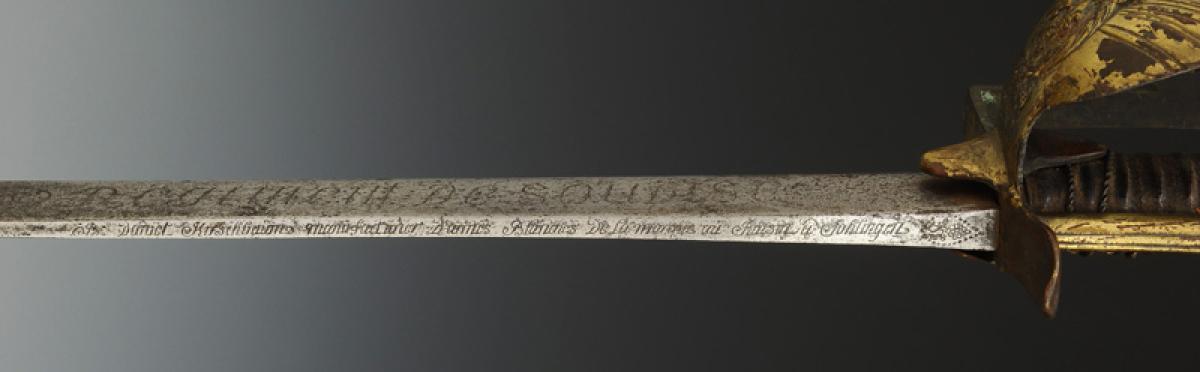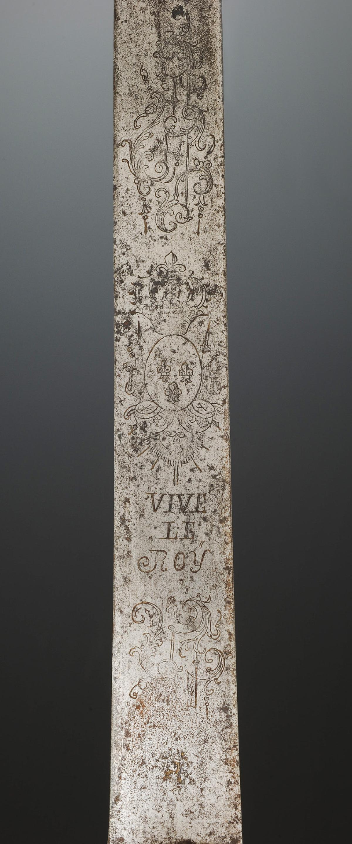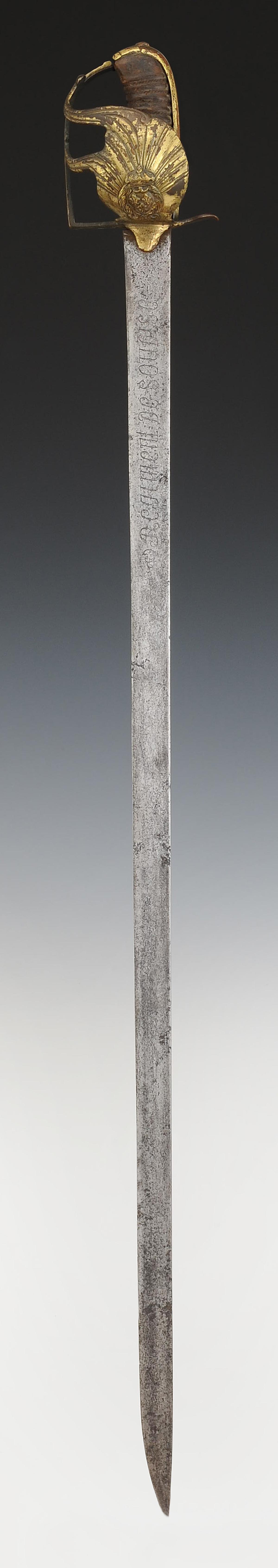 Monture en bronze doré sur le modèle des sabres de carabiniers et grenadiers à cheval 1755-1770. Garde à trois branches formant une coquille décorée des armes de France sur fond rayonnant, calotte à longue queue, poignée en bois recouvert de veau ciré noir. Lame droite et plate, dos signé « B. Daniel Kirschbaum Manufacturier d’armes Blanches De la marque au Raisin a Solingen », gravée sur la face avant en lettres capitales et cursives « REGIMENT DE SOUBISE », et, sur l’autre face des armes de France surmontant l’inscription « VIVE LE ROY », le tout encadré de corolles de feuillages, longueur de la lame 96,5 cm.
