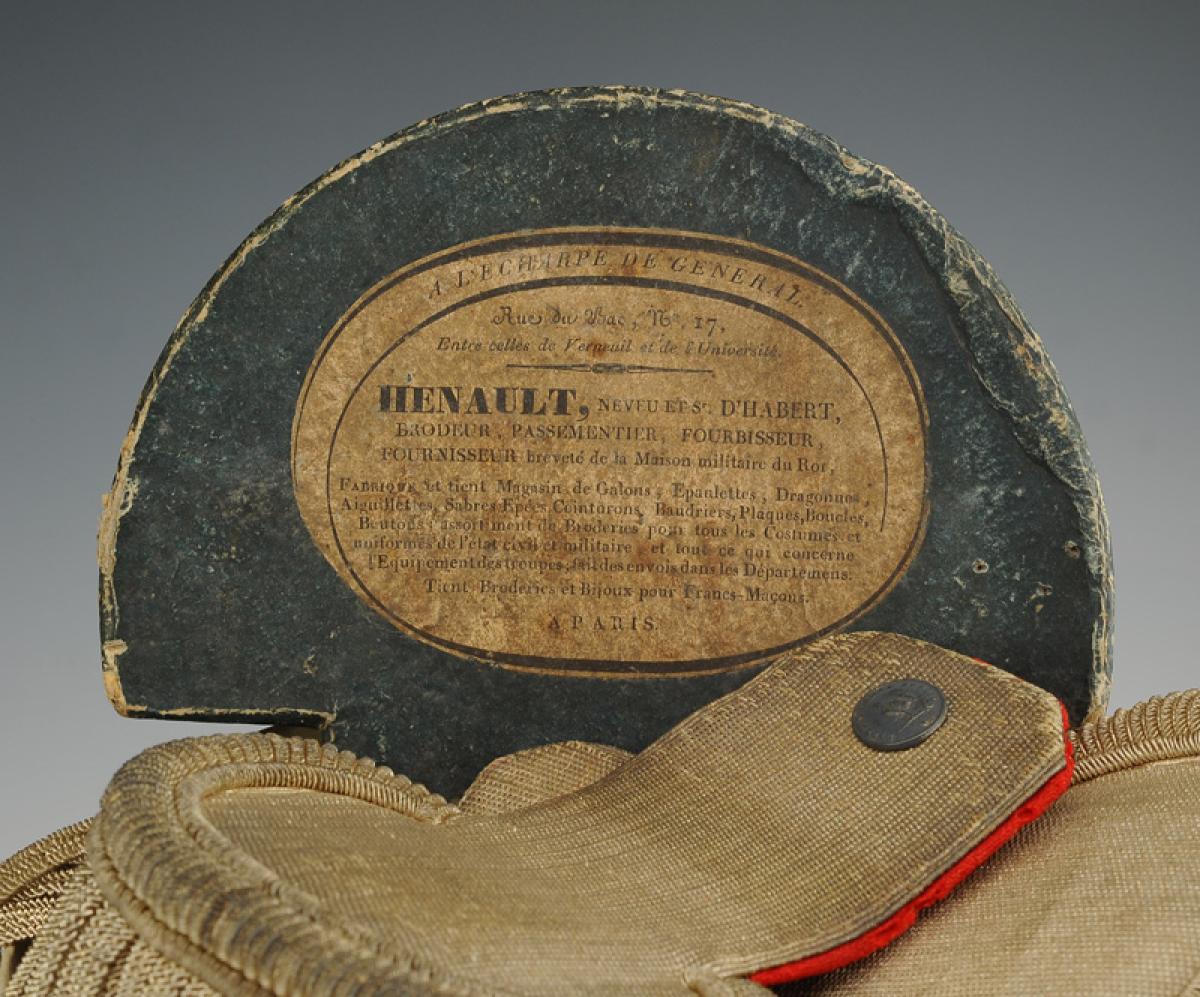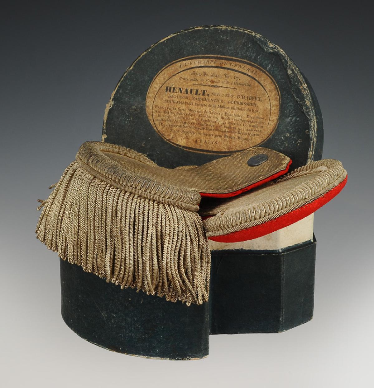 Épaulettes présentées dans la boîte de transport en carton recouvert de papier vert ; sur le couvercle, une étiquette ovale blanche imprimée en noir au nom du fabricant « A L'ECHARPE DE GENERAL / Rue du Bac, N° 17, / Entre celles de Verneuil et de l'Université. / HENAULT, NEVEU ET Sr D'HABERT, ... ».