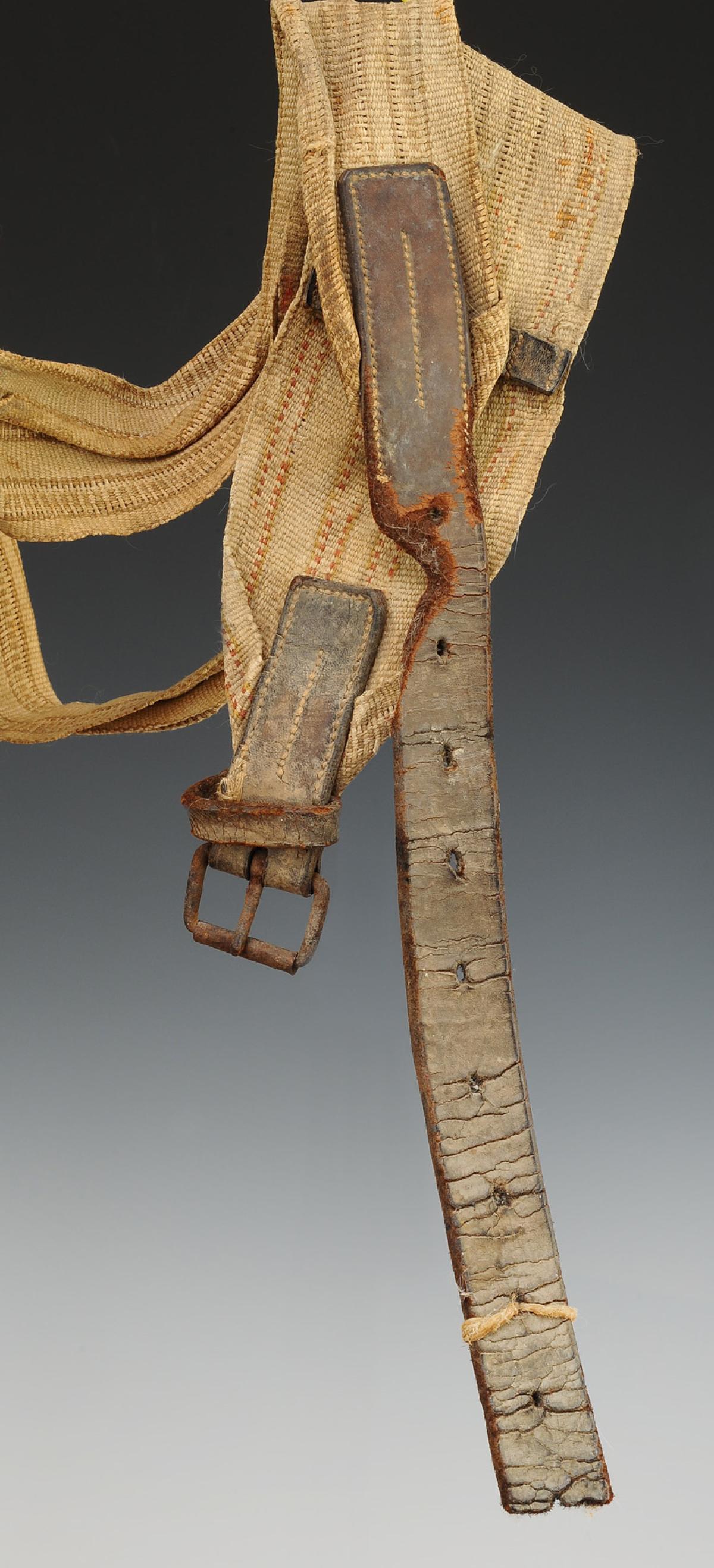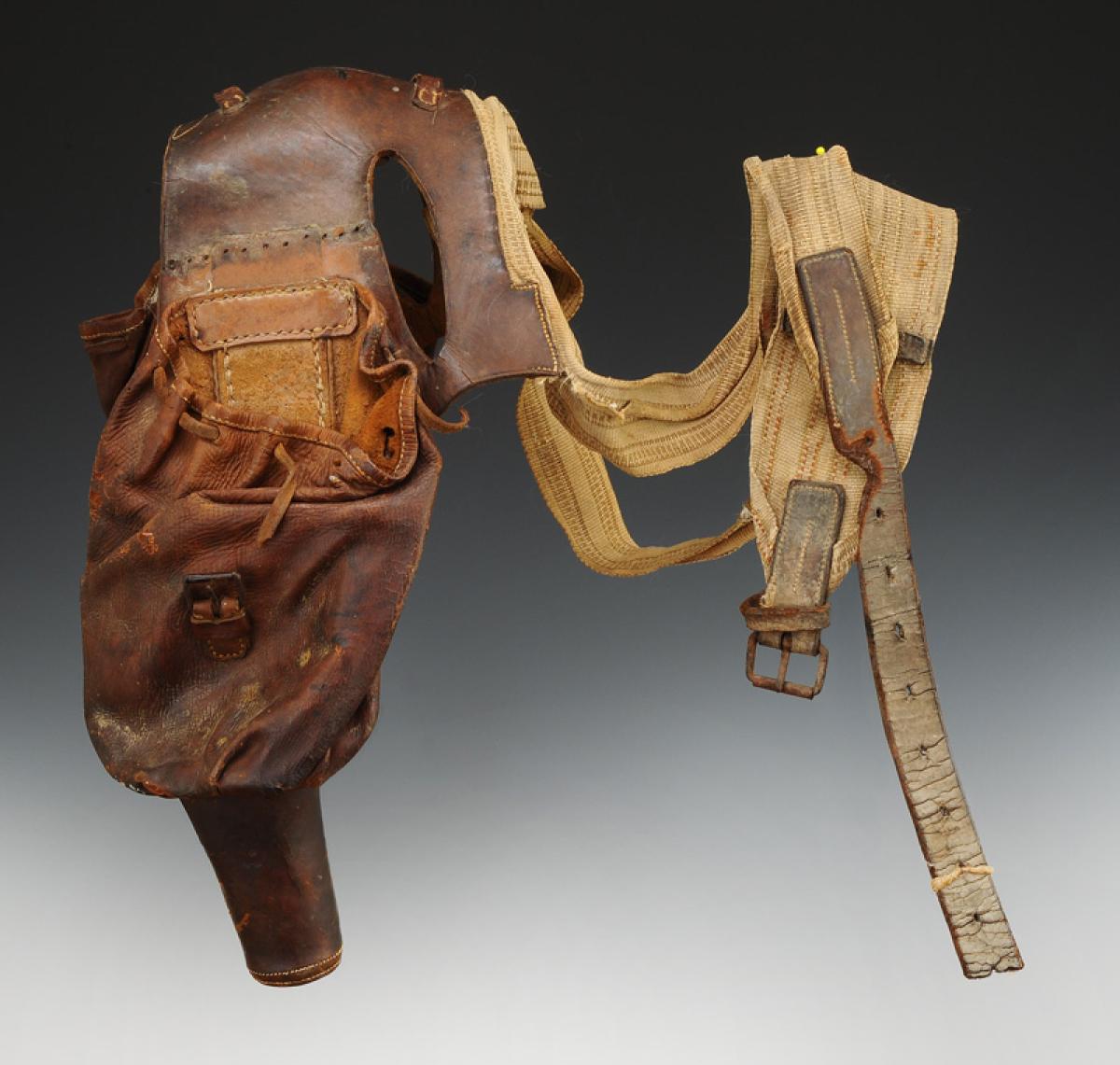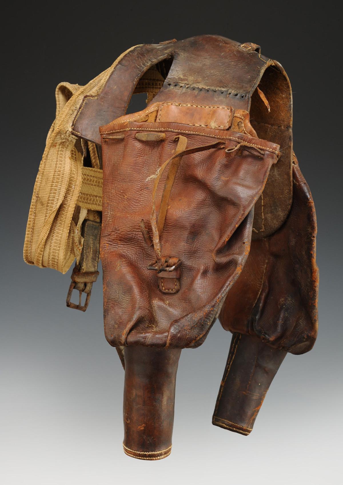En cuir brun. Fontes composées d'un sabot en bois gainé de cuir de 12 cm de haut et 4,5 cm de diamètre, surmonté d'une poche en cuir souple sur une hauteur d'environ 22 cm, Ø en partie supérieure environ 13 cm, qui se ferme au moyen d'un lacet en partie haute. Fontes reliées entre elles par un cuir avec sangle d'ajustage pour le cheval.