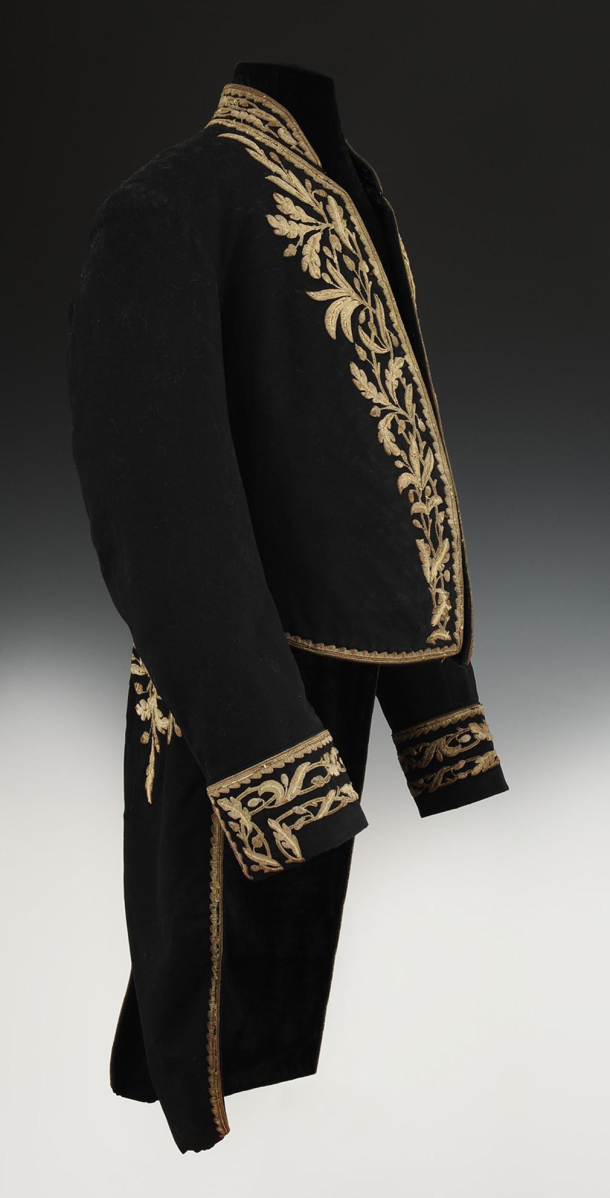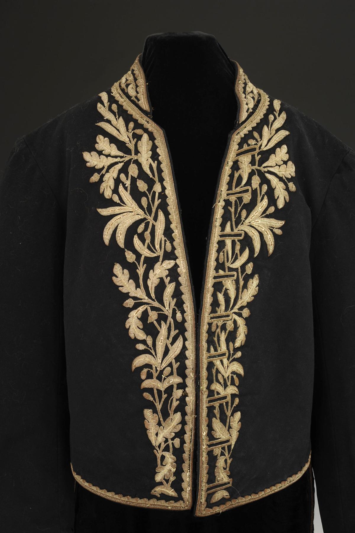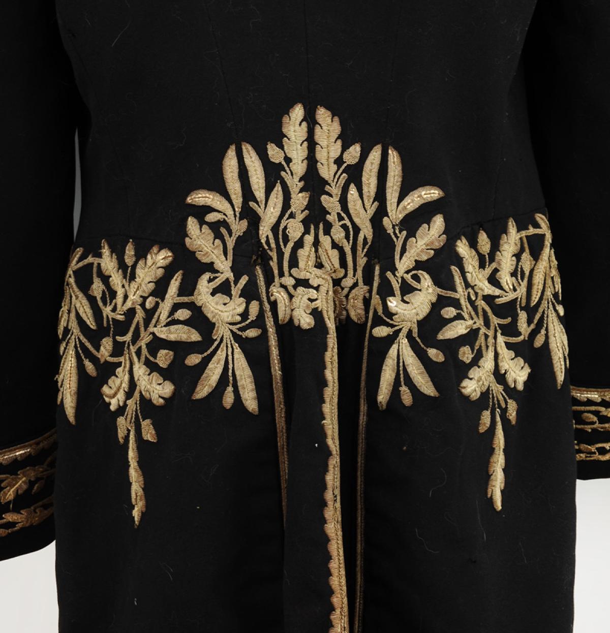 Habit en drap bleu foncé boutonnant à l'avant au moyen de quatre crochets métalliques laqués noir. Bords de l'habit brodés d'une baguette en fils, cannetilles et paillettes d'argent, droite en extérieur et festonnée vers l'intérieur de l'habit. Sur le côté gauche, sont figurées neuf boutonnières. Habit richement brodé à l'avant d'un entrelacs de feuilles de chêne et de laurier. Collet pareillement brodé à l'habit avec baguette d'encadrement identique et entrelacs des deux mêmes branches. Parements brodés de deux rangées de feuilles de chêne et de laurier. Noeud de taille et haut des parements pareillement brodés.