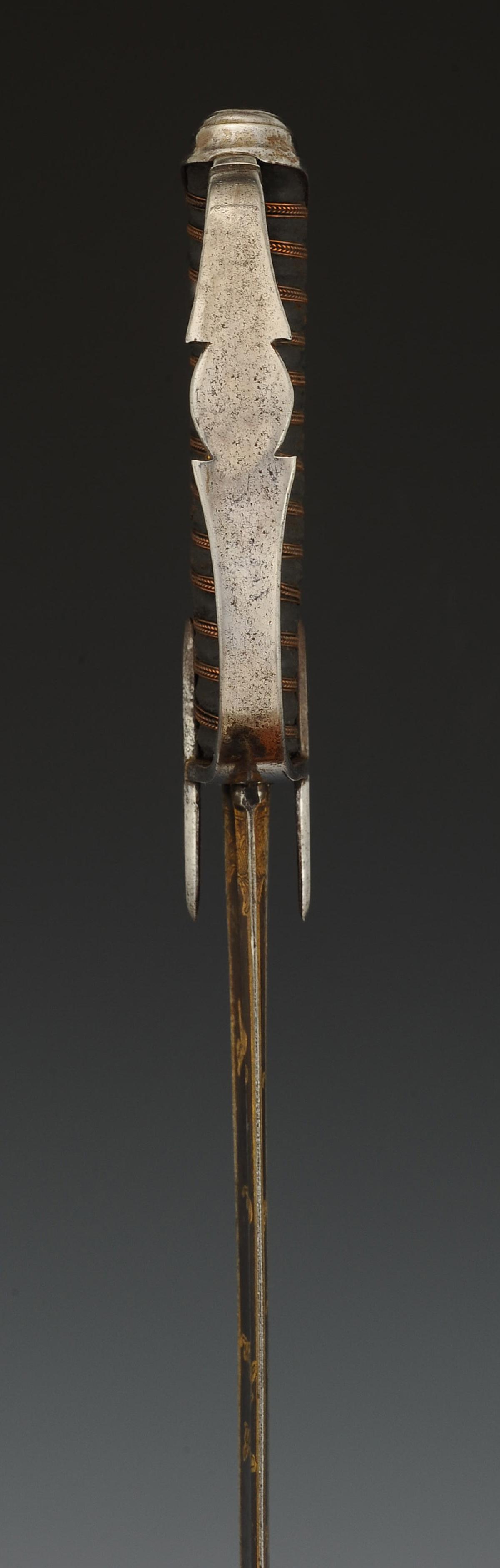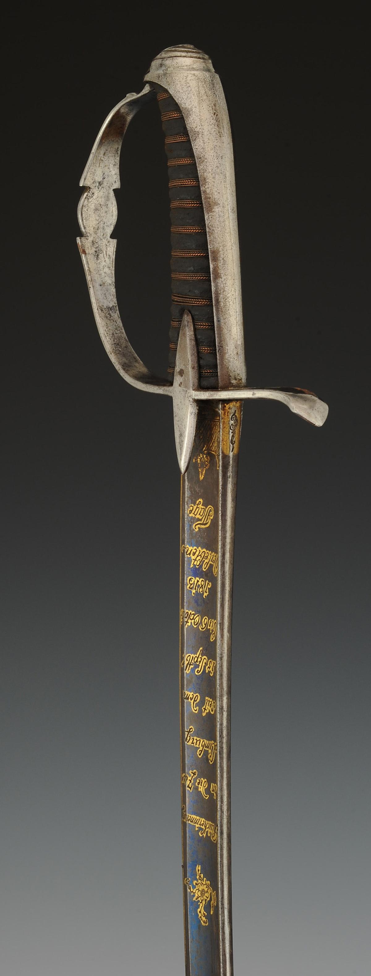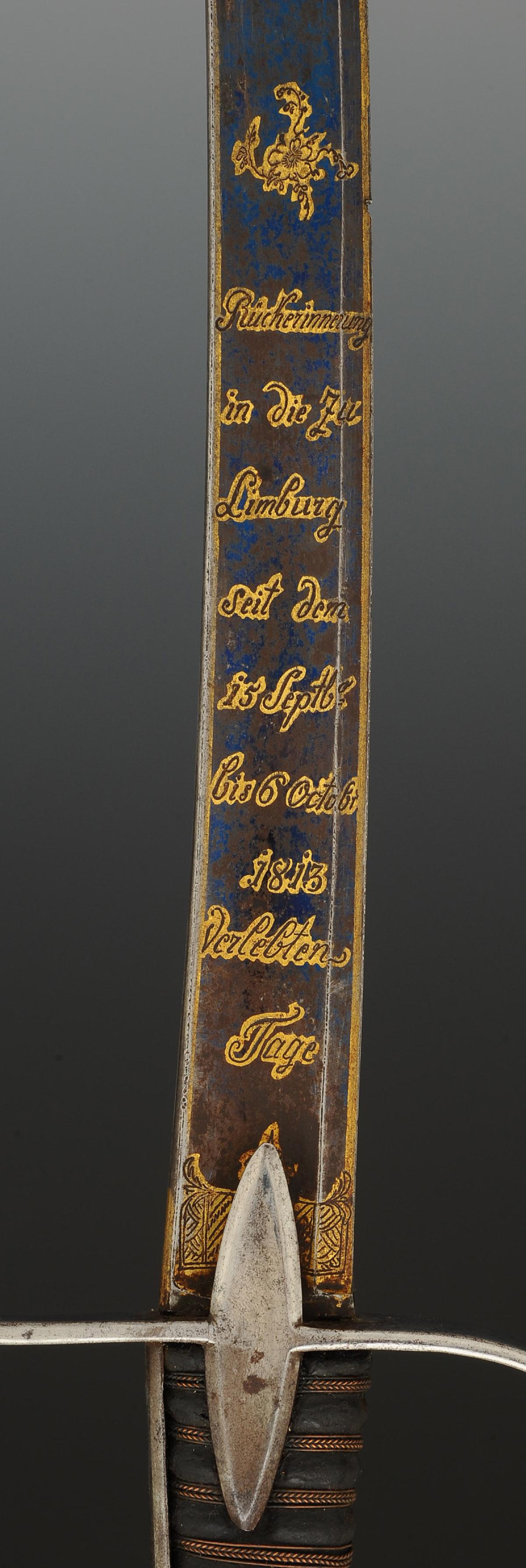 Monture en acier. Garde à une branche. Calotte à longue queue. Poignée en bois gainé de veau noir filigrané cuivre. Lame courbe à pans creux, gravée et dorée sur son premier tiers sur la face avant « Rücherinnerung in die zu Limburg seit dem 15 Septb. bis 6 Octobr. 1813 Verlebten Tage », en mémoire des journées passées à Limburg du 15 septembre au 6 octobre 1813, avec décor floral sur fond bleui, et sur sa face arrière gravée et dorée « Heinrich Huÿssen in Essen » avec décor floral et trophée militaire sur fond bleui. Longueur de la lame 78,5 cm.