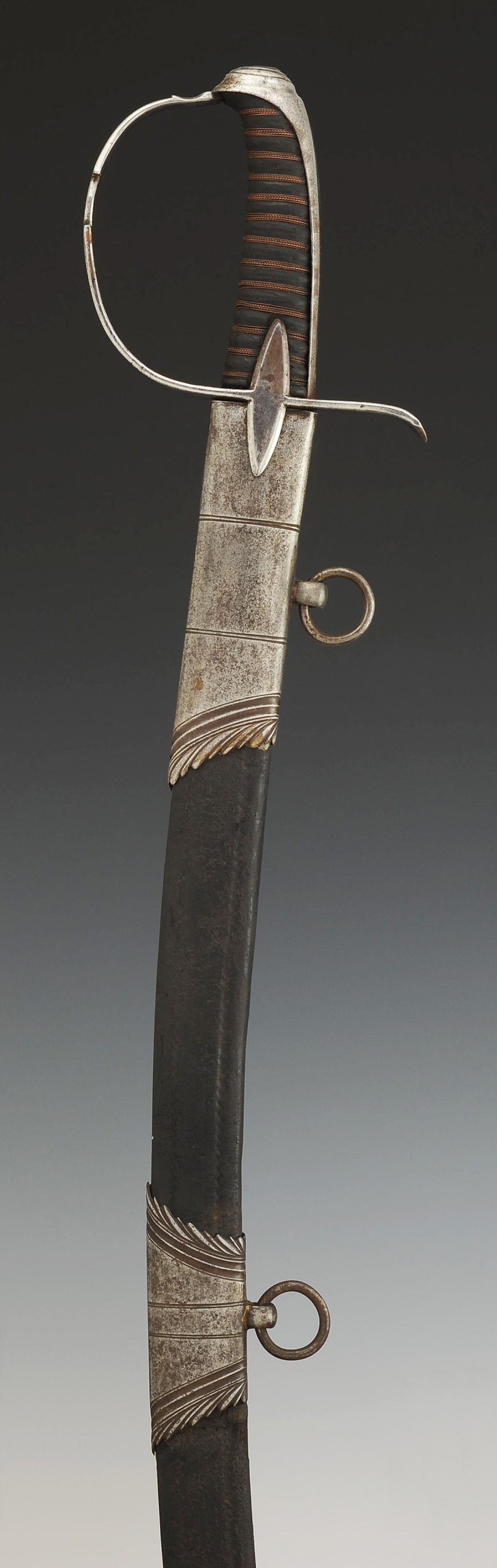 Fourreau en bois gainé de veau verni noir à trois garnitures d'acier décorées aux traits avec bords en forme de feuilles, anneaux de bélière en acier. Bout du fourreau avec dard découpé en lyre.