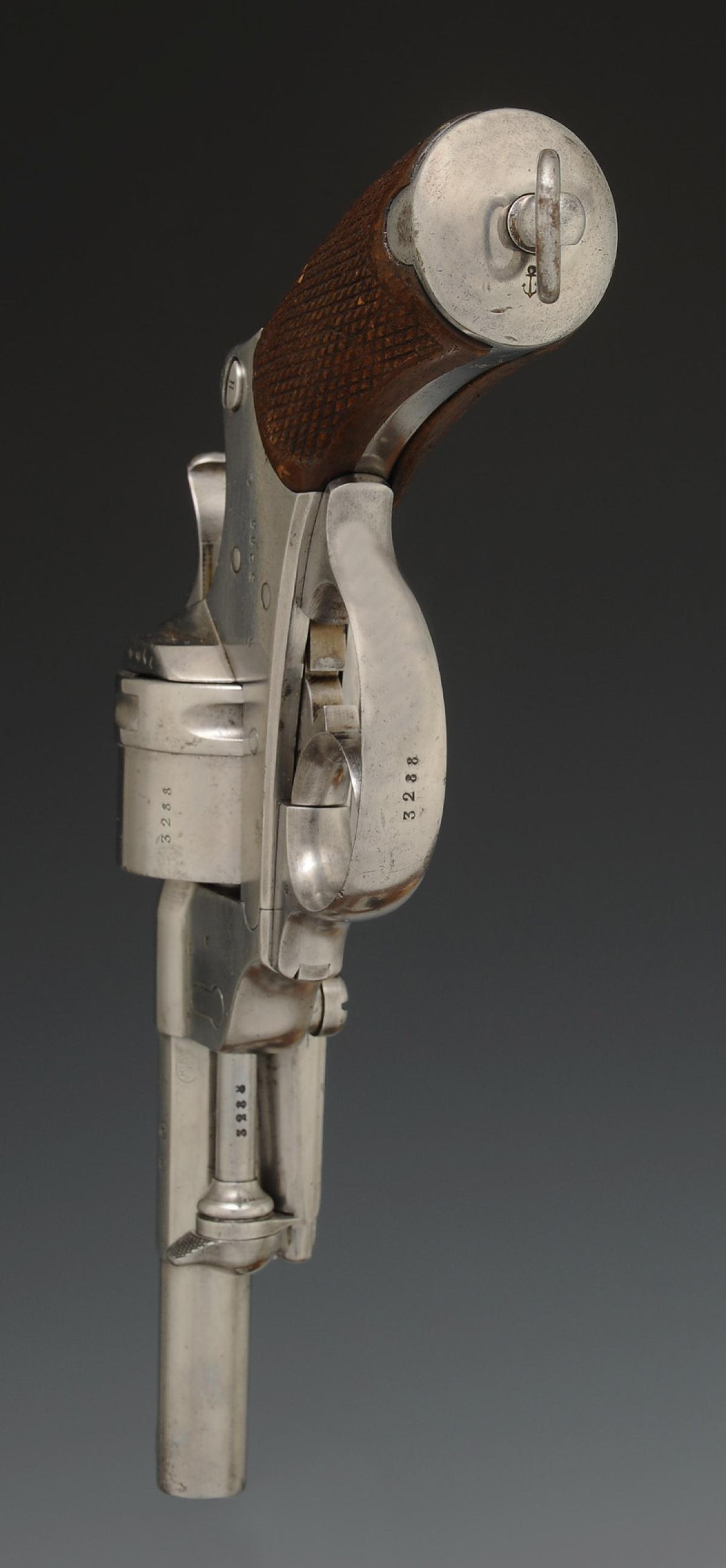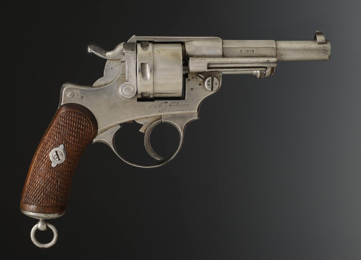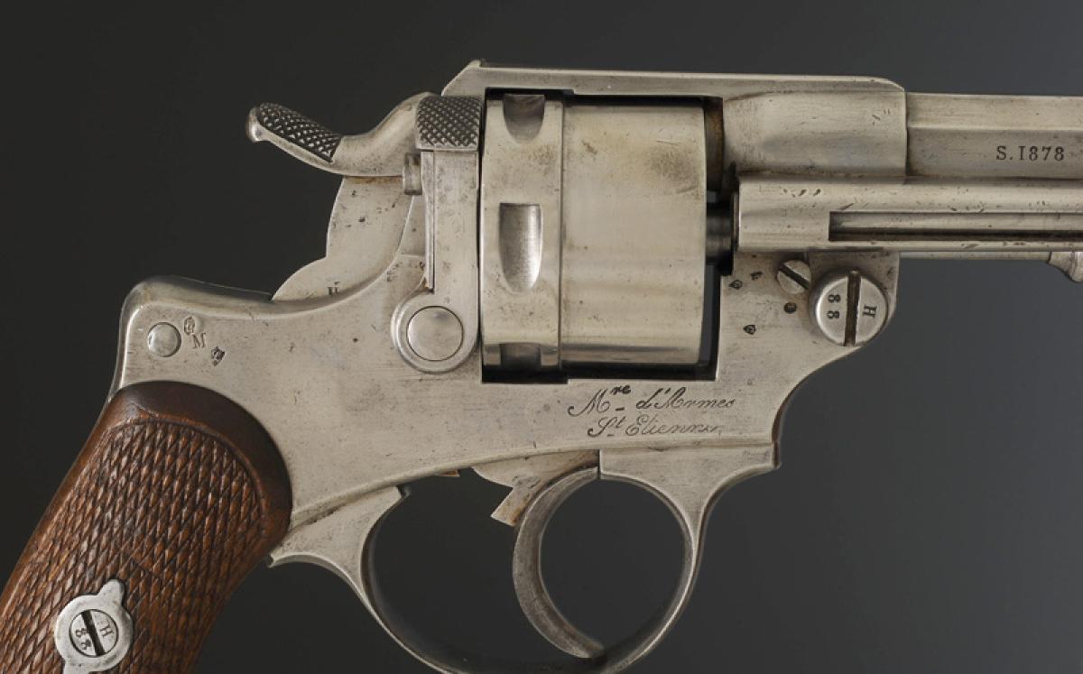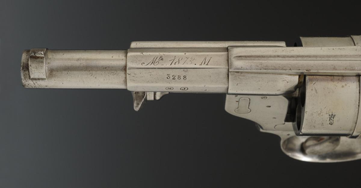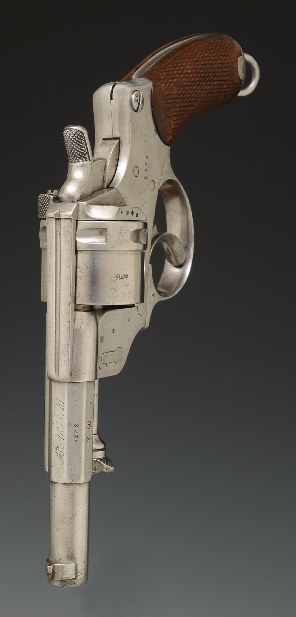 Partie antérieure du canon tronconique portant le guidon, partie centrale à huit pans, gravé sur le pan supérieur « Mle 1873 M (modifié) » et sur les autres pans les initiales « M J » et un marquage « S 1878 ». Du pan intermédiaire droit se détache la partie antérieure du porte-baguette. Barillet percé de six chambres fraisées pour le calibre 12 mm placées symétriquement autour d’un canal cylindrique dans lequel est engagé l’axe du barillet. Anneau de calotte en fer avec pivot et goupille. Carcasse gravée « Mre d'Armes St Étienne ». Divers poinçons de la Manufacture d'Armes de Saint Étienne sur le barillet et la carcasse ainsi que « M ». Toutes les parties sont pareillement matriculées « 3288 », la calotte est poinçonnée à l'ancre de marine.