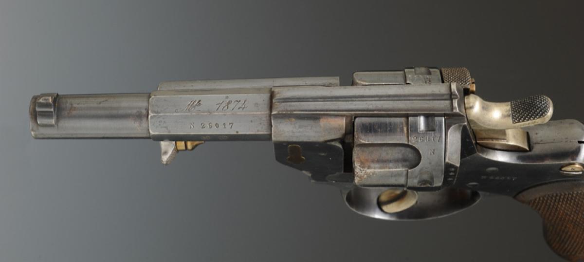 Partie antérieure du canon tronconique portant le guidon, partie centrale à huit pans, gravé sur le pan supérieur « Mle 1874 », poinçonné sur les pans latéraux des initiales « M T », du matricule « N 26017 » et du marquage « 1879 ». Du pan intermédiaire droit se détache la partie antérieure du porte-baguette. Barillet percé de six chambres, à gorges creusées sur les surfaces extérieures placées symétriquement autour d’un canal cylindrique dans lequel est engagé l’axe du barillet. Anneau de calotte en fer avec pivot et goupille. Carcasse gravée « Mre d'Armes St Étienne ». Poinçons de la Manufacture d'Armes de Saint Étienne sur le barillet et la carcasse.