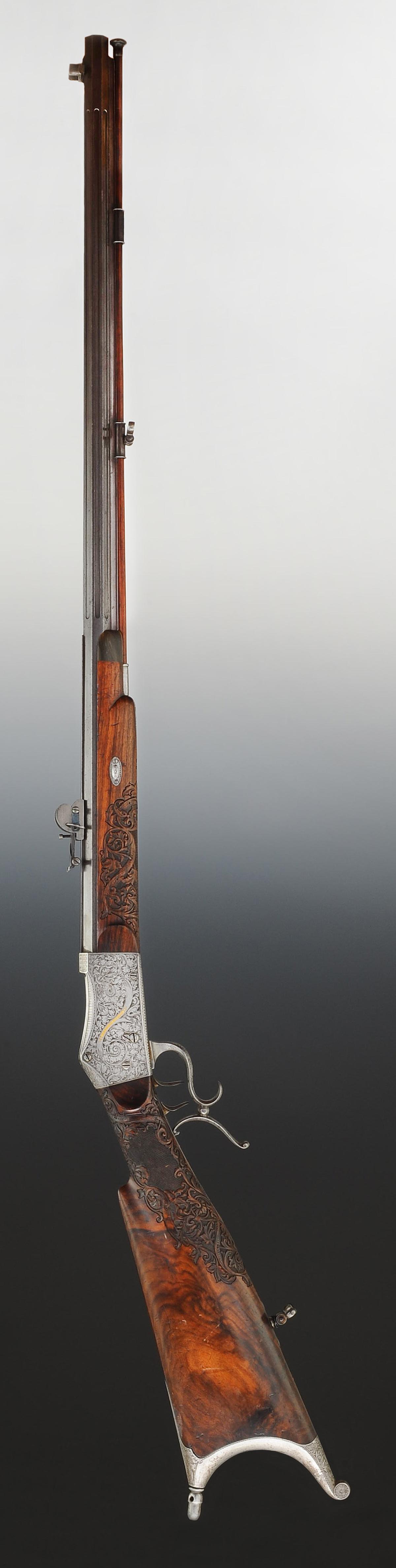 Monture à fût court en noyer, finement sculptée de décor floral et de rinceaux, quadrillage au niveau de la prise en main. Plaque de couche à crocs en acier gravé de feuillages à terminaison d'un gland en partie supérieure et s'enroulant sur lui-même en partie inférieur et gravée d'une fleur. Baguette en bois avec tête en acajou.