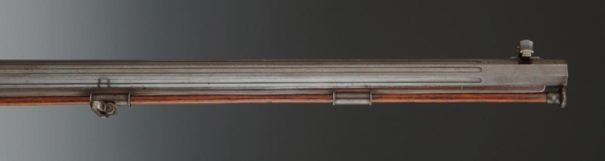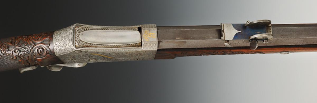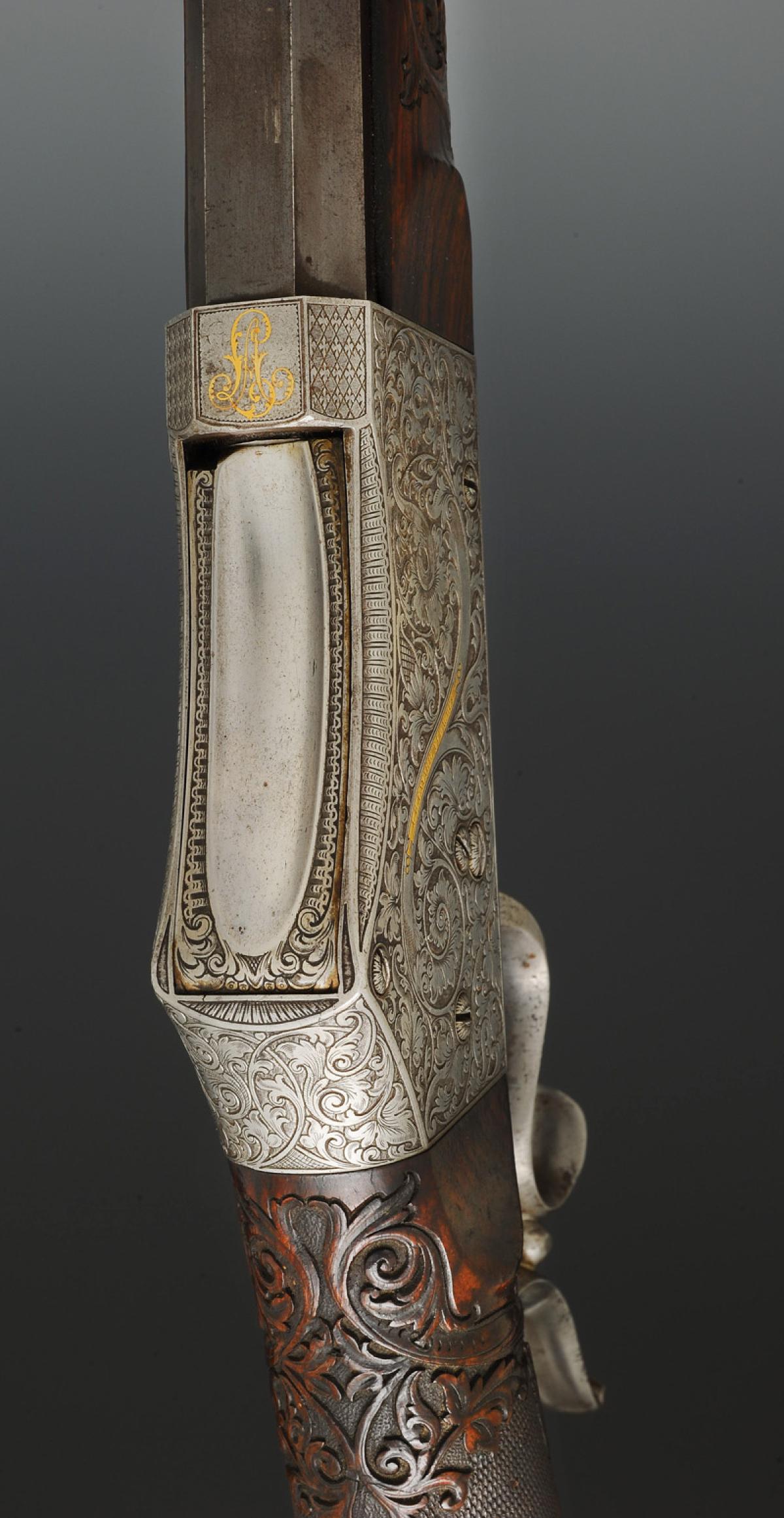 Canon octogonal bronzé, longueur 82 cm, 93 cm avec le bloc de culasse, calibre 10,4 mm, type Vetterli. Hausse réglable sur toboggan, guidon fixe sur queue d'aronde. Bloc de culasse en acier richement gravé de corolles de feuillages et décor floral, signé sur un ruban doré « J.E. FAYARD. Et. D'ARMES » d'un côté, et de l'autre côté « À St ETIENNE ». Partie supérieure monogrammée « L A » en lettres dorées. Système à bloc tombant s'ouvrant en basculant le levier de sous-garde. Sous-garde avec repose-doigt.