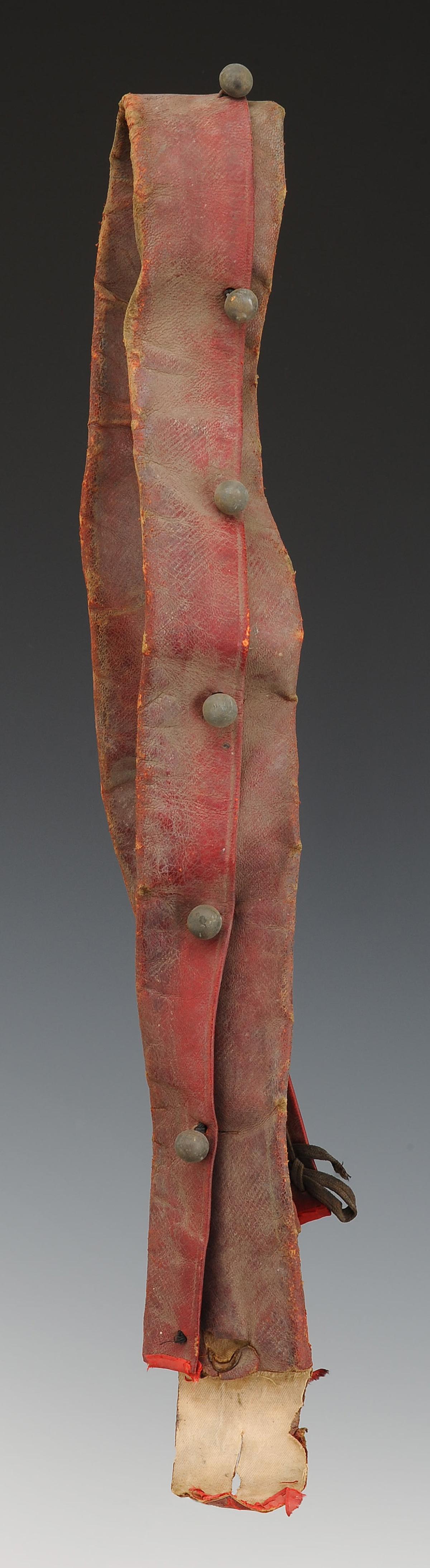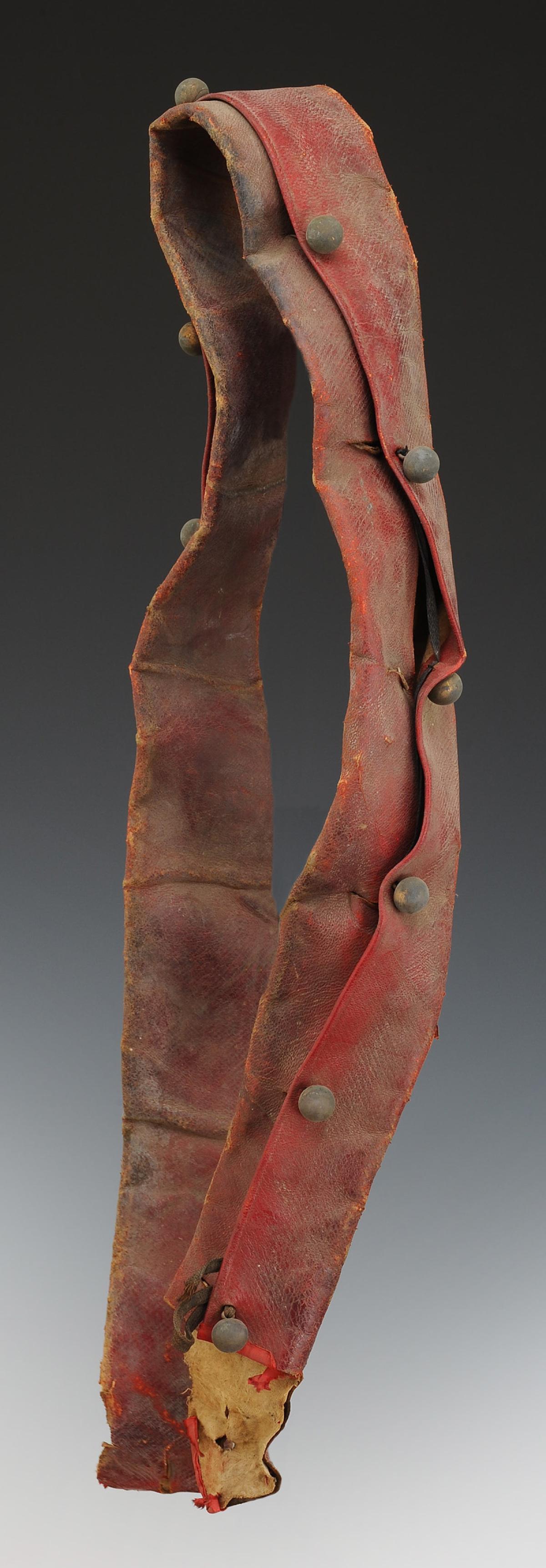 Banderole en cuir ciré bordeaux, largeur 6 cm, garnie de 13 boutons grelots en laiton.