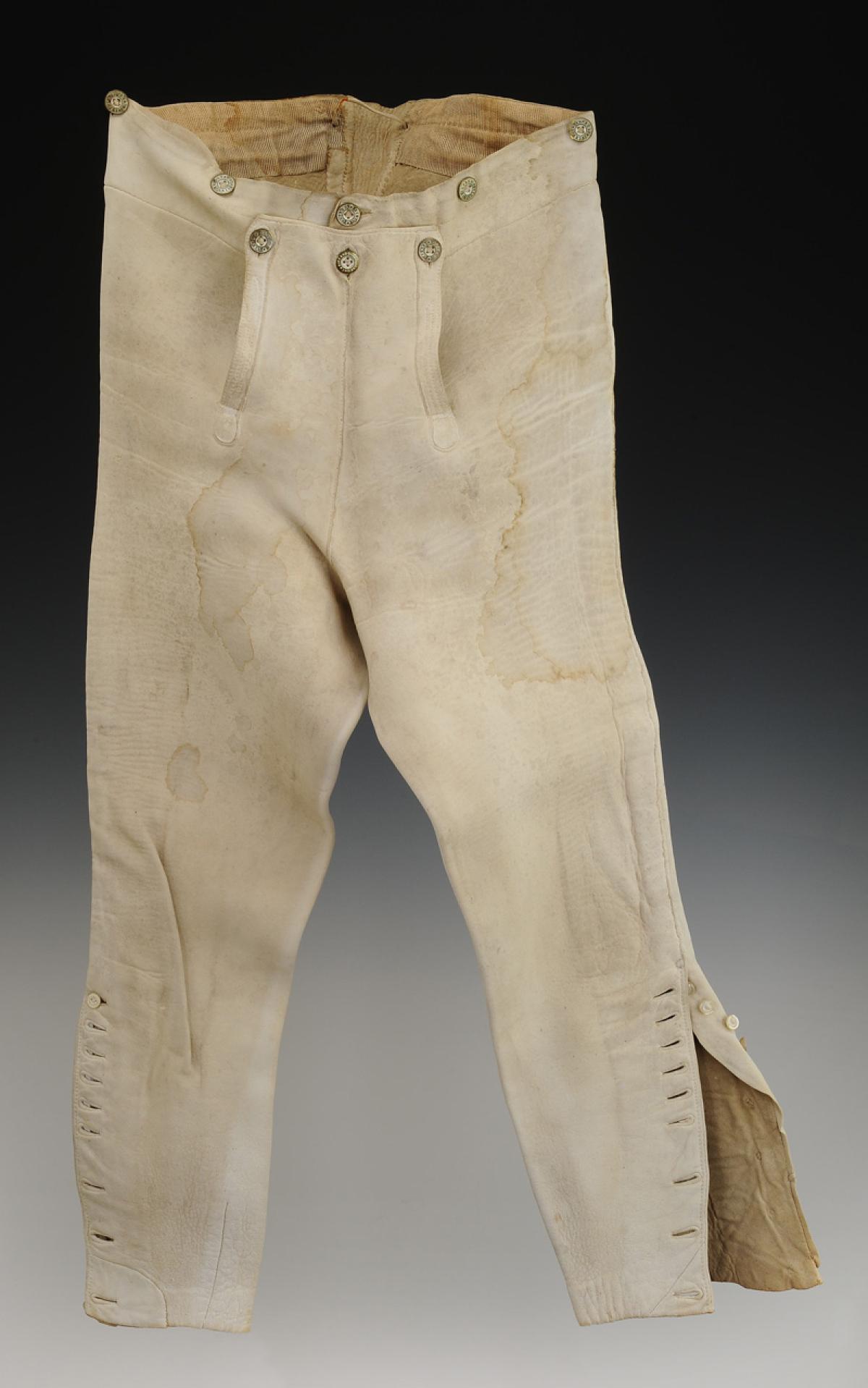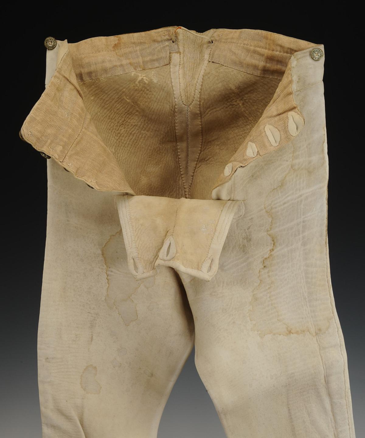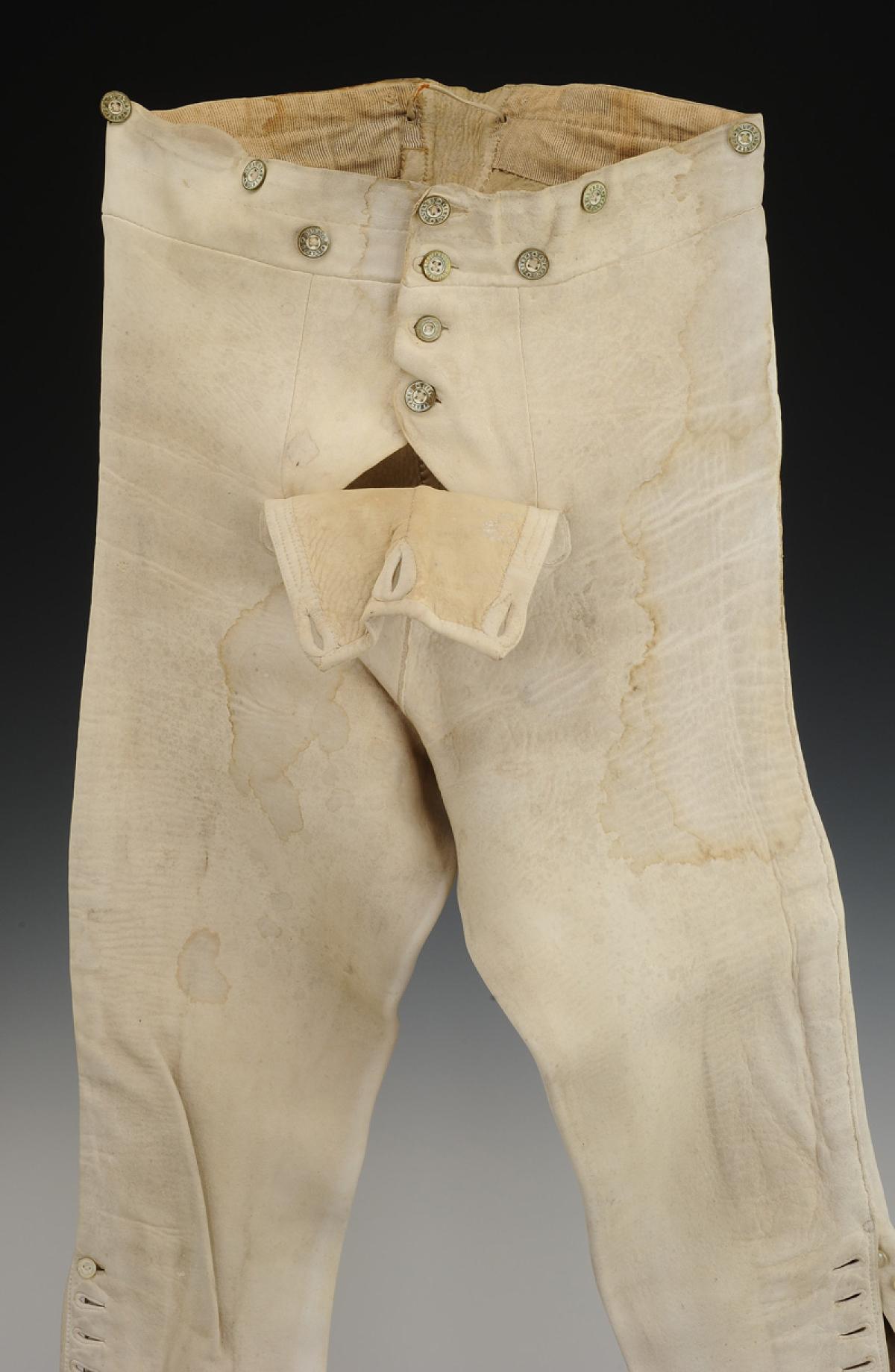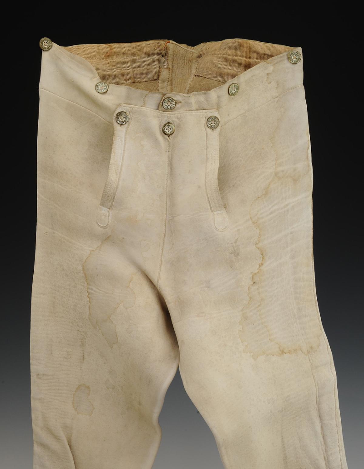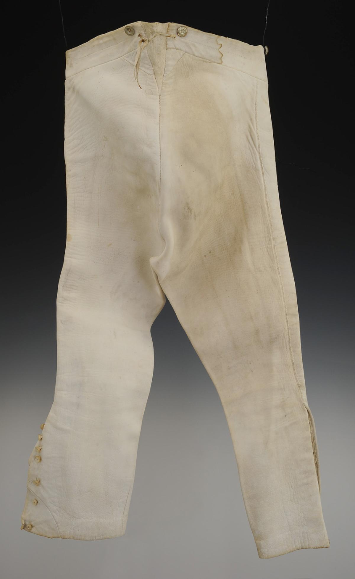 Culotte en veau blanchi, garnie à la ceinture de boutons en laiton marqués « ALFRED PARIS ». Quatre boutons permettent le boutonnage de la braguette, trois pour le pont (dont un commun avec ceux de la braguette), six pour les bretelles.