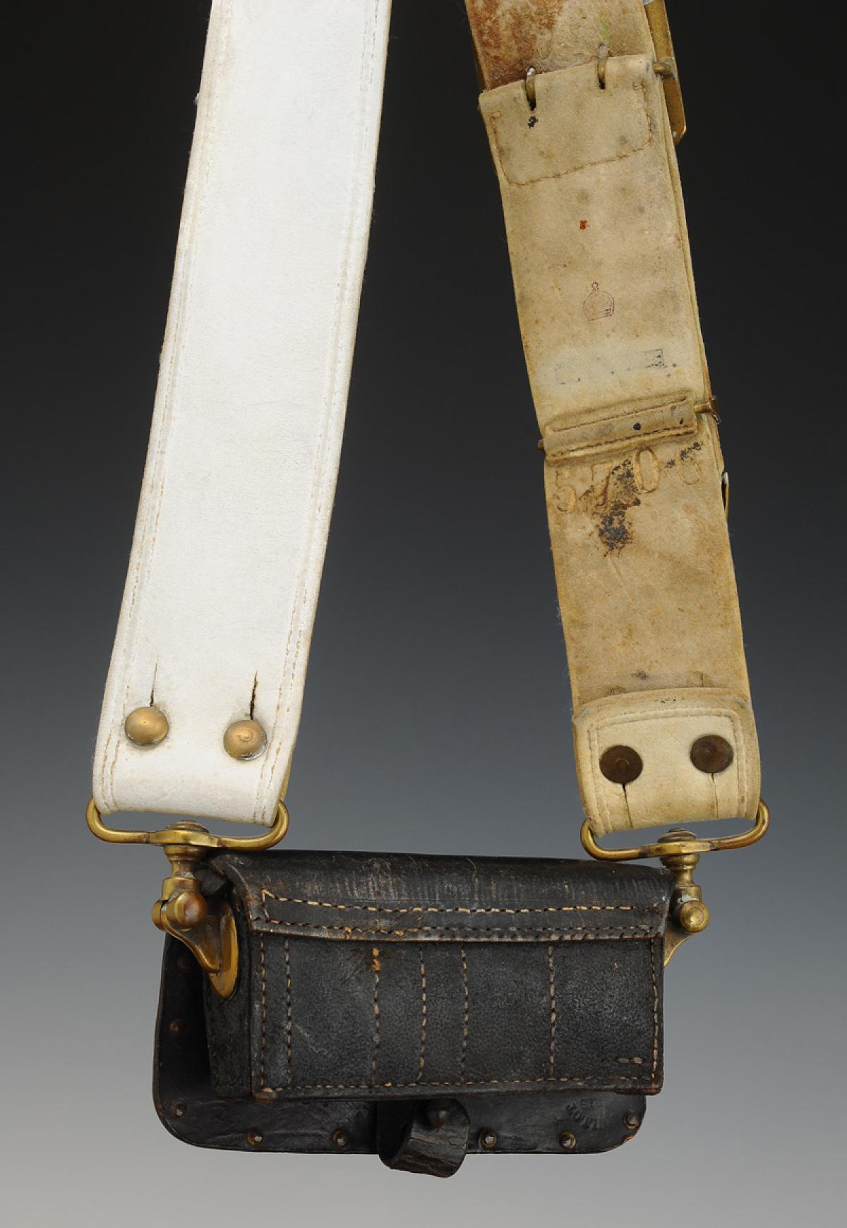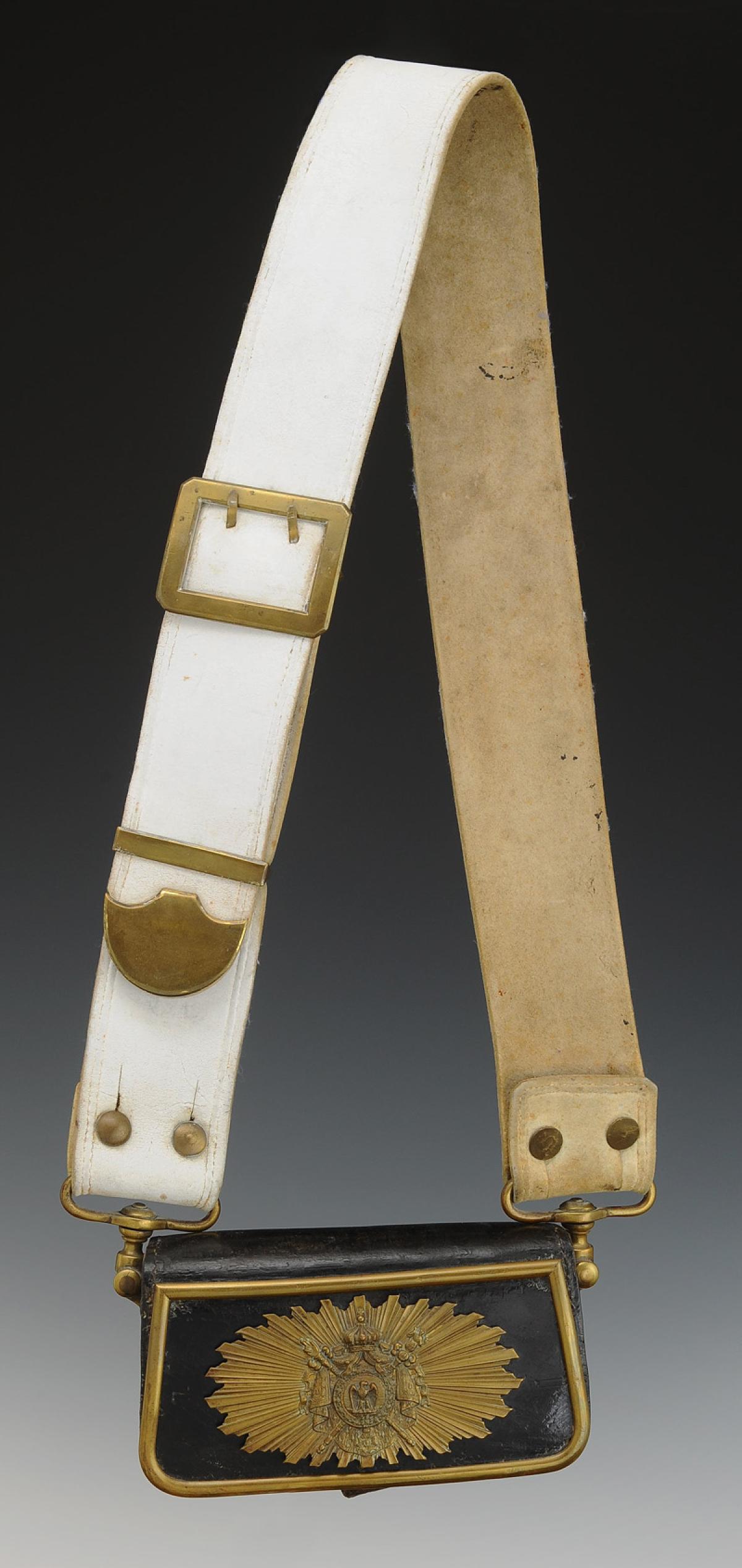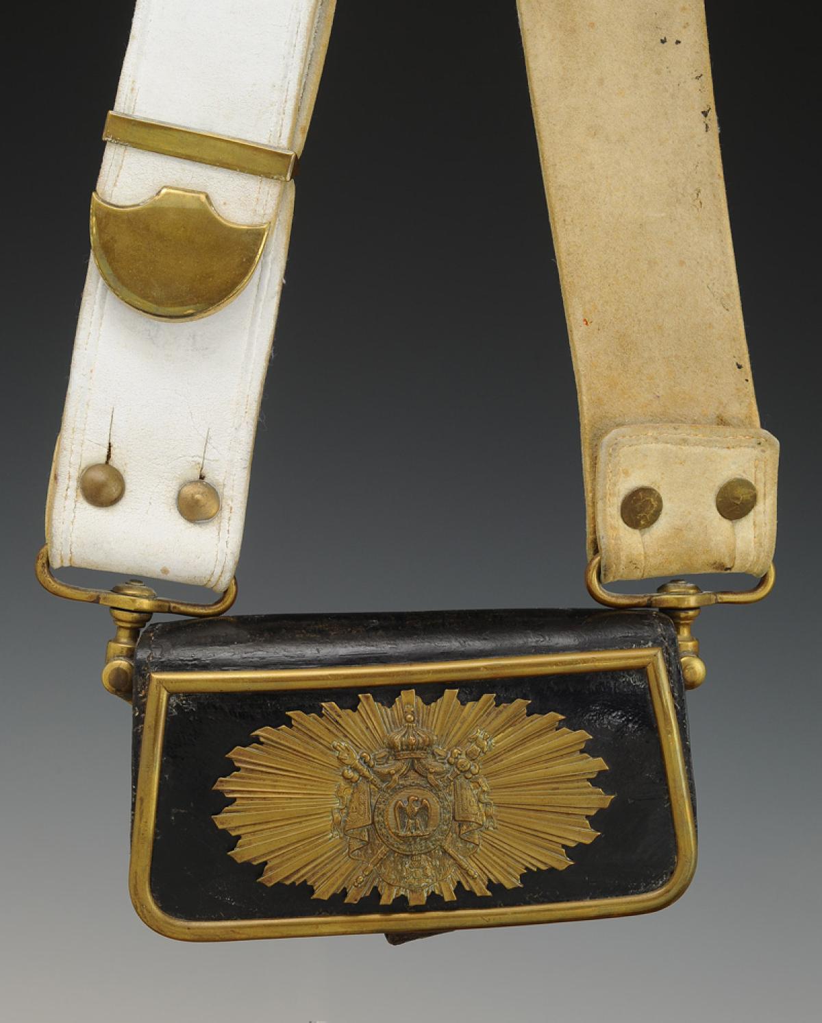 Coffret en cuir verni noir, largeur 15 cm, H 8 cm, profondeur 4 cm. Flancs latéraux en cuir garnis d'attaches de suspension en laiton. Pattelette en cuir verni noir, largeur en partie basse 18 cm, largeur en partie haute 17,5 cm, H 9,5 cm, elle est encadrée d'un jonc en laiton et décorée en son centre d'une plaque en laiton découpé et estampé aux grandes armes impériales sur fond de soleil rayonnant, H de la plaque 7 cm x 12,5 cm ; elle est marquée à chaud « GODILLOT / PARIS », datée de 1867 « 67 », du 1er régiment « 1 » et matriculée « 125 ».